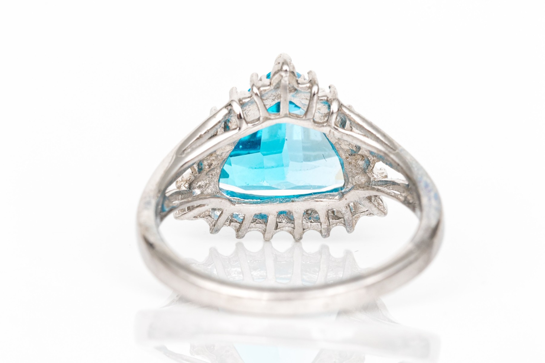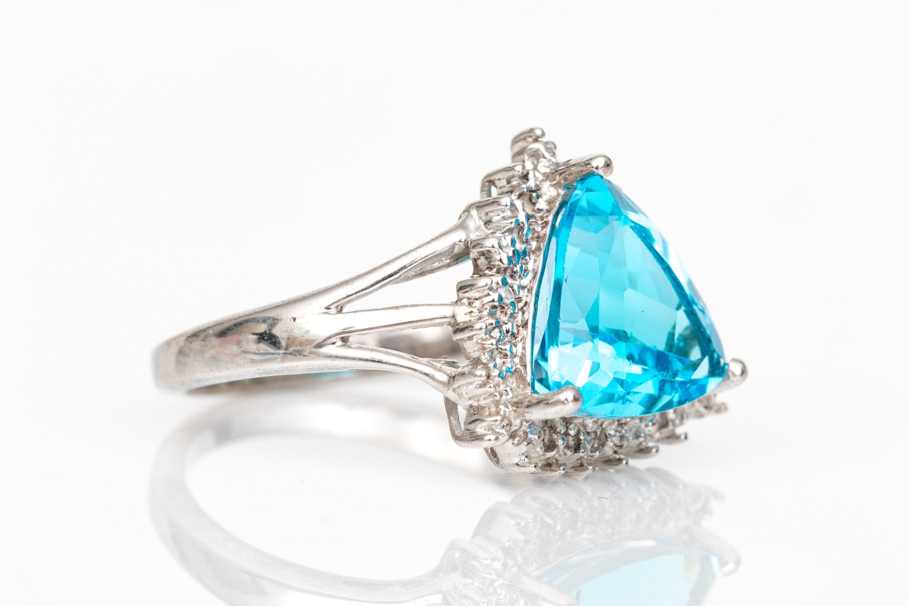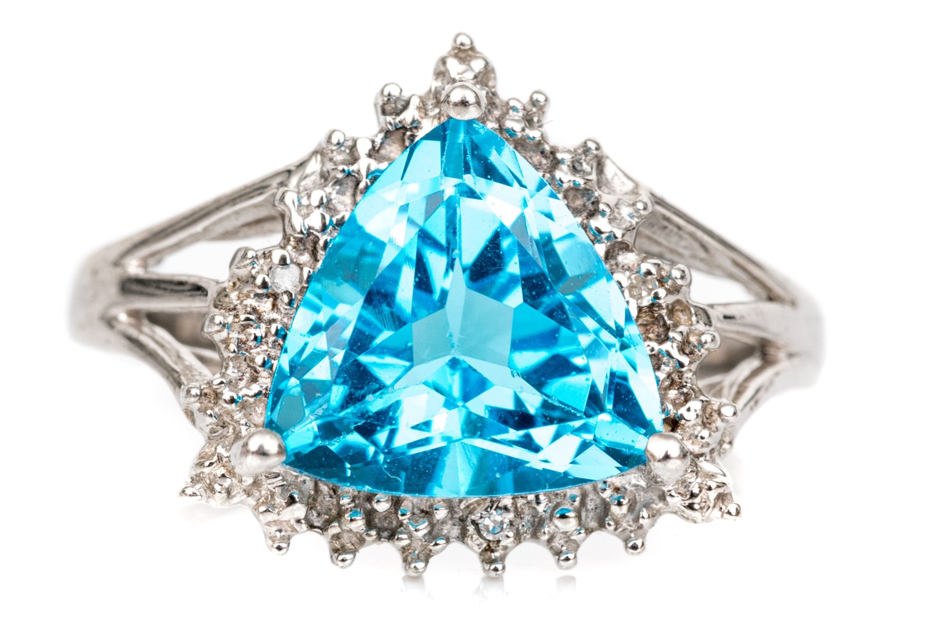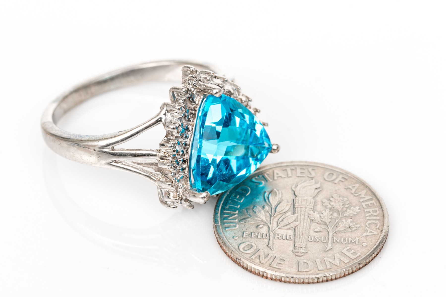 Sterling silver striking trillion blue topaz ring, app. 3.09 CTS, size 8.25, with accent diamonds, app. 0.01 TCW