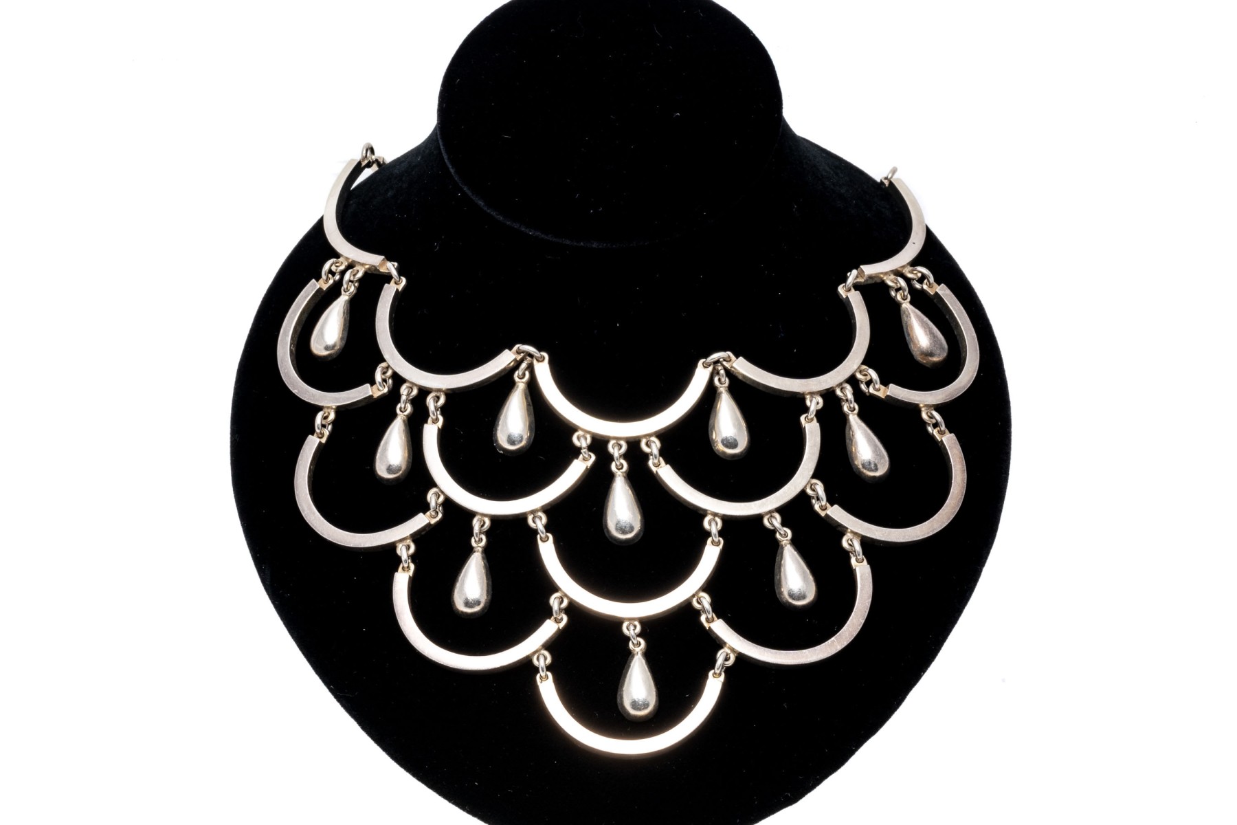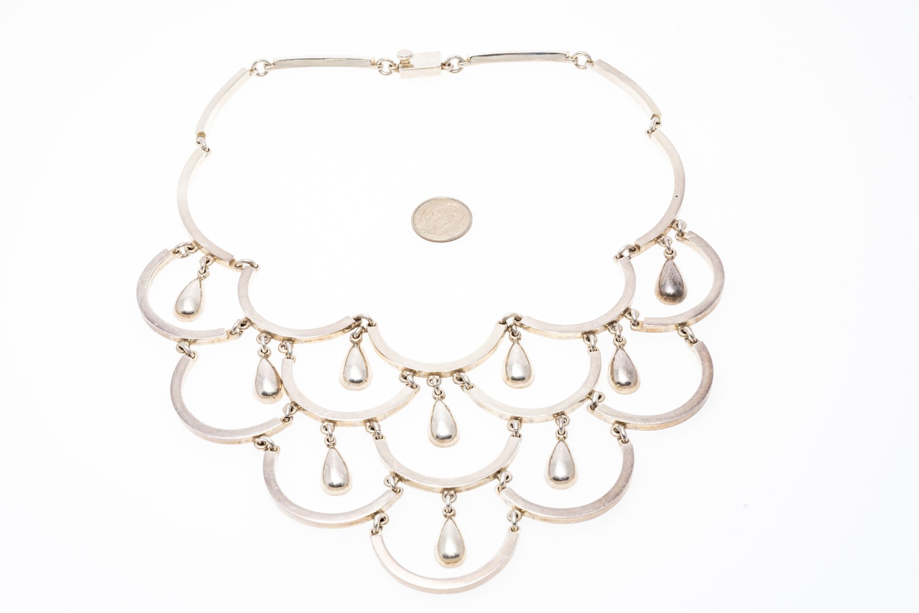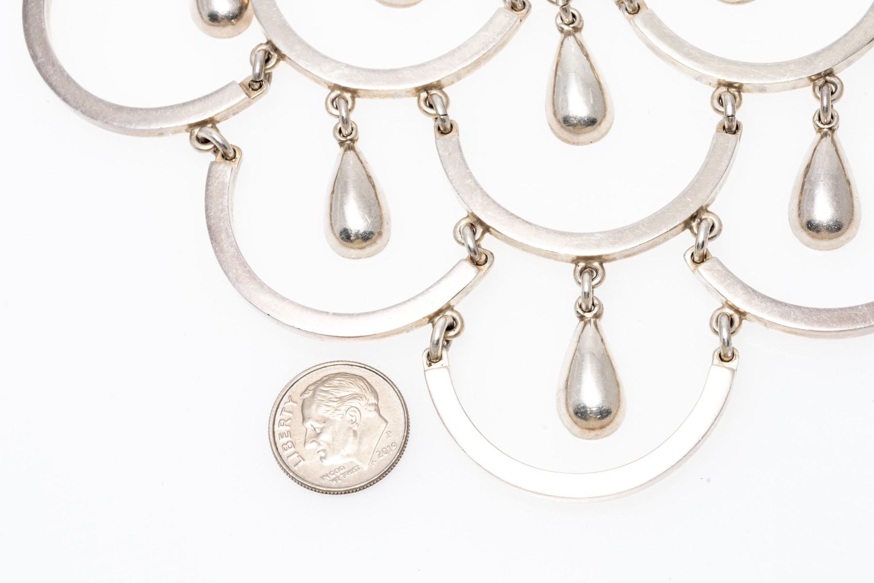 Sterling silver stunning scalloped chandelier style bib choker necklace. The necklace is finished by a box style clasp