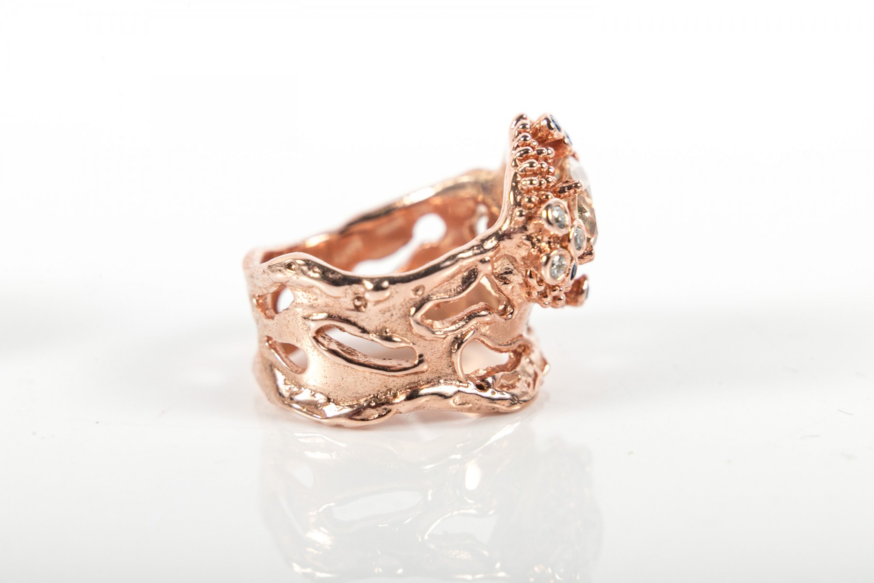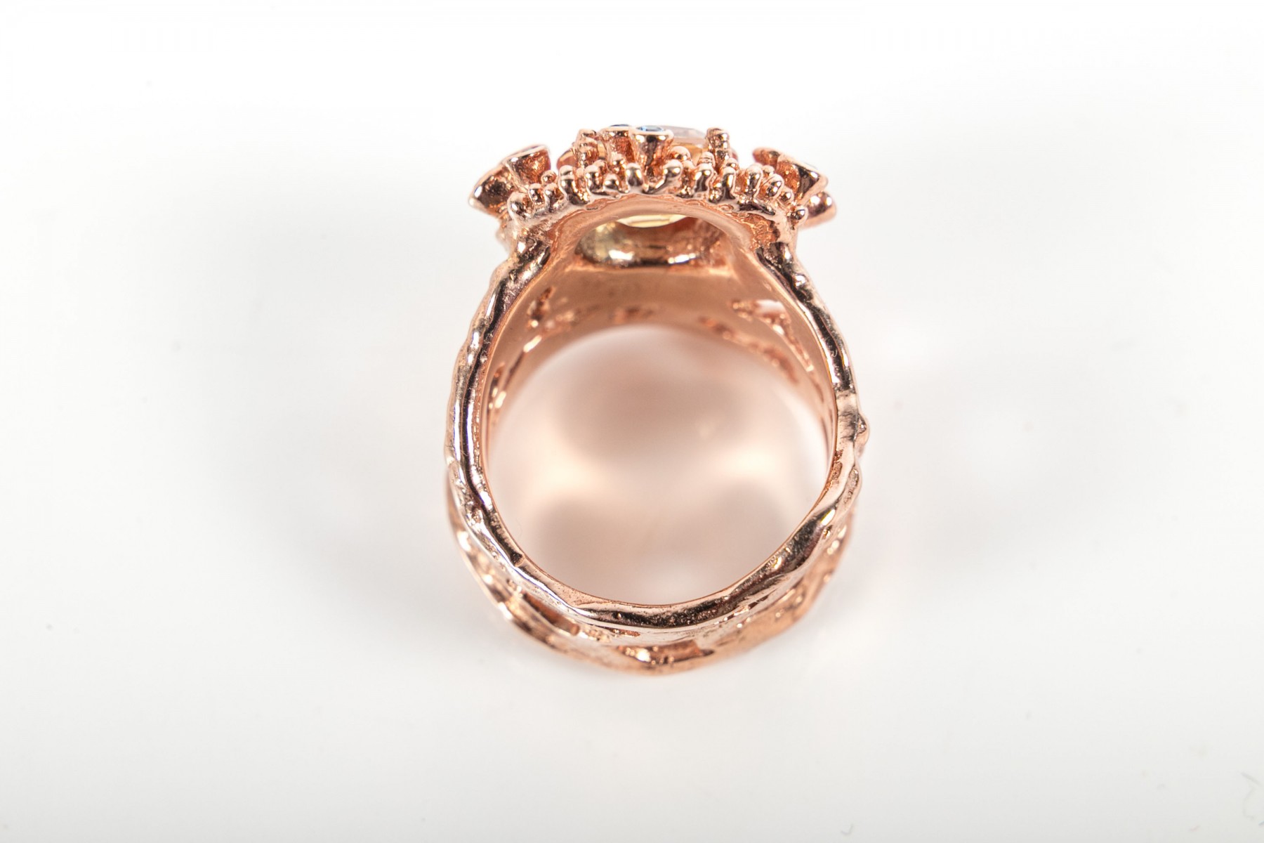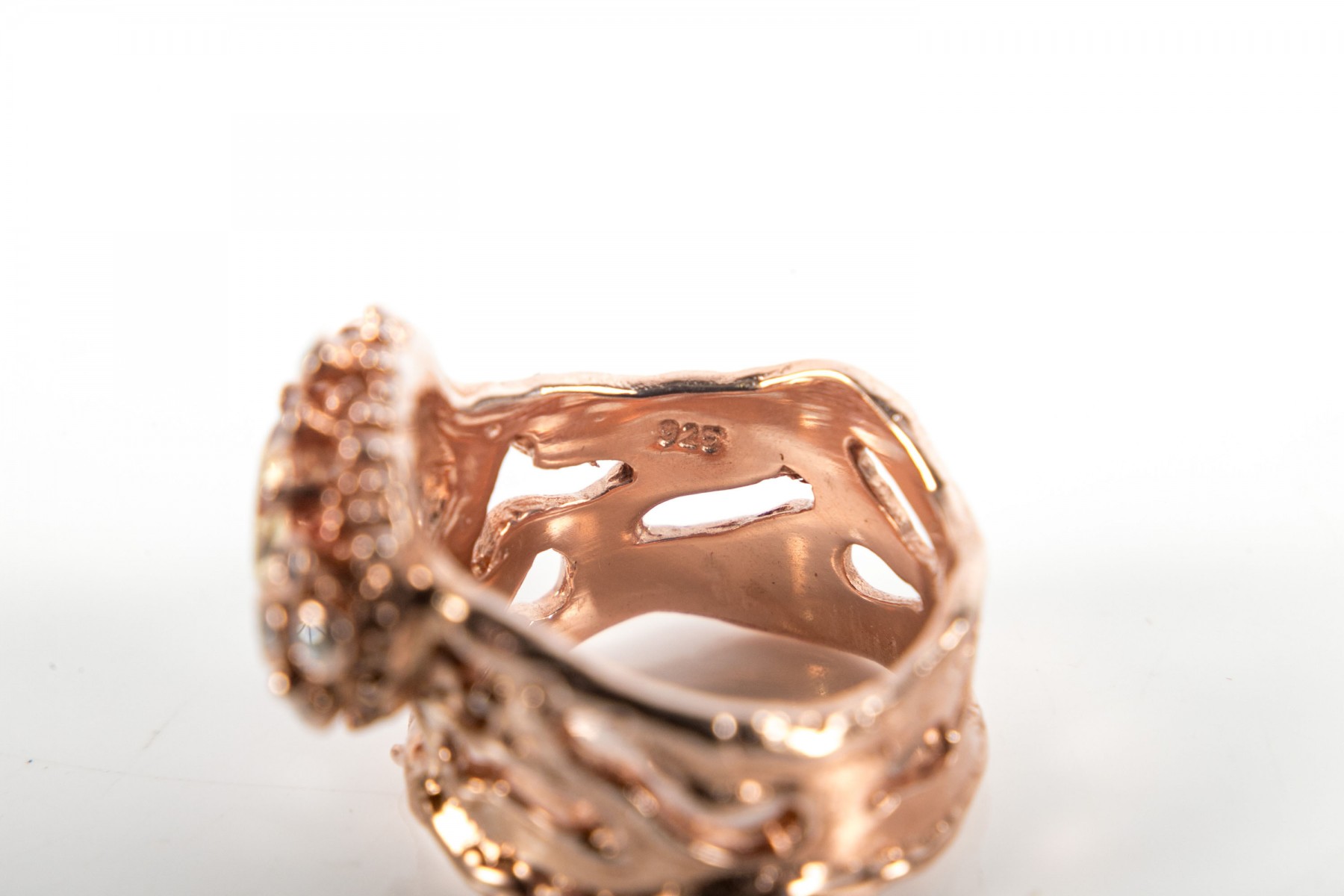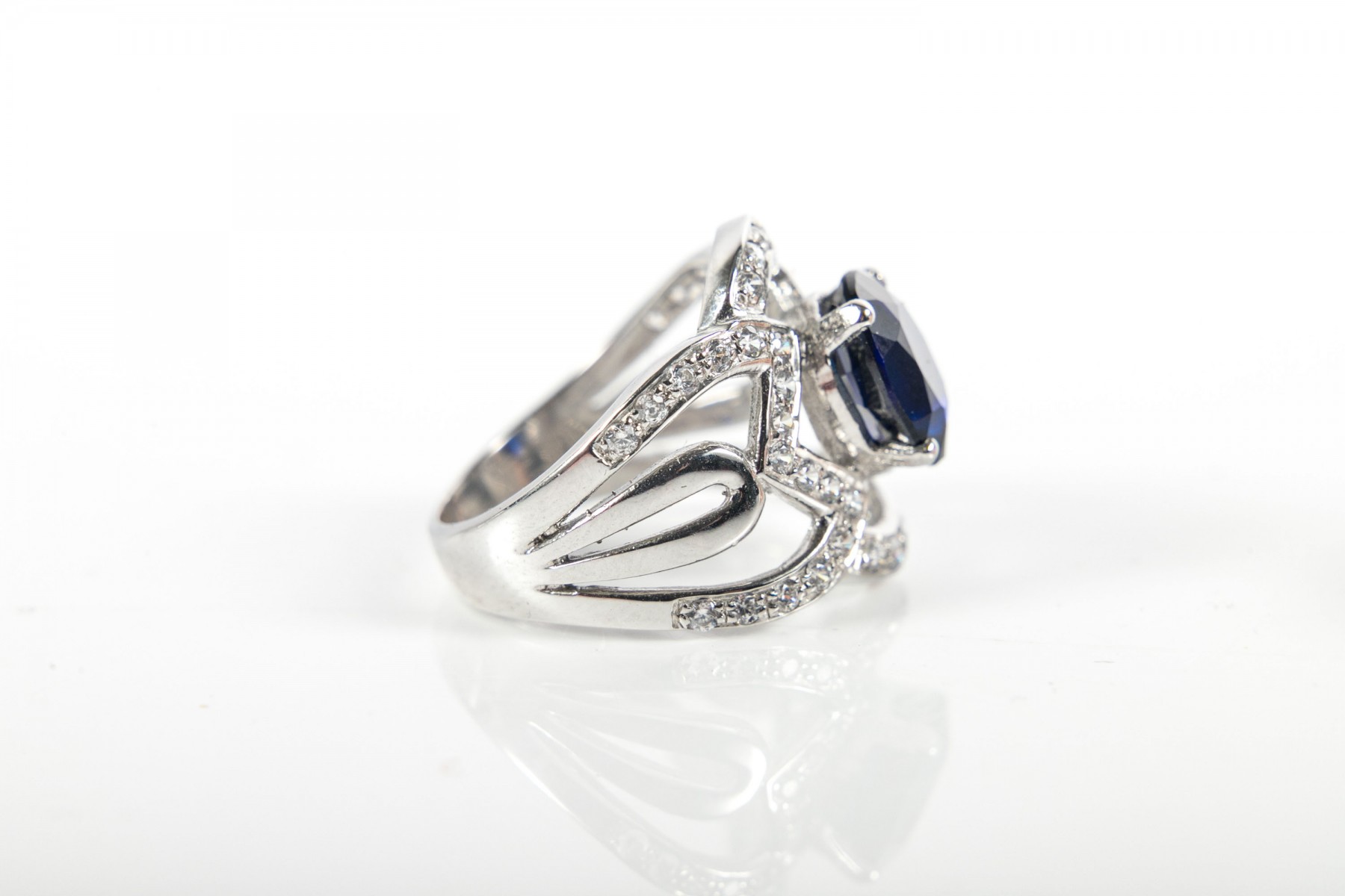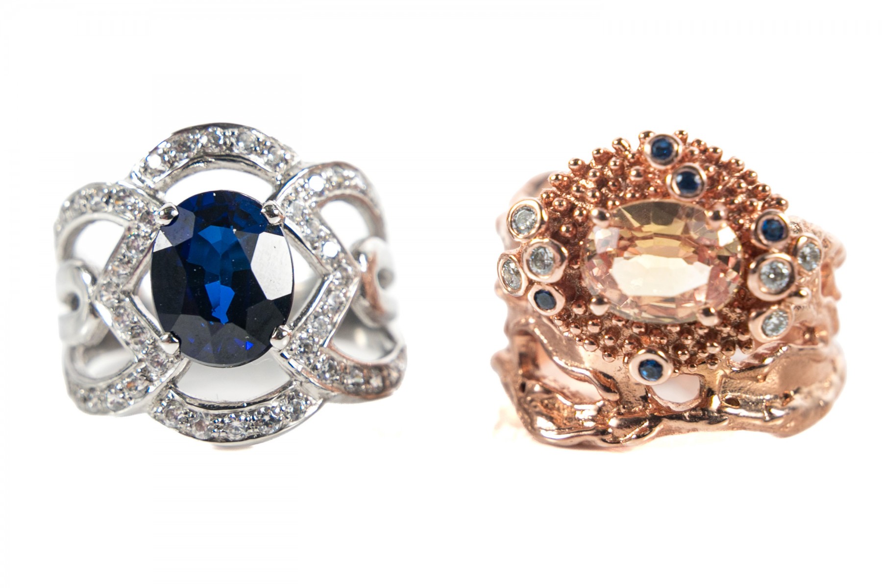 A delightful duo of sterling silver rings with wide, pierced designs along the bands, featuring dark blue and yellow synthetic sapphires. The first ring displays a rose vermeil naturalistic form, with an offset head detailed with yellow, blue, and white stones around a cluster of stippled accents. The second ring sports a classy intersecting oval design with blue and white stones.