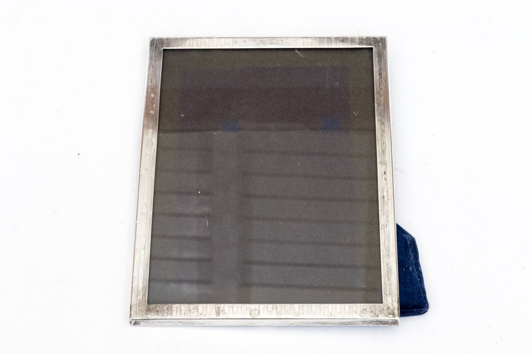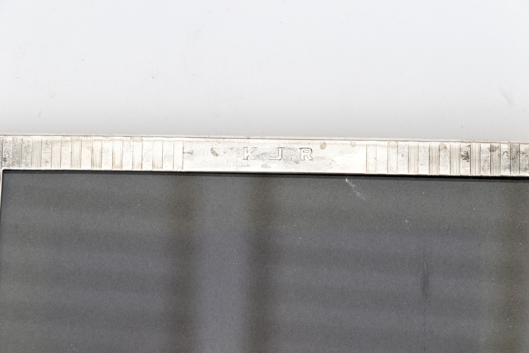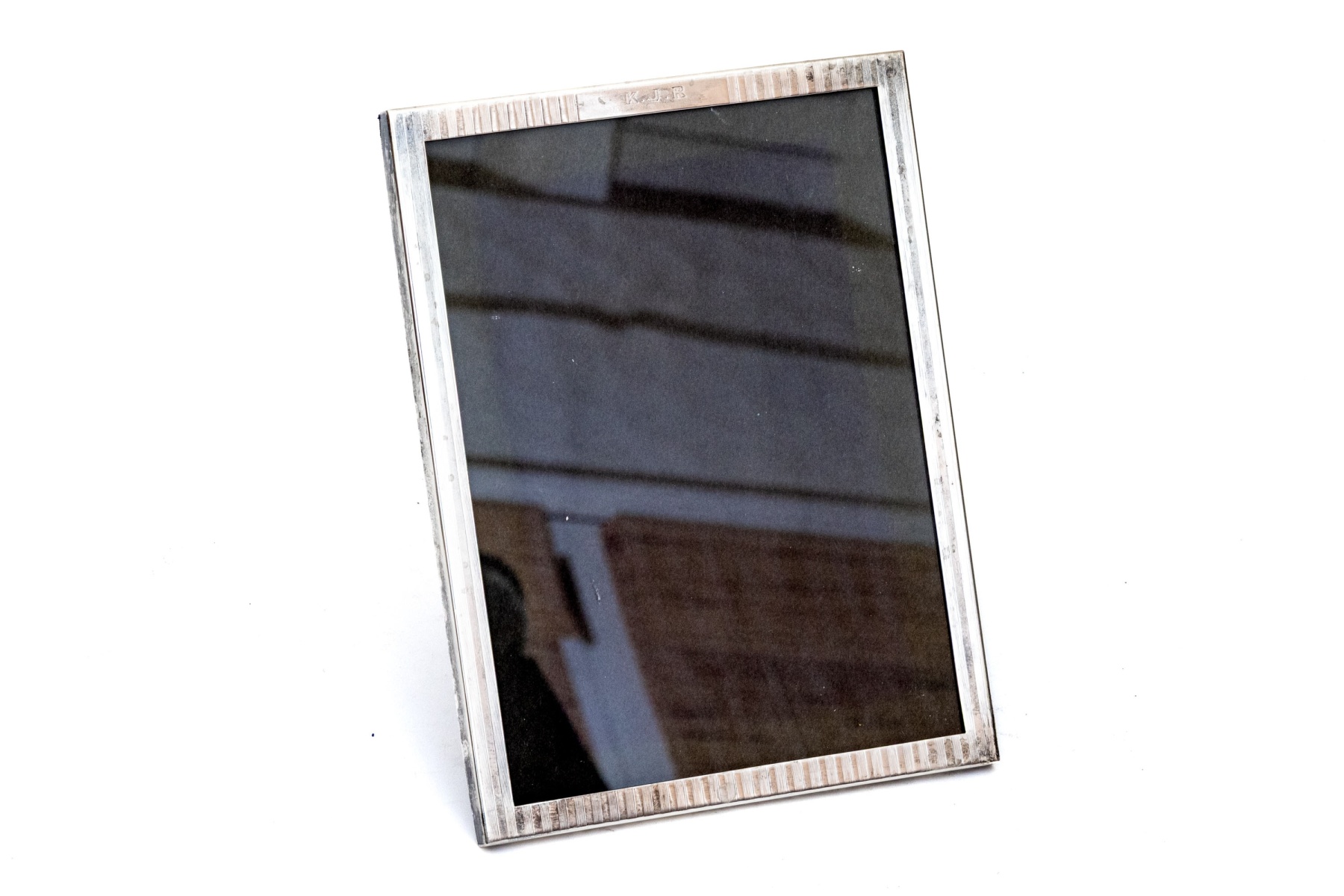 A lovely sterling silver tabletop picture frame detailed with finely striated vertical stripes. Monogrammed T.J.R at the center top and displayed with an easel back. Marked to lower trim.