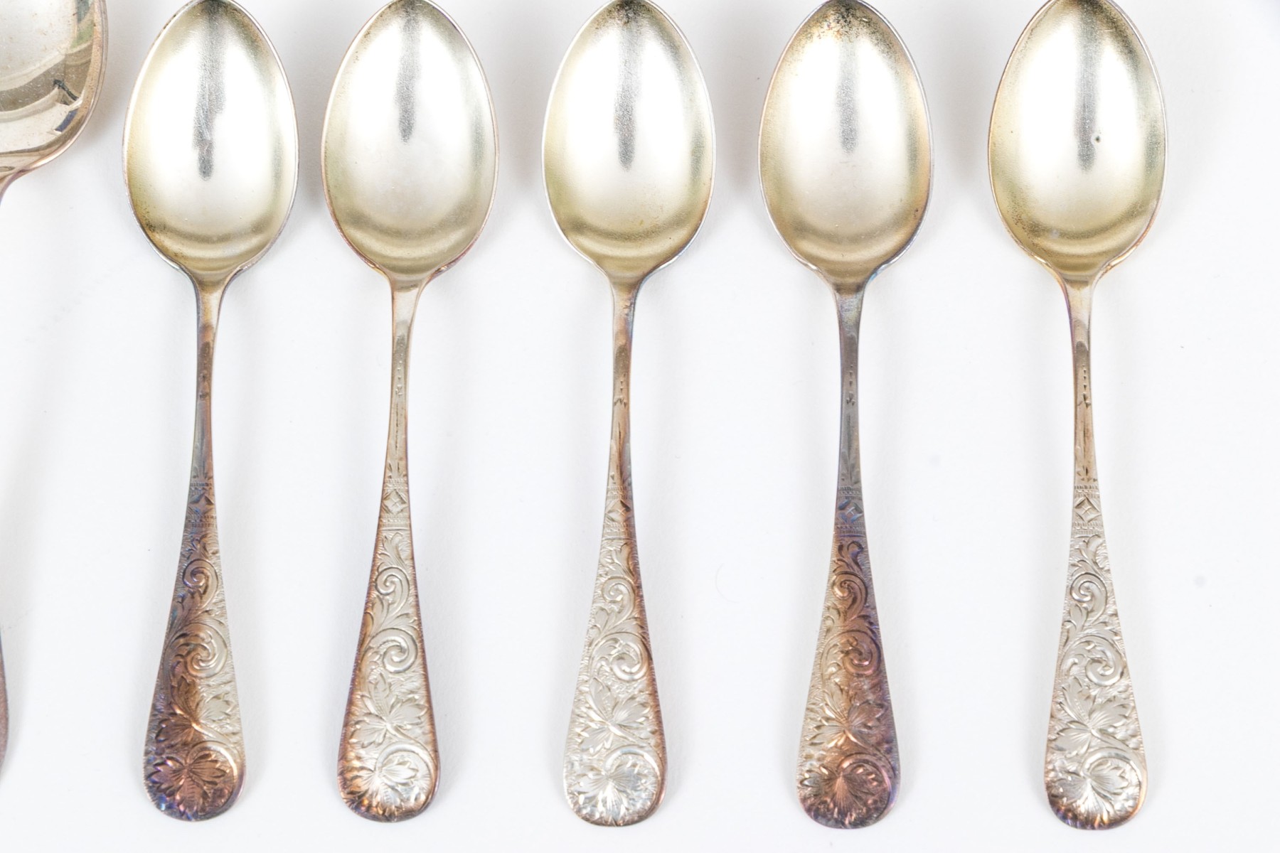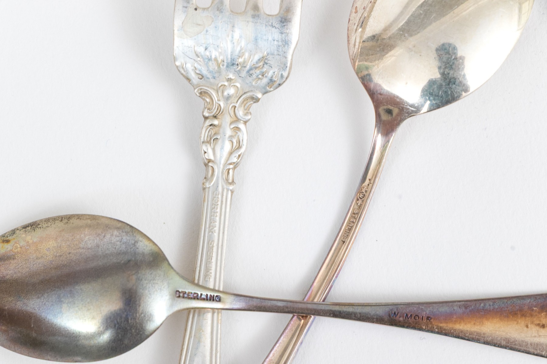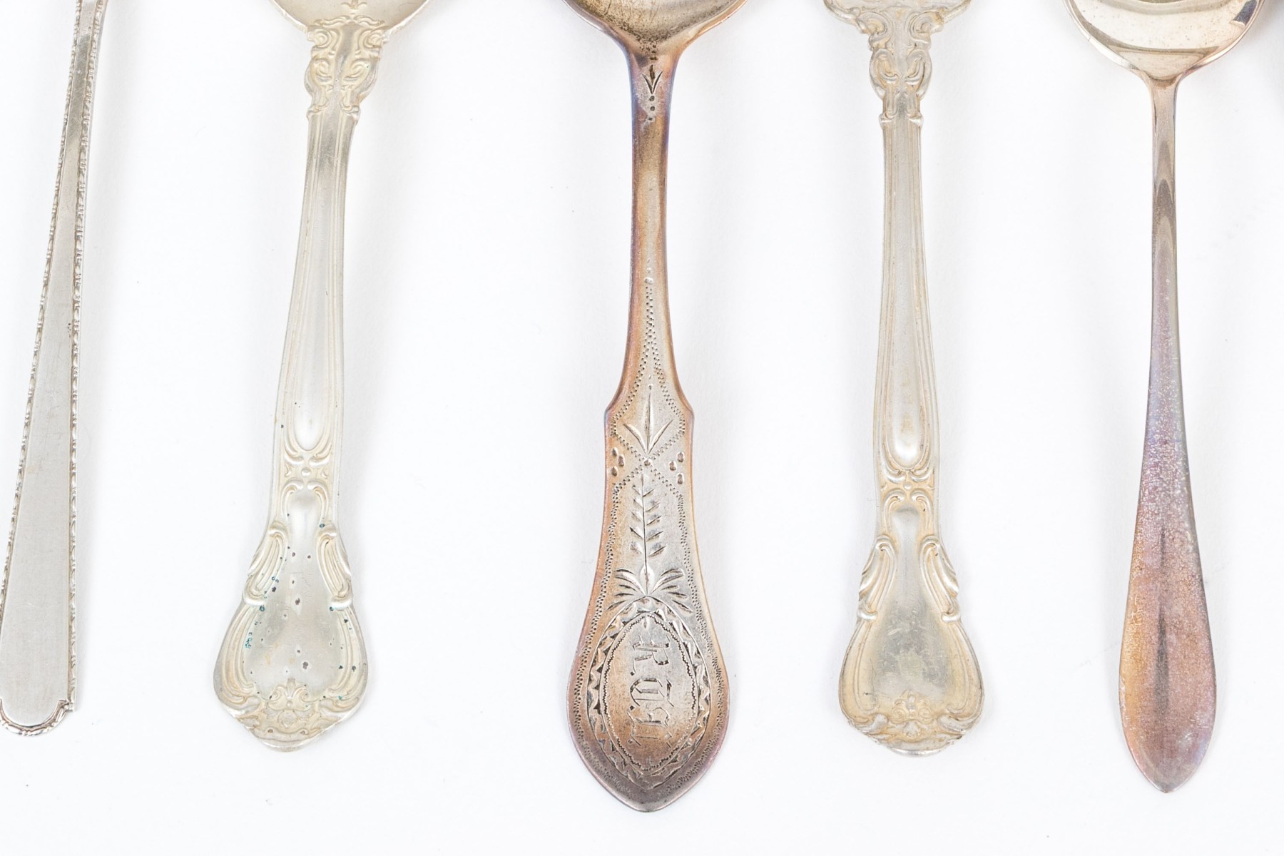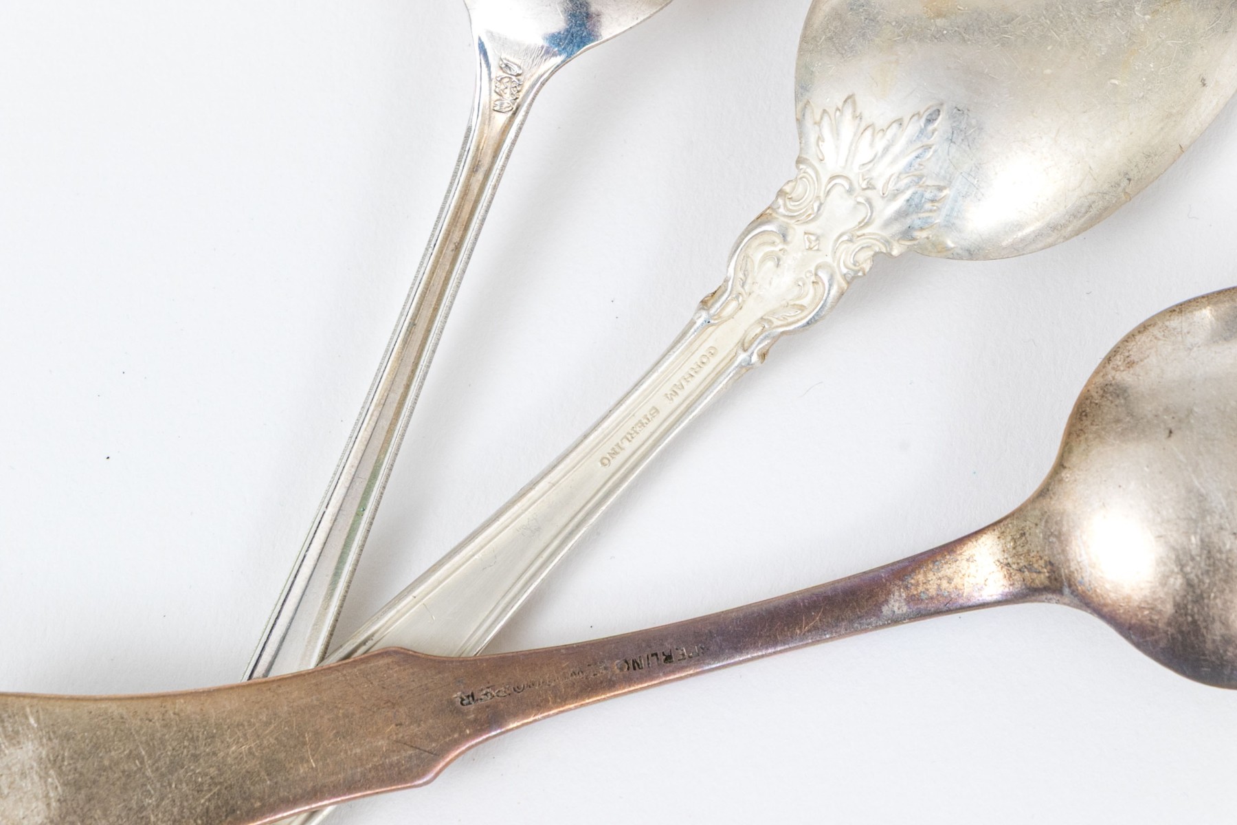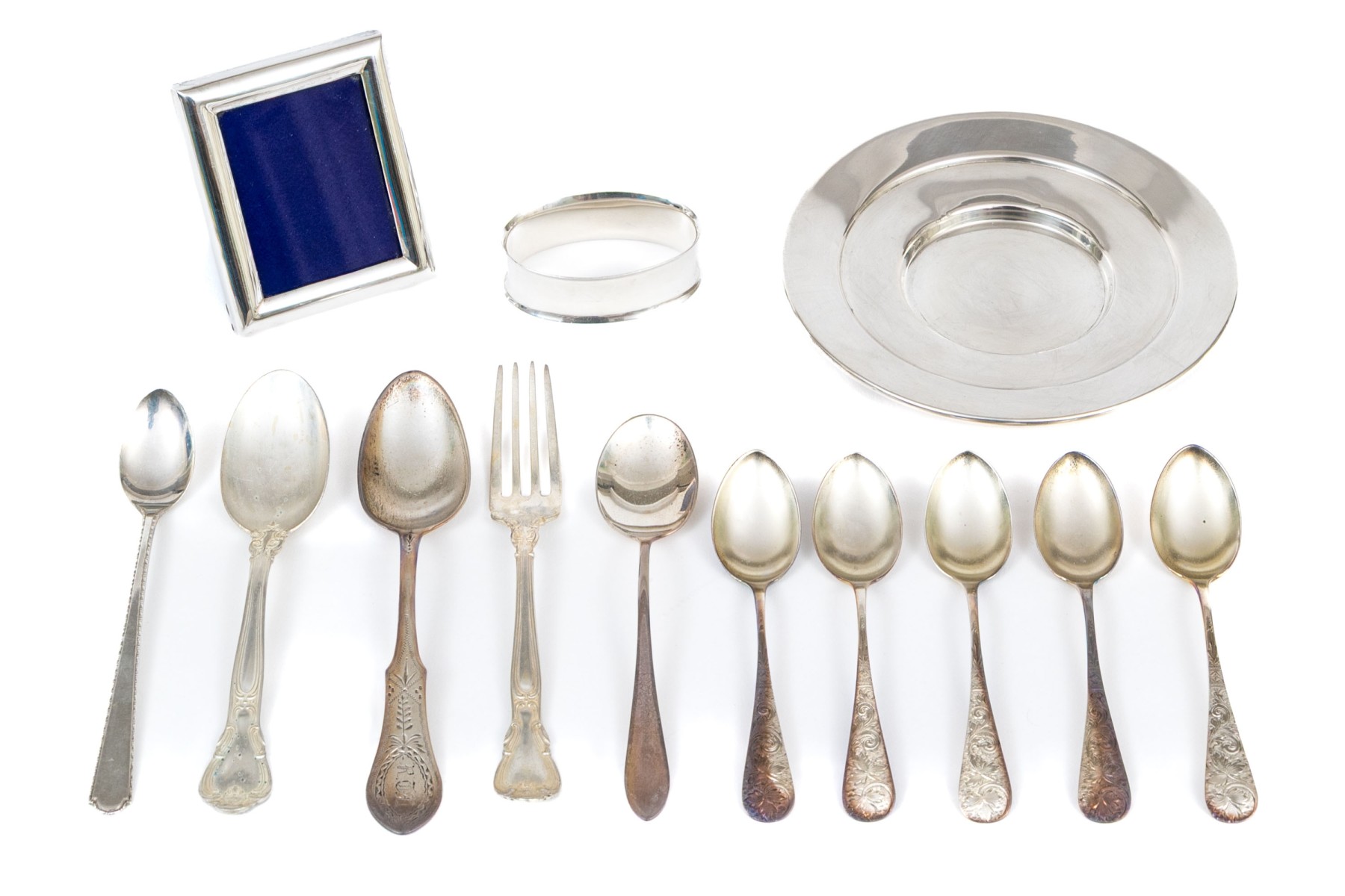 A wonderful variety of sterling silver including a sterling silver saucer plate, nine spoons, napkin ring, and picture frame. Makers including Gorham and Reed & Barton, among others.