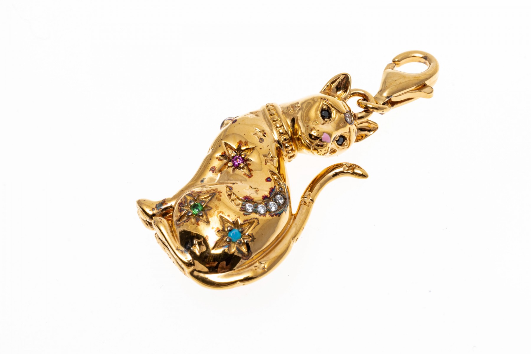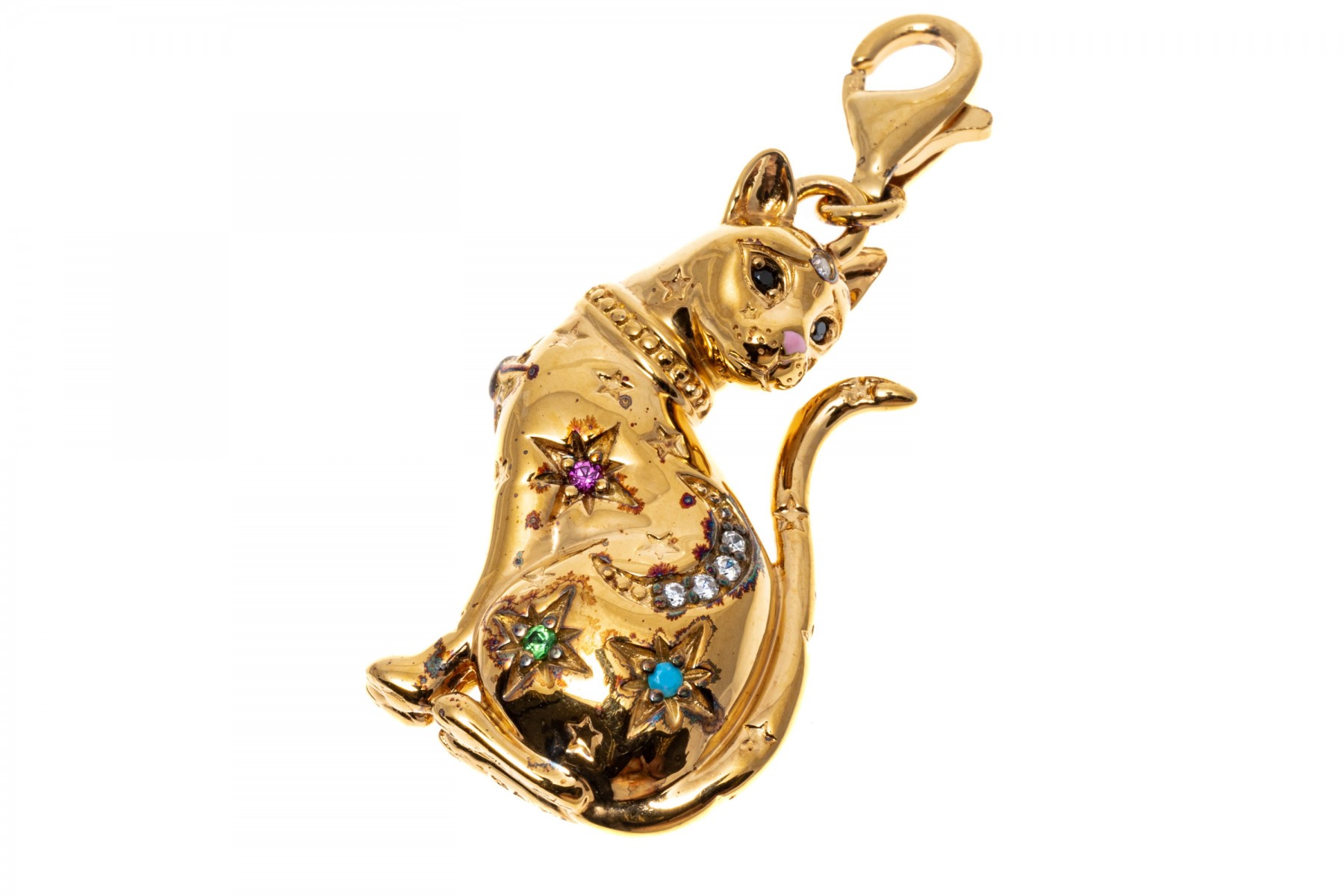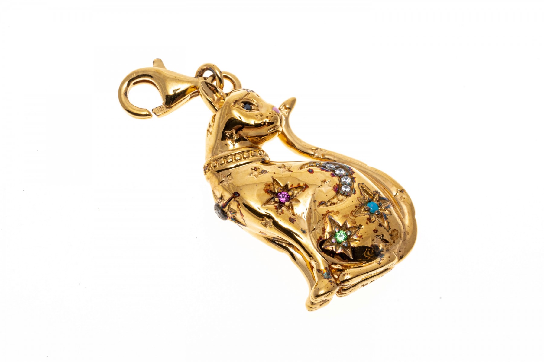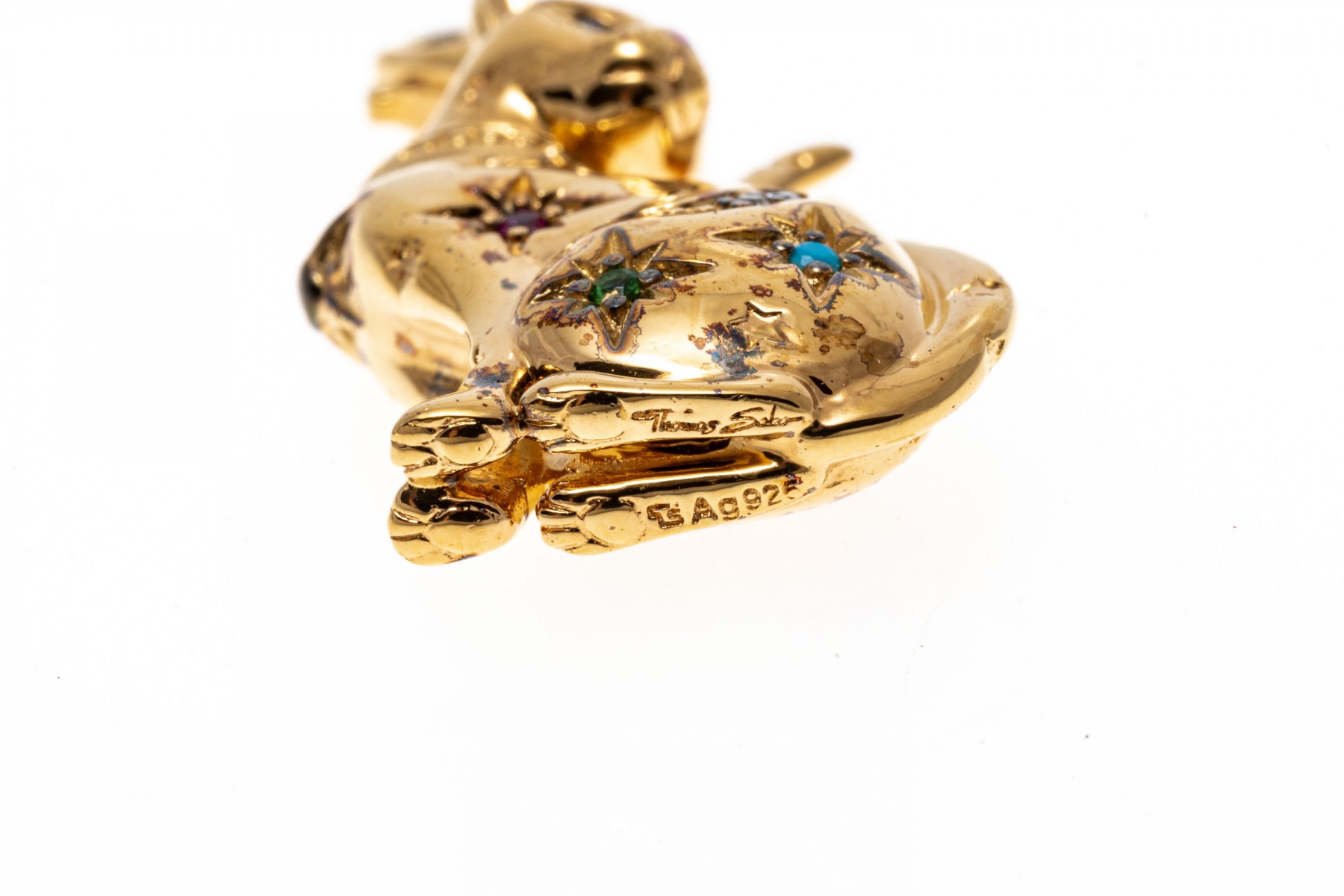 A sterling silver vermeil cat pendant by Thomas Sabo. This handsome seated cat is set with colorful cubic zirconia and synthetic pink sapphires. The bale of the pendant has a lobster claw clasp.