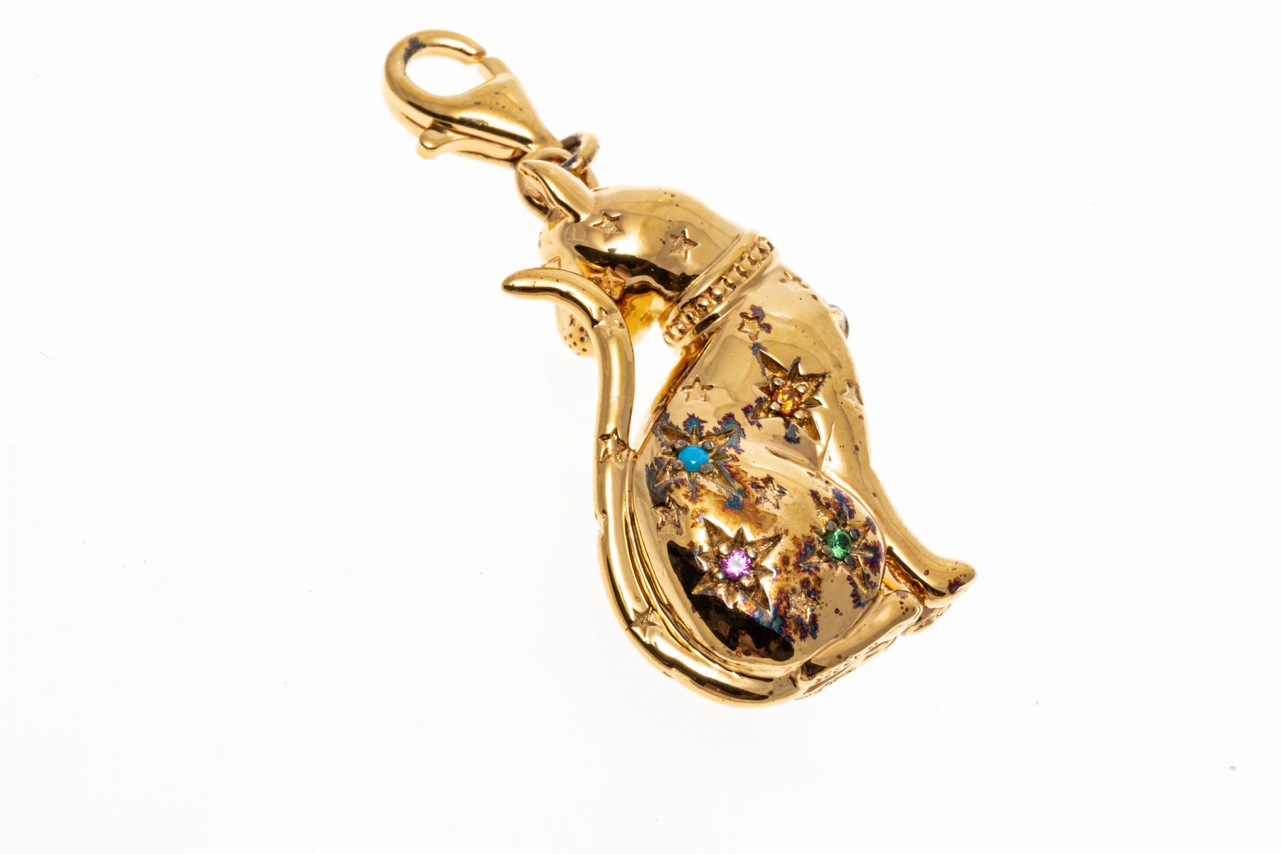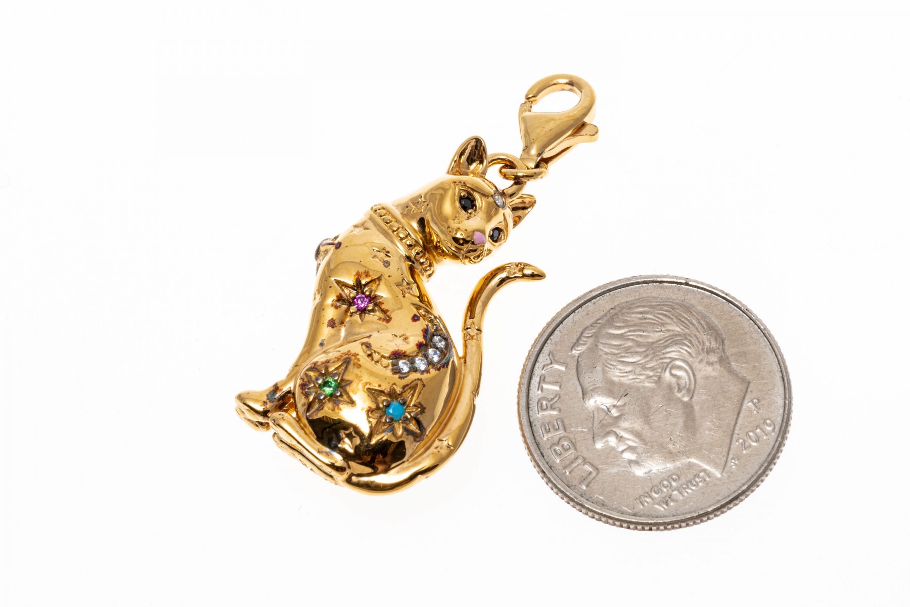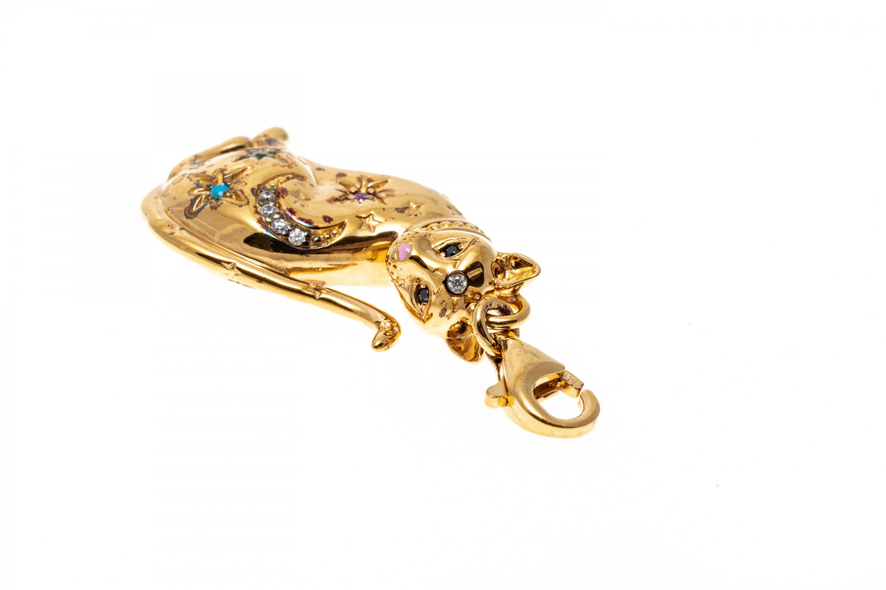 A sterling silver vermeil cat pendant by Thomas Sabo. This handsome seated cat is set with colorful cubic zirconia and synthetic pink sapphires. The bale of the pendant has a lobster claw clasp.