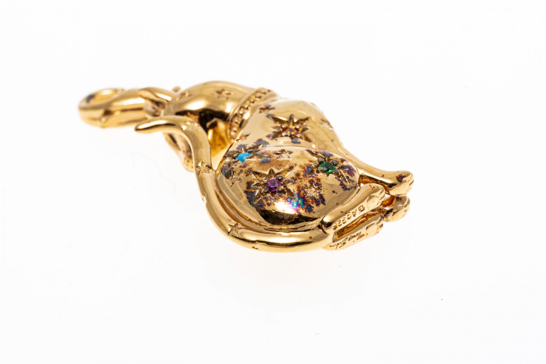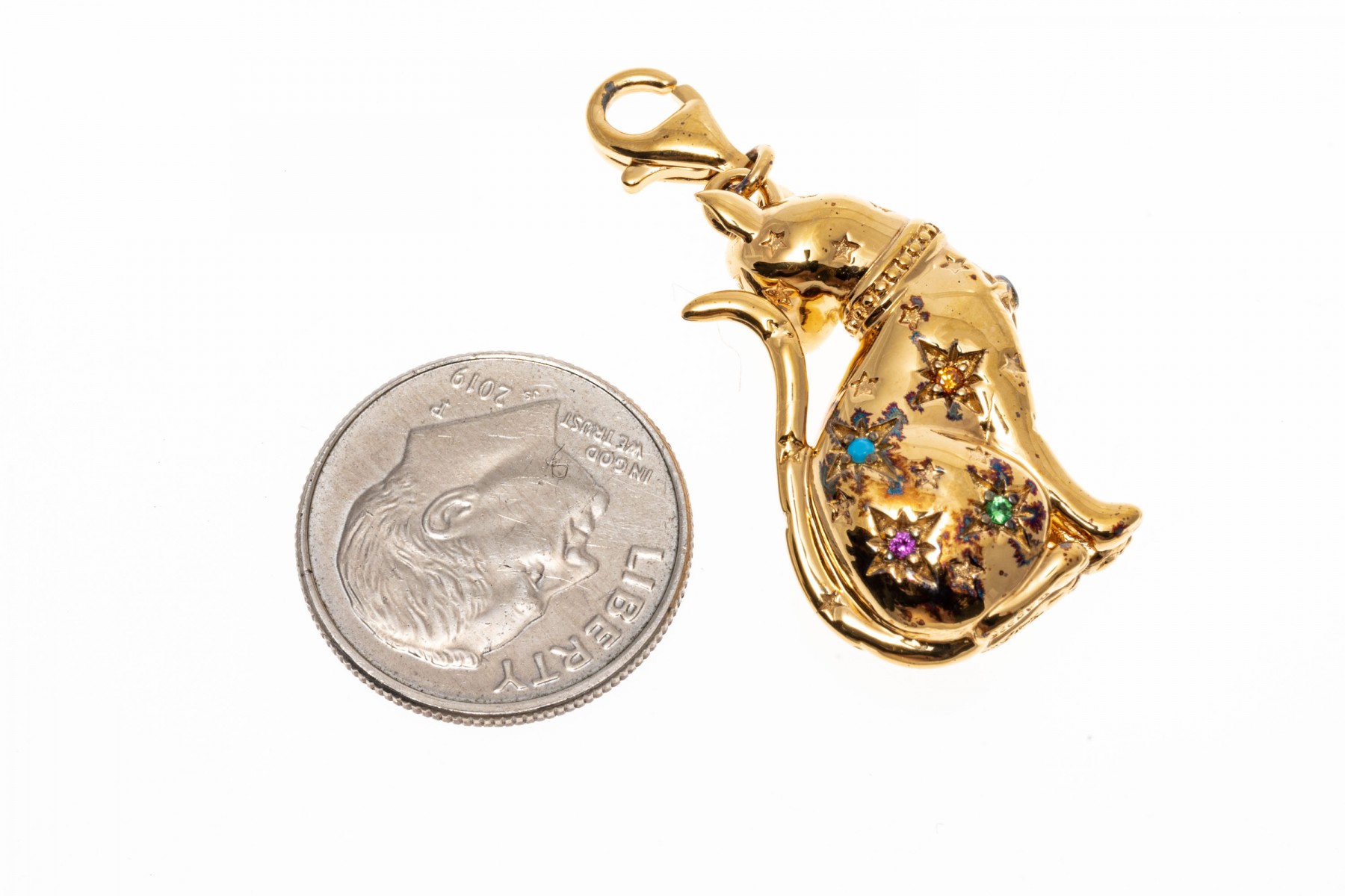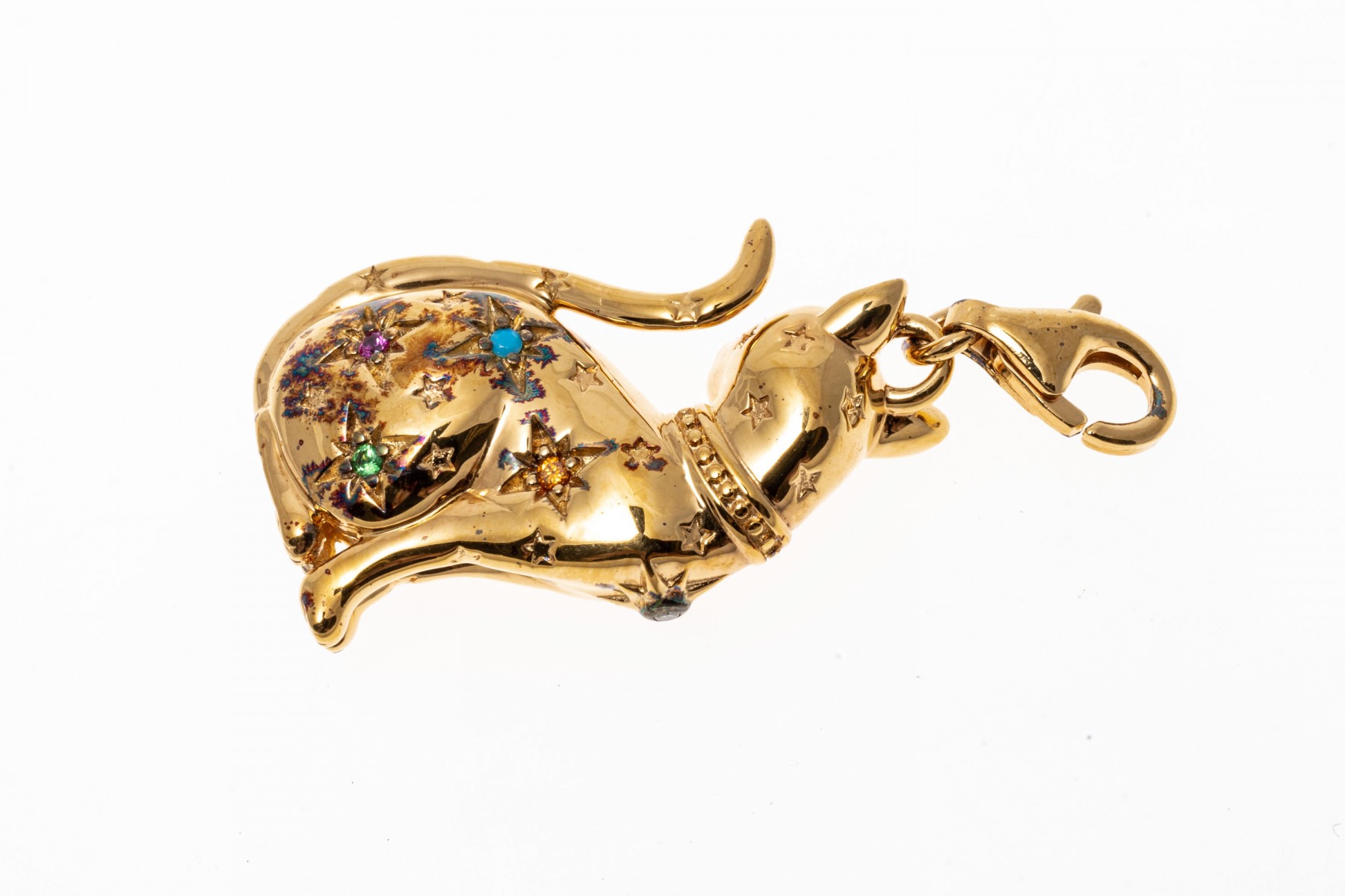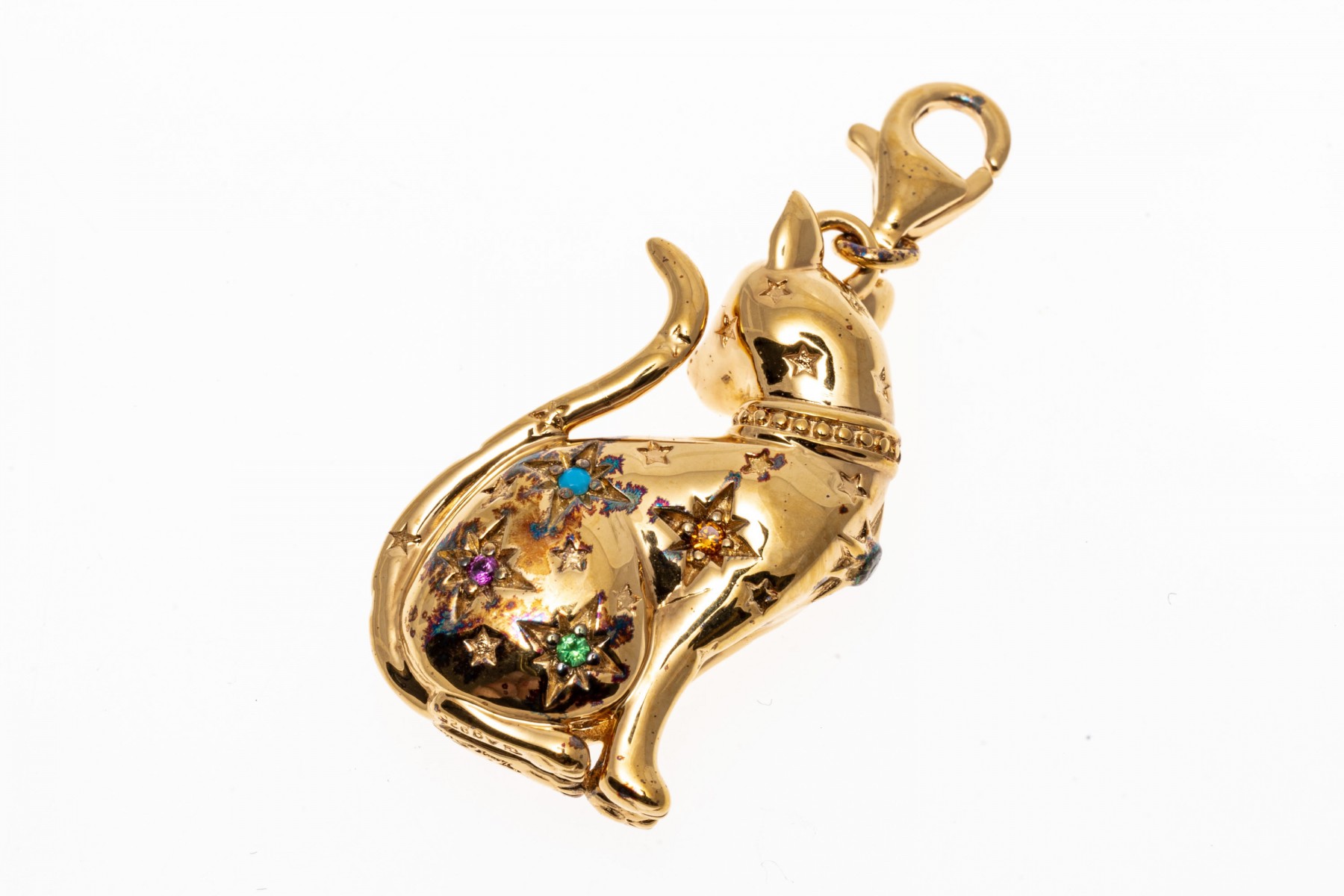 A sterling silver vermeil cat pendant by Thomas Sabo. This handsome seated cat is set with colorful cubic zirconia and synthetic pink sapphires. The bale of the pendant has a lobster claw clasp.