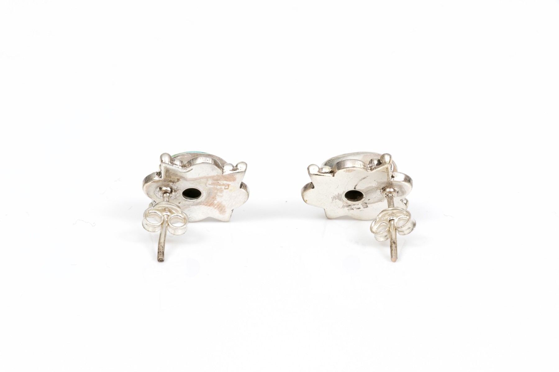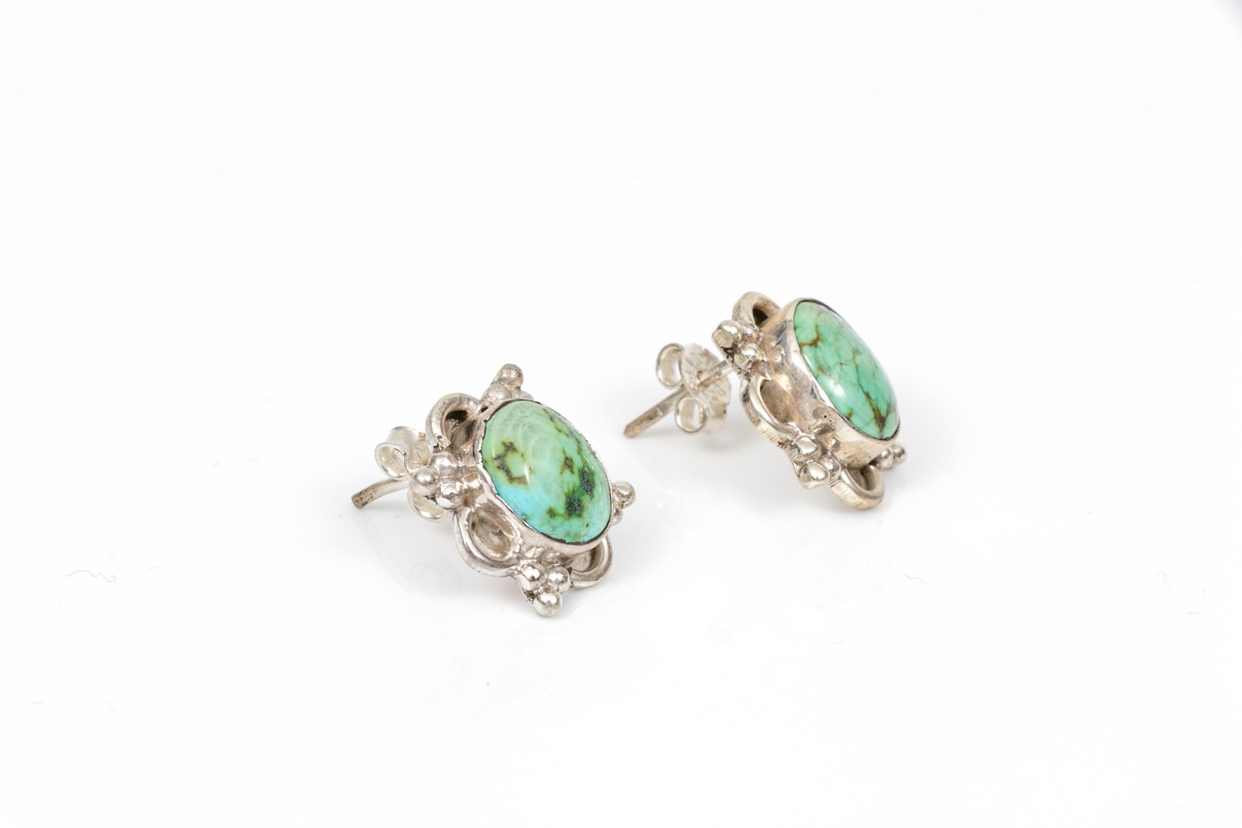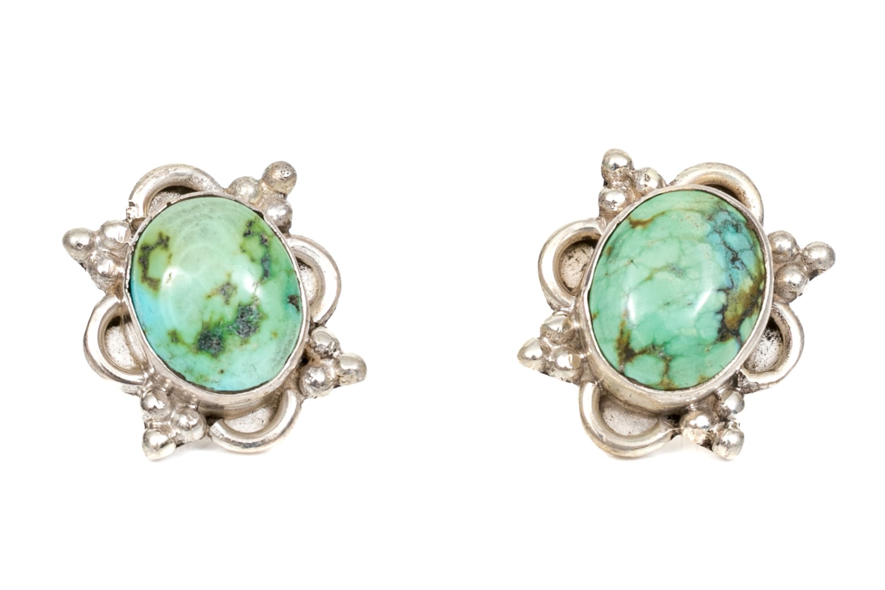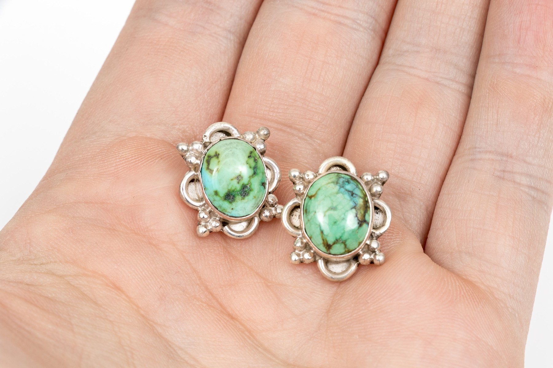 A pair of sterling silver studs displaying oval turquoise cabochons in bezel settings accented with beadwork frames. Finished with post and clutch backings.