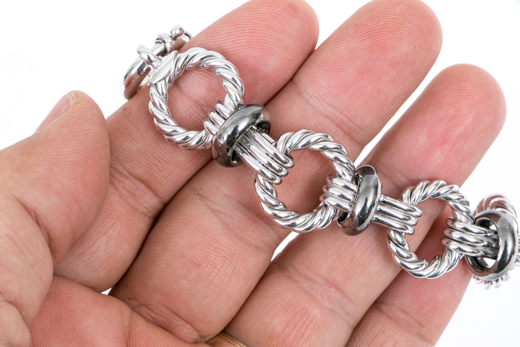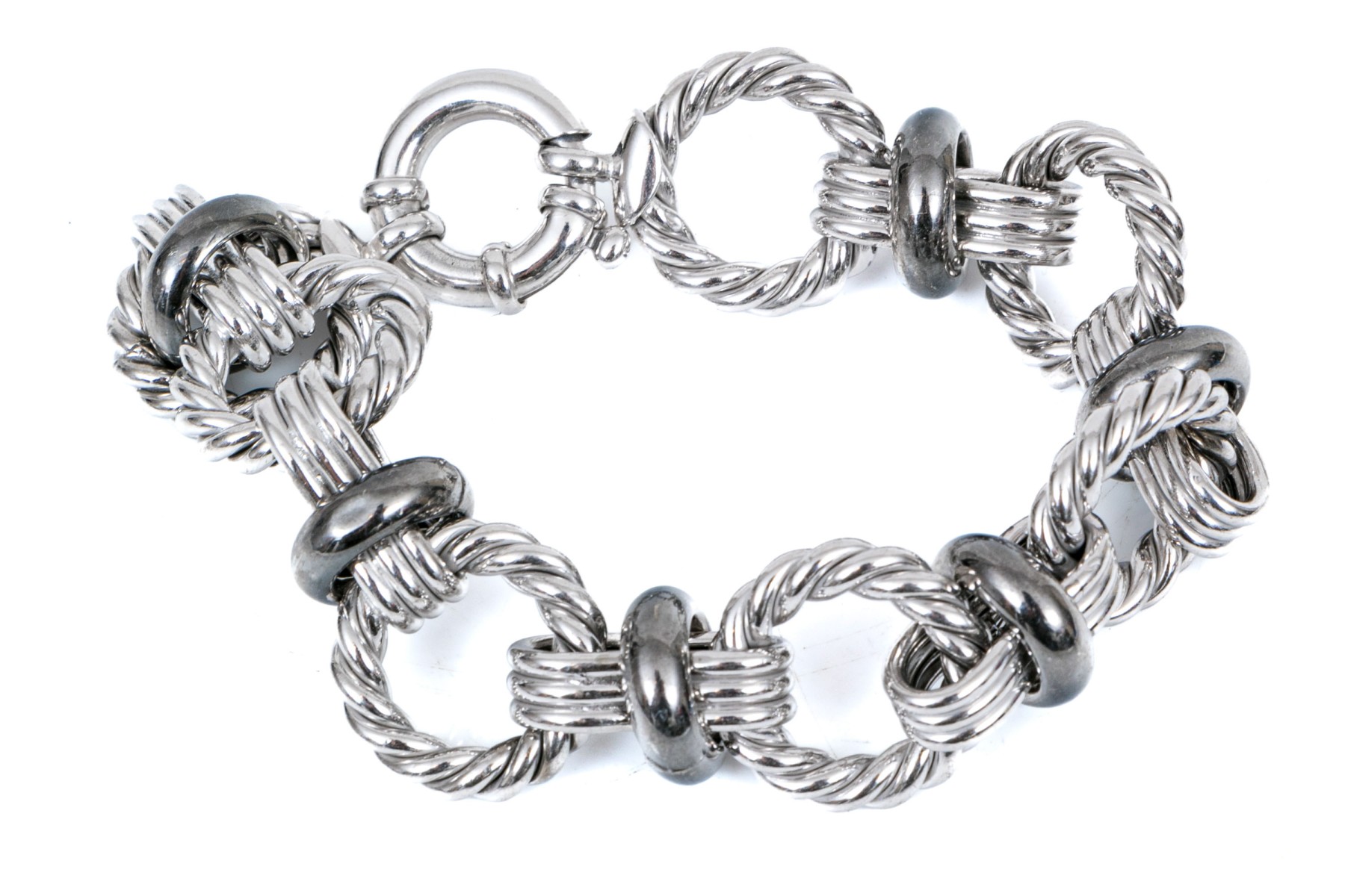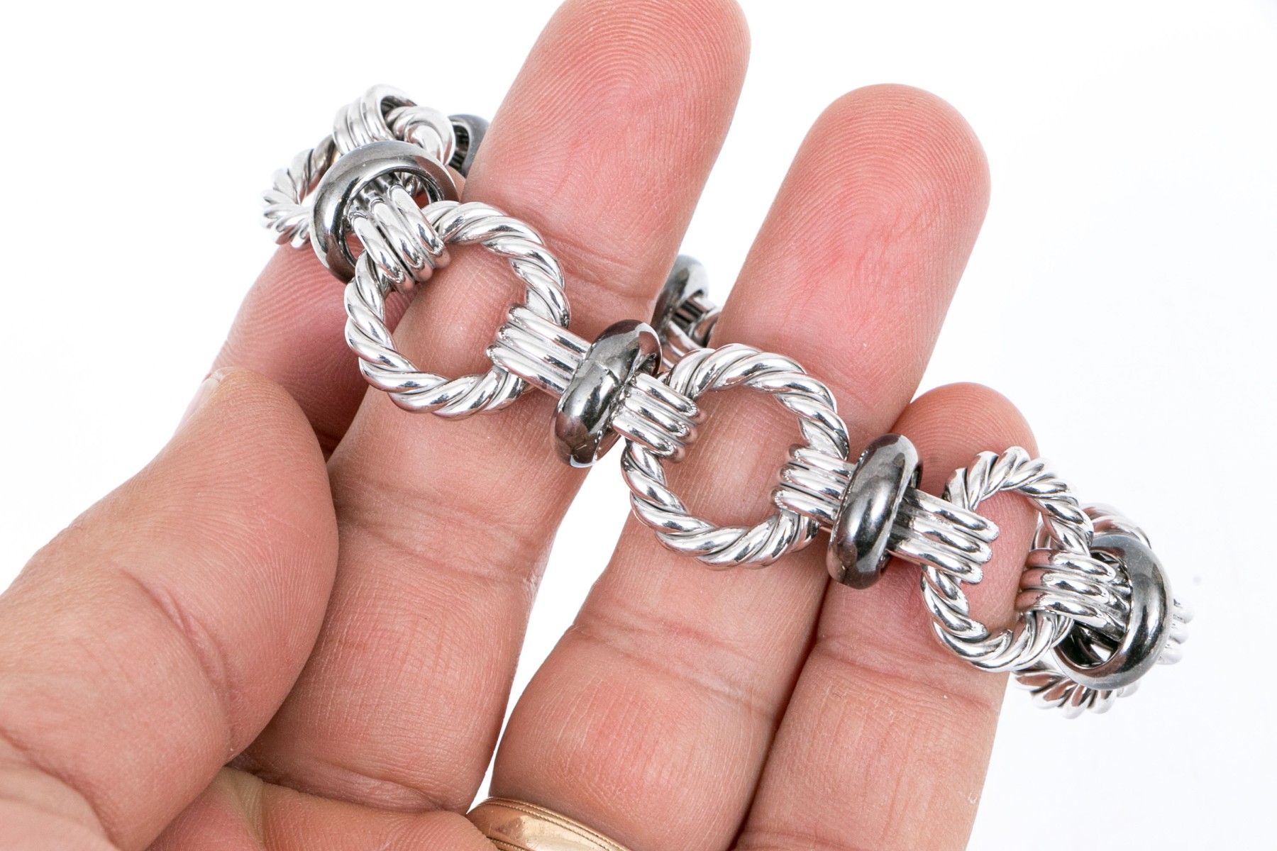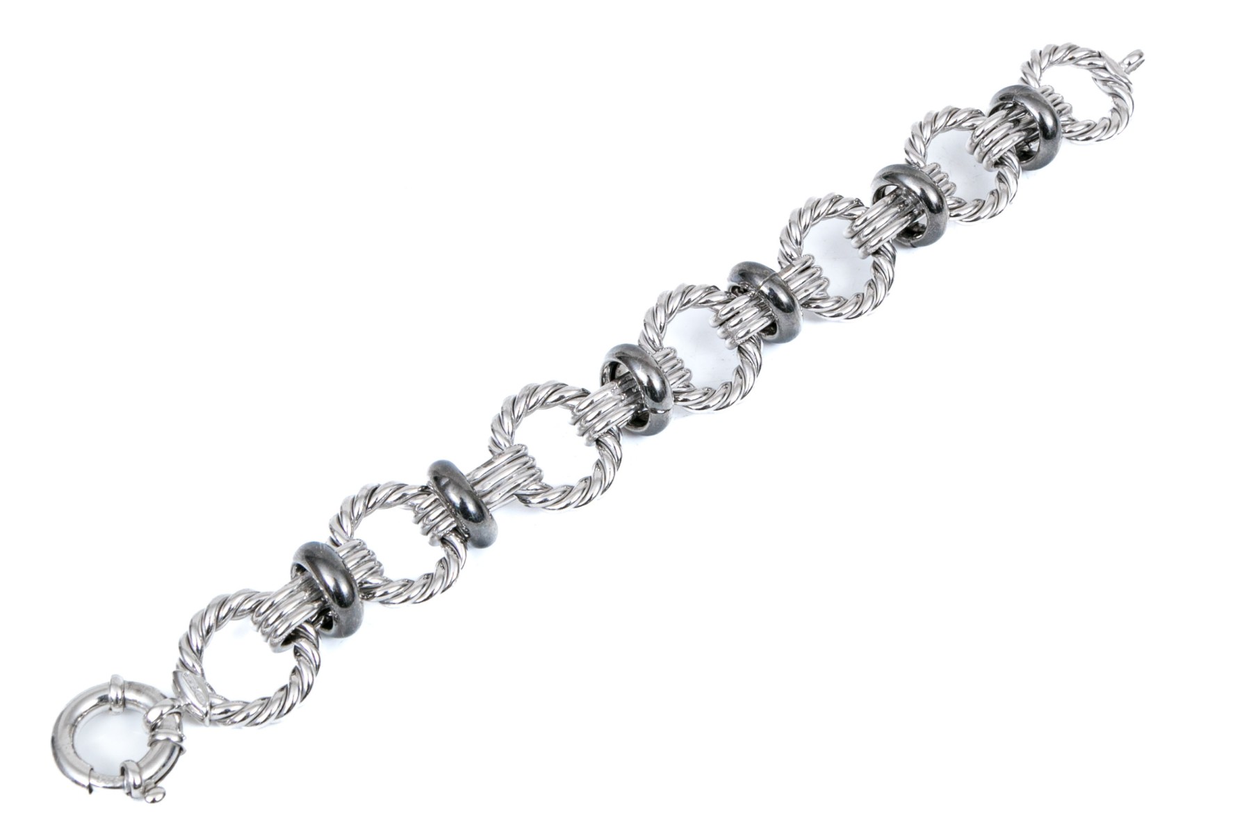 A handsome, textural sterling silver bracelet displaying robe twist circular links alternating with elongated ribbed links encircled by gunmetal hued rings. Secured with a large spring ring clasp.