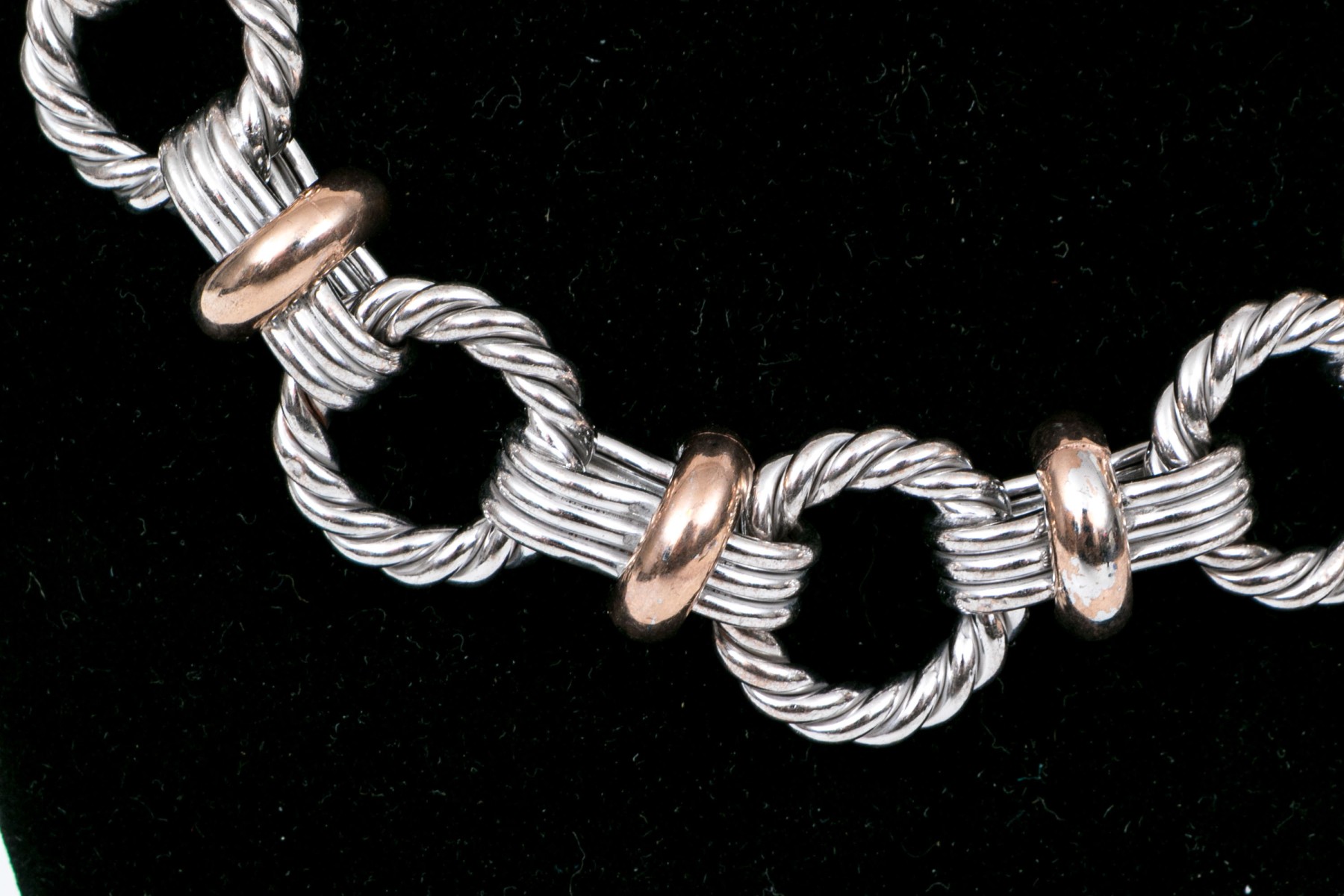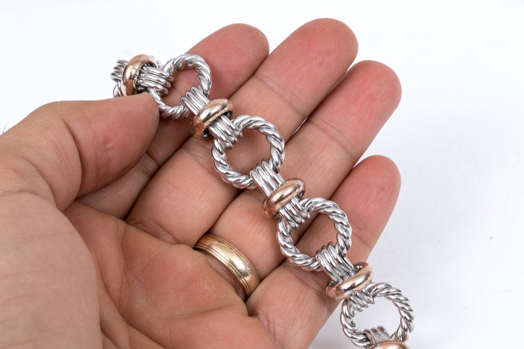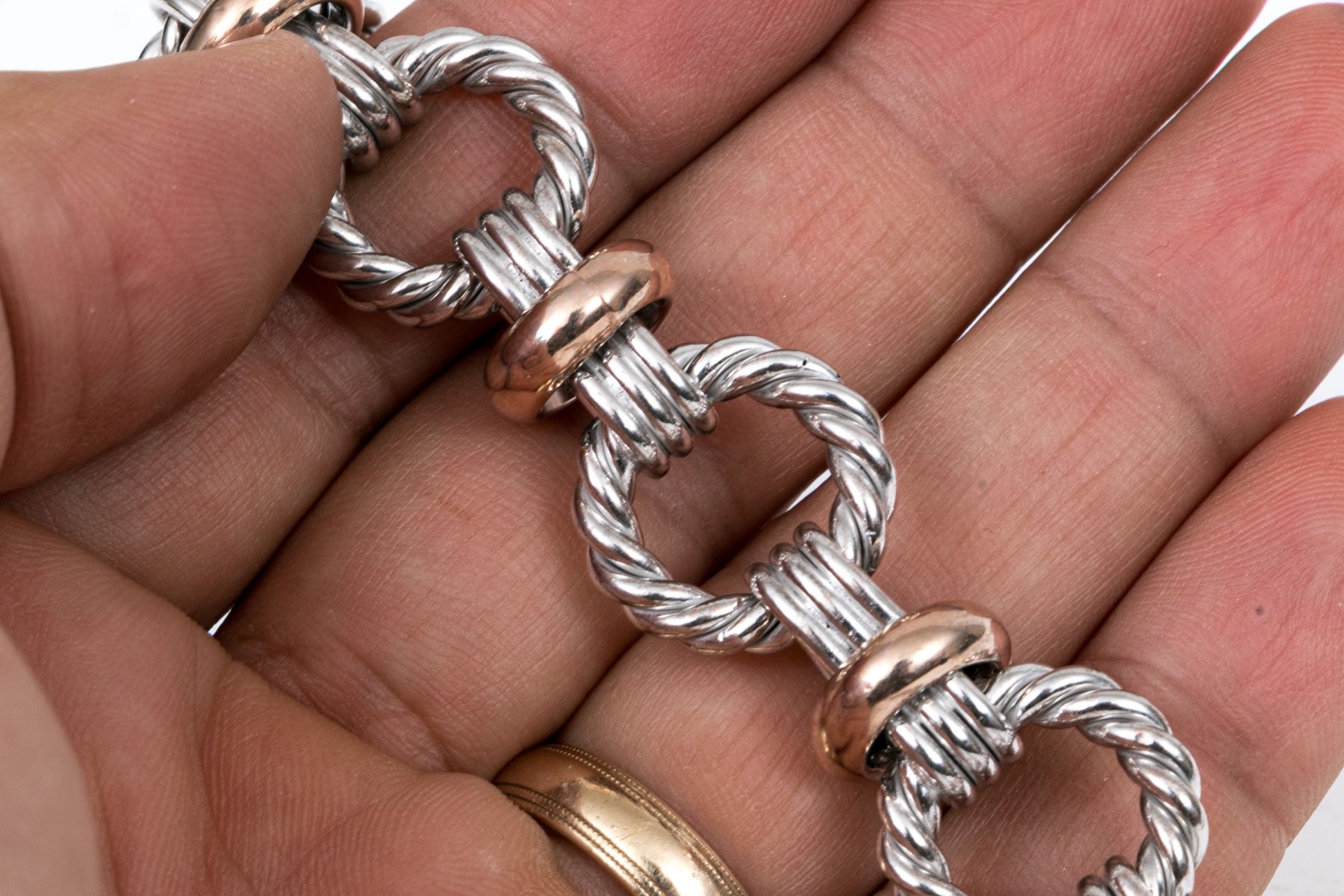 A handsome sterling silver bracelet displaying rope twist circular links alternating between elongated ribbed cable links encircled by rose vermeil rings. Finished with a large spring ring clasp.