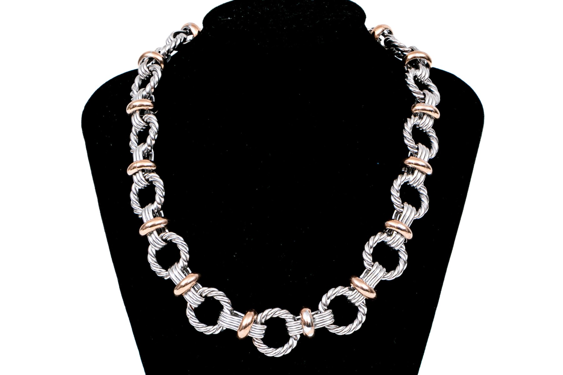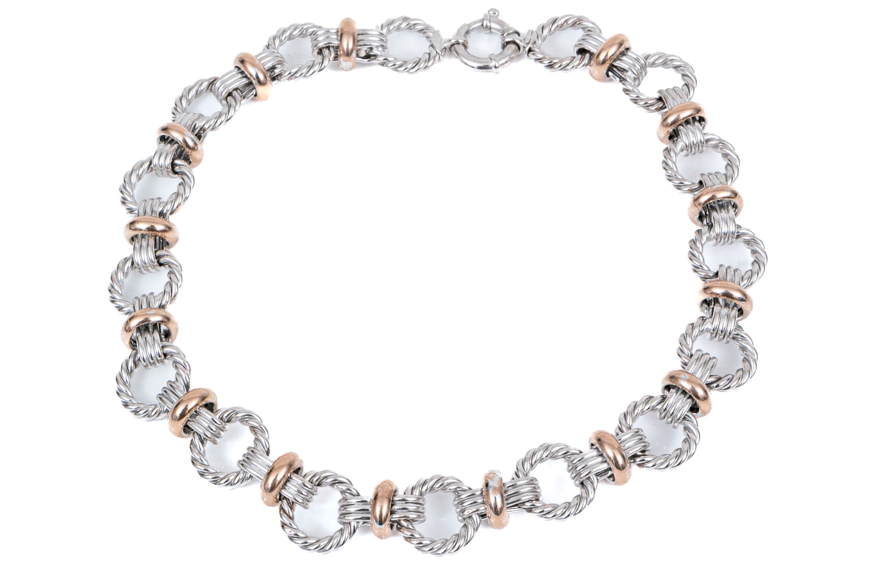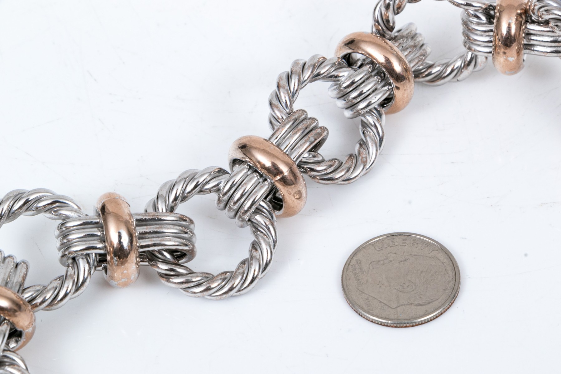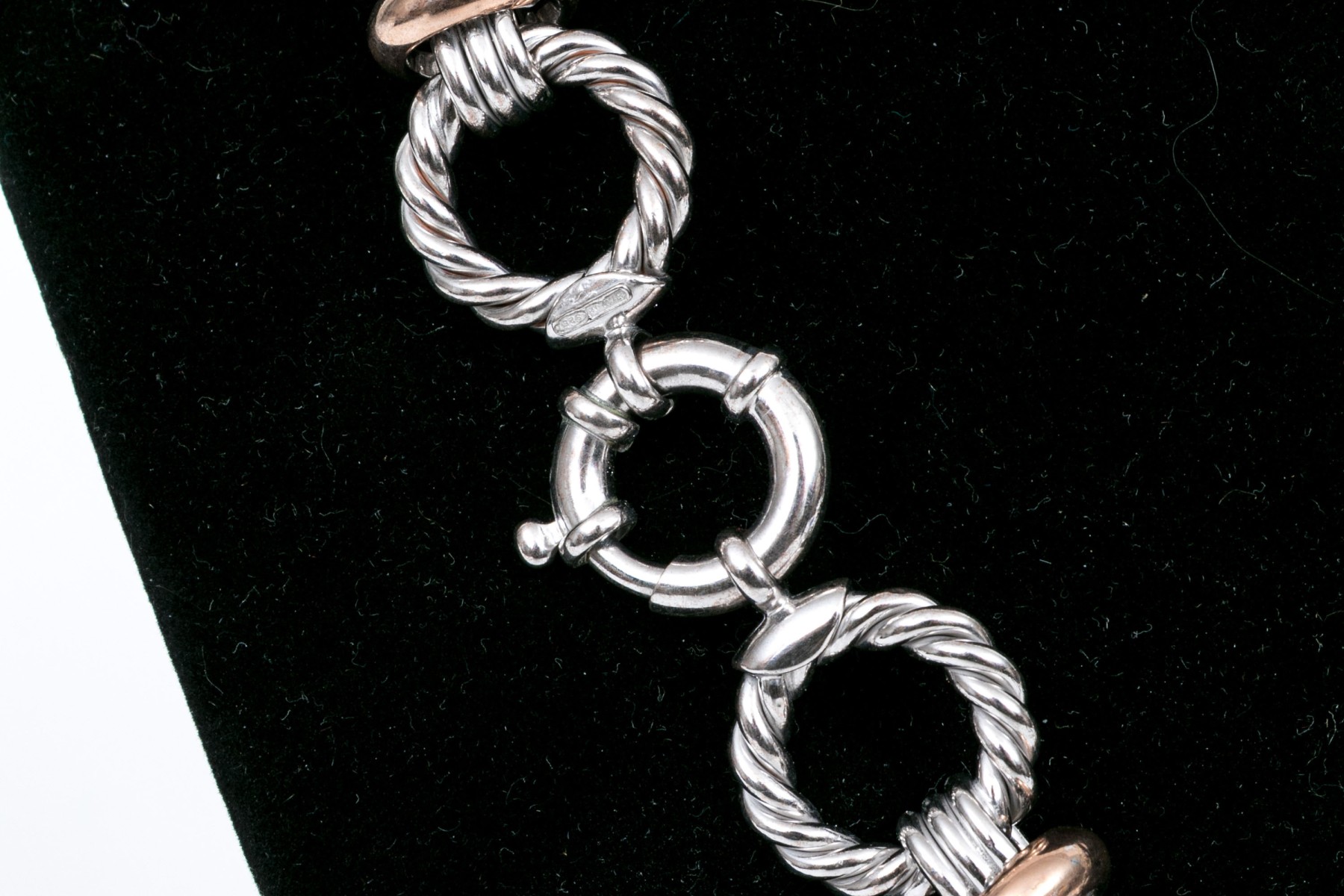 A handsome sterling silver bracelet displaying rope twist circular links alternating between elongated ribbed cable links encircled by rose vermeil rings. Finished with a large spring ring clasp.