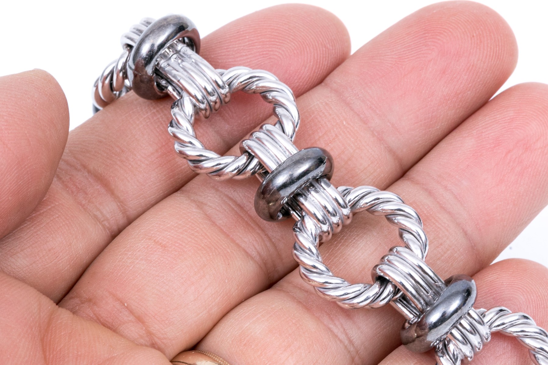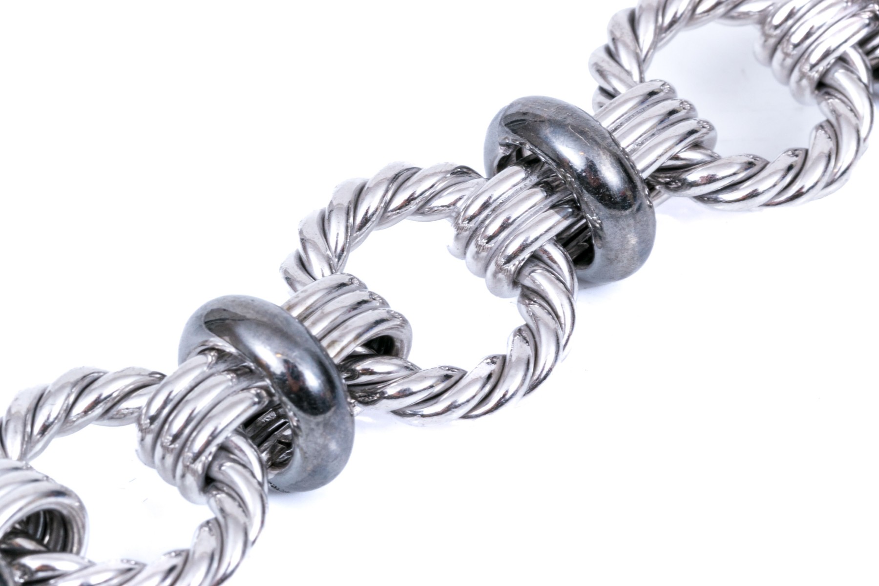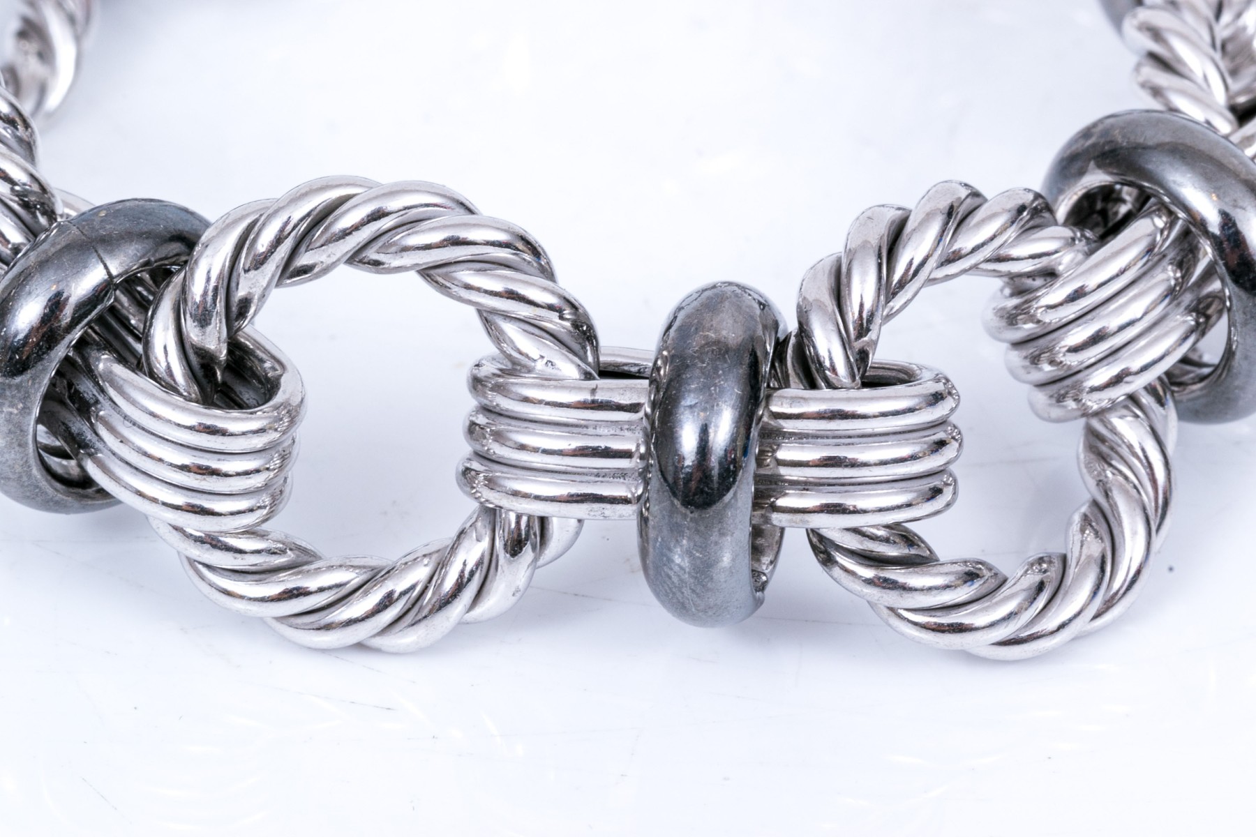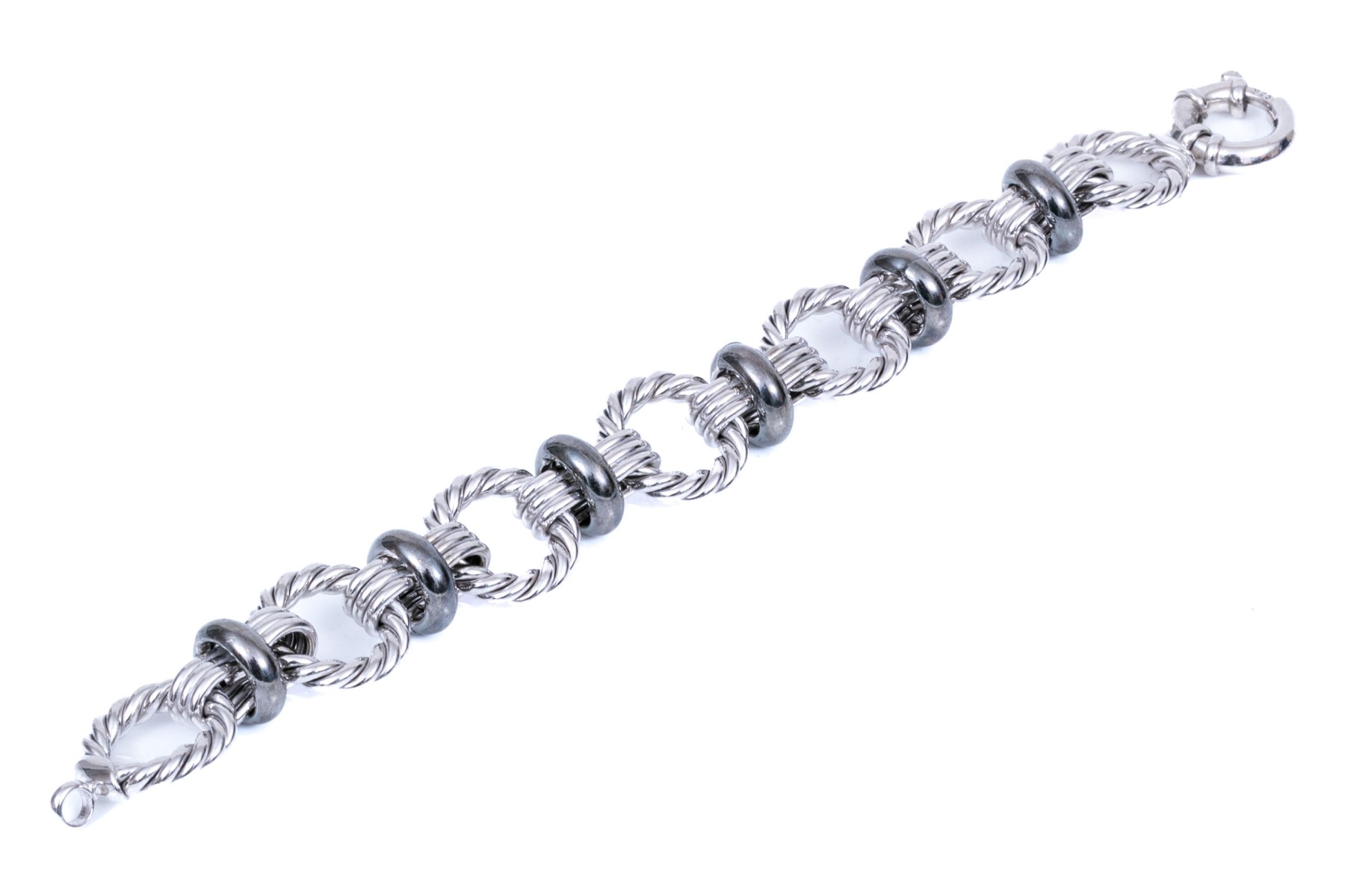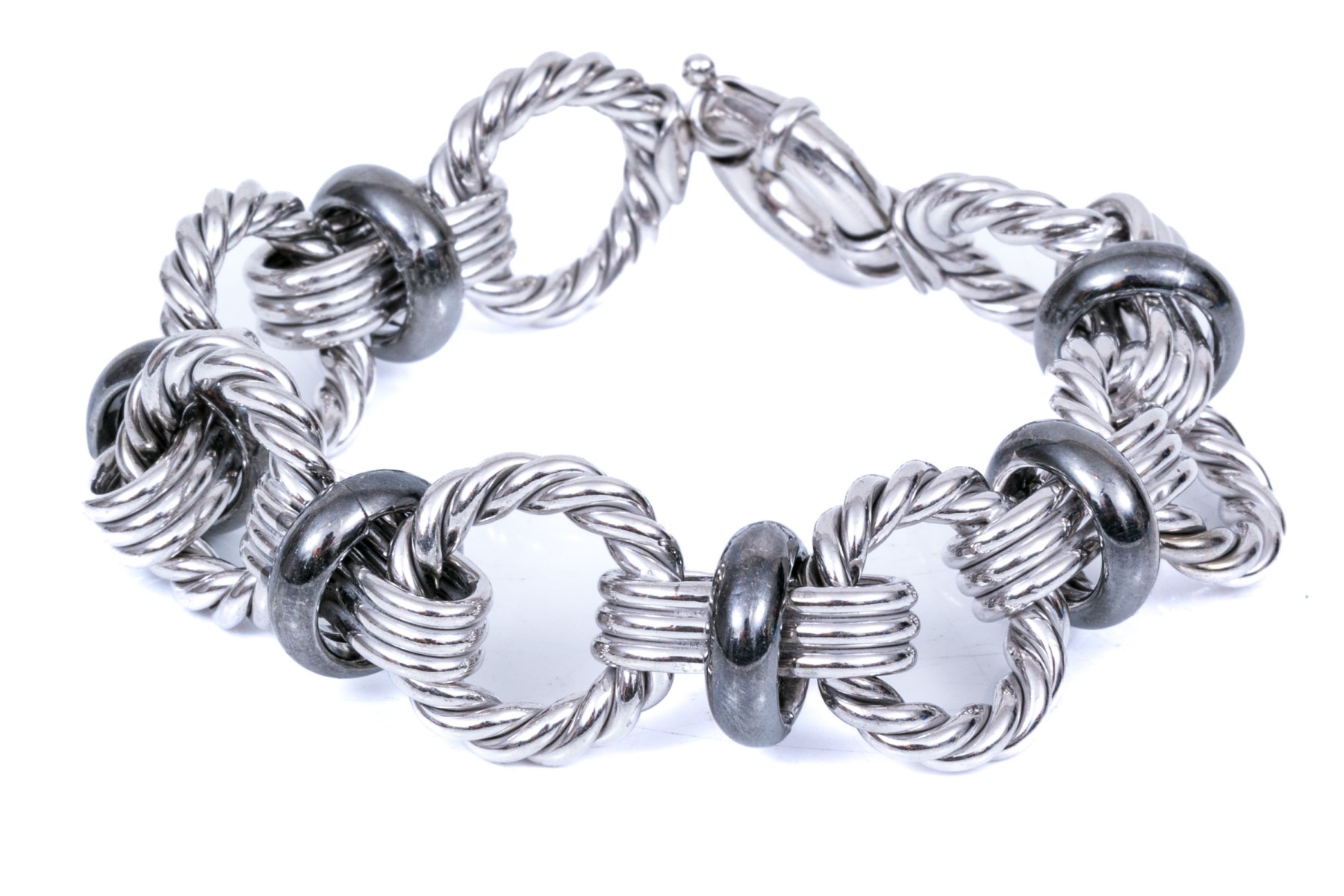 A handsome, textural sterling silver bracelet displaying robe twist circular links alternating with elongated ribbed links encircled by gunmetal hued rings. Secured with a large spring ring clasp.