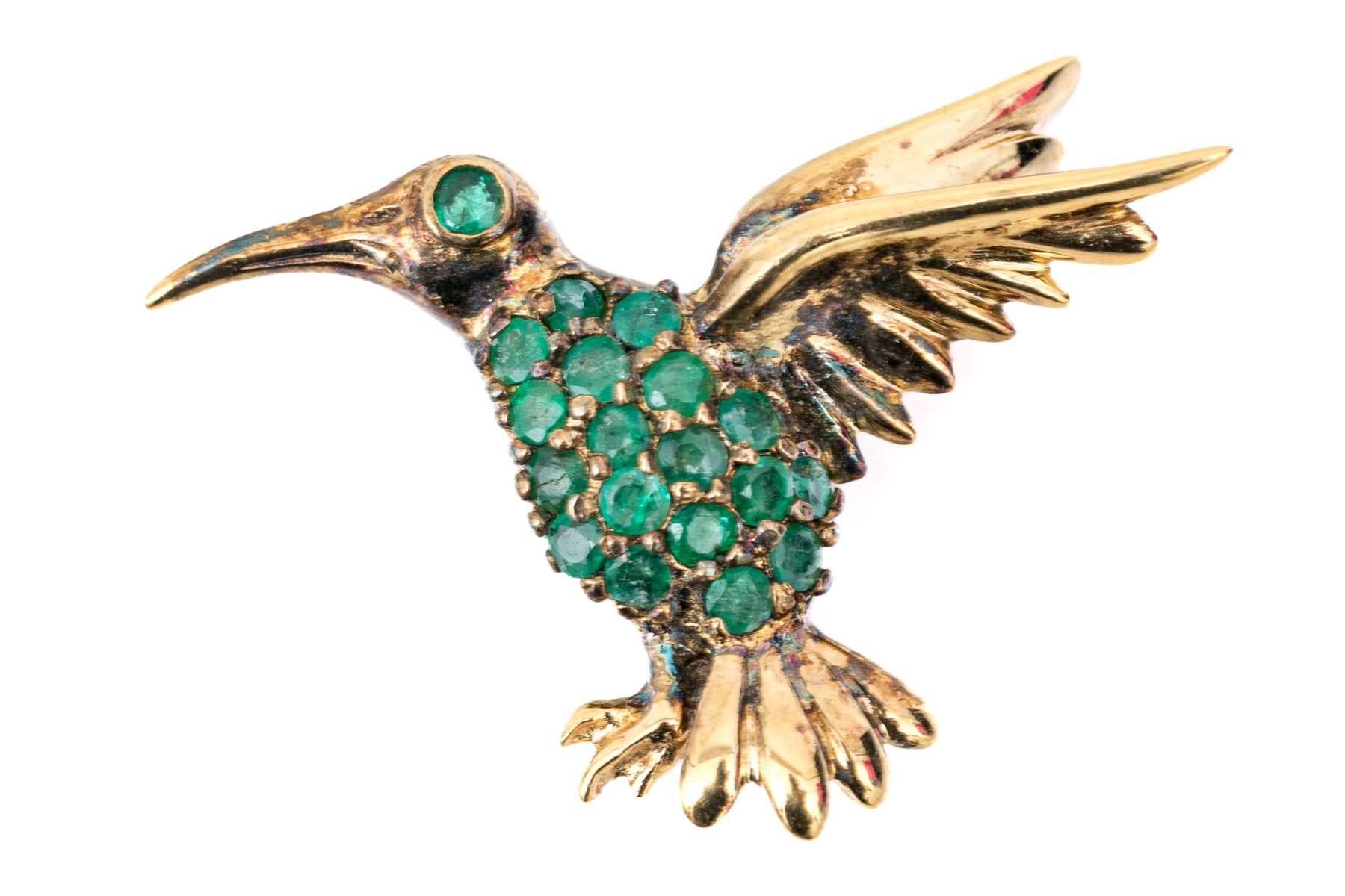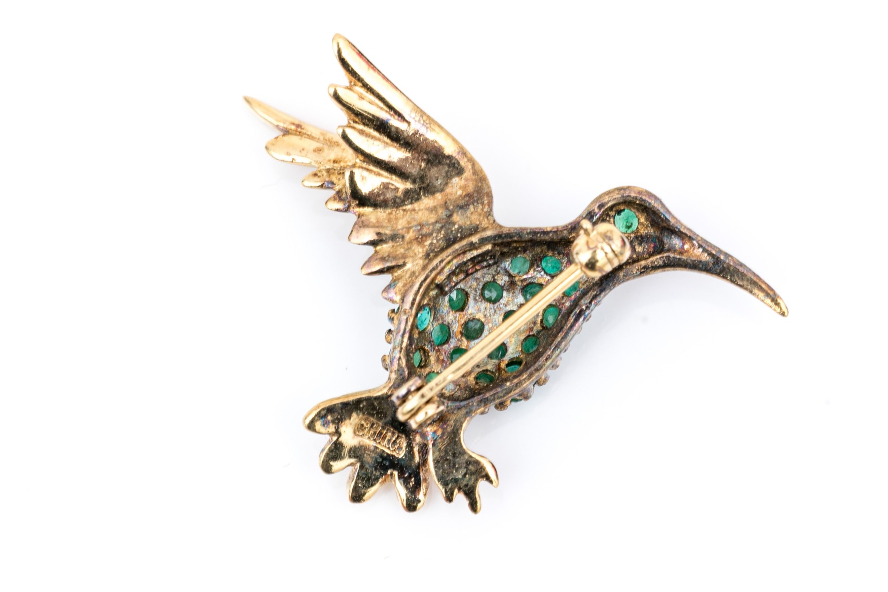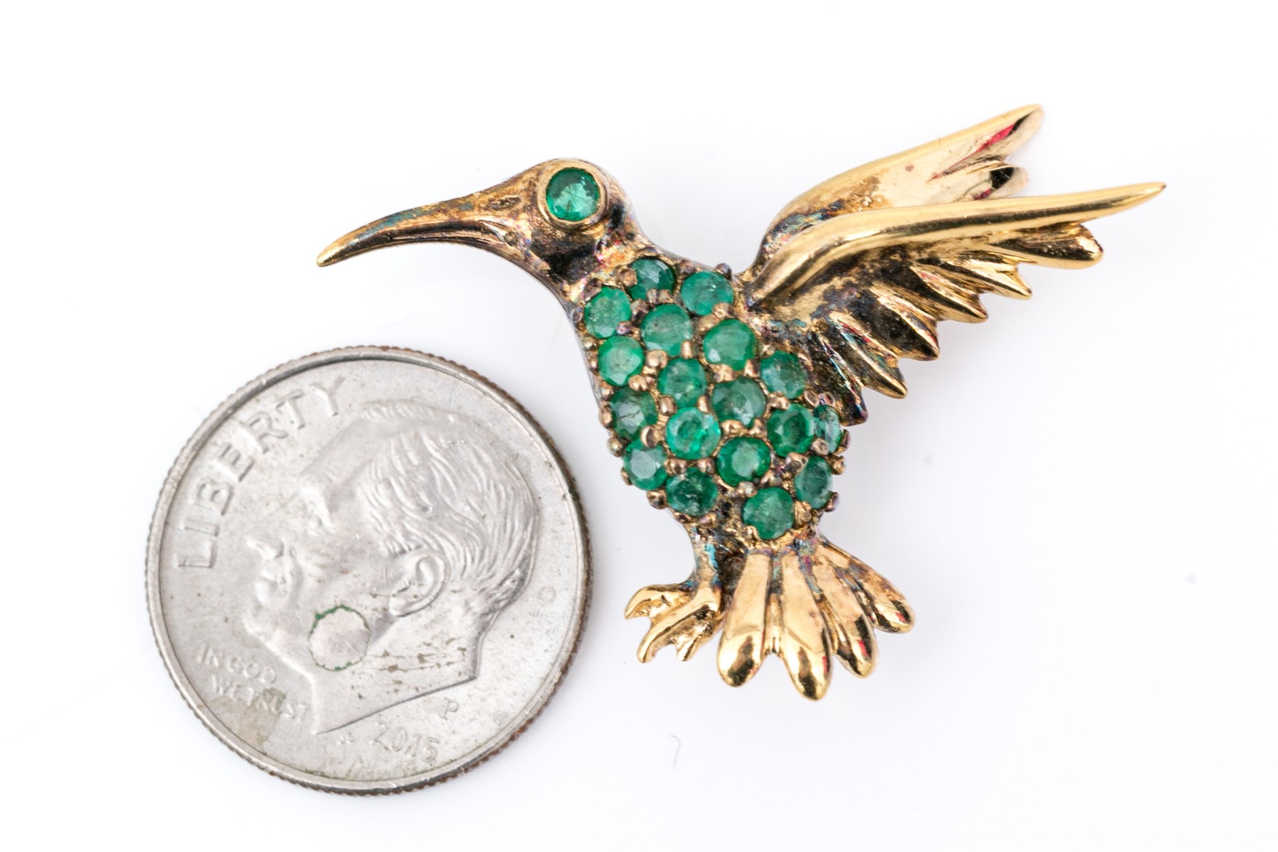 Sterling silver vermeil charming figural hummingbird brooch, set with round faceted emeralds, prong set. Total emerald weight is approximately 0.60 TCW