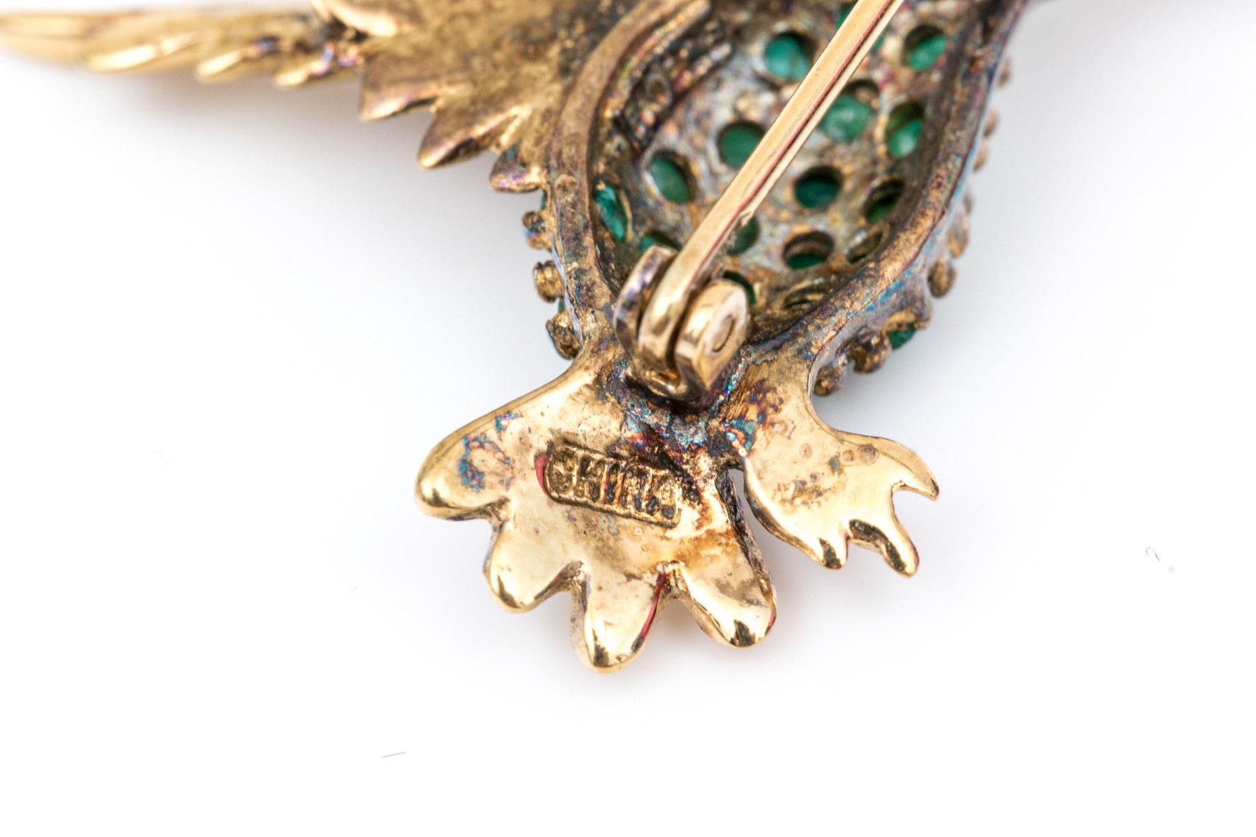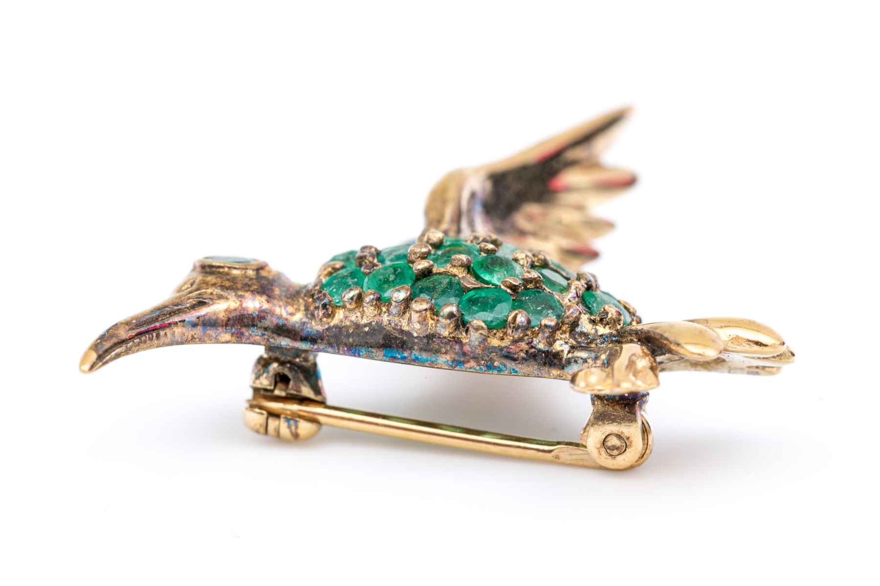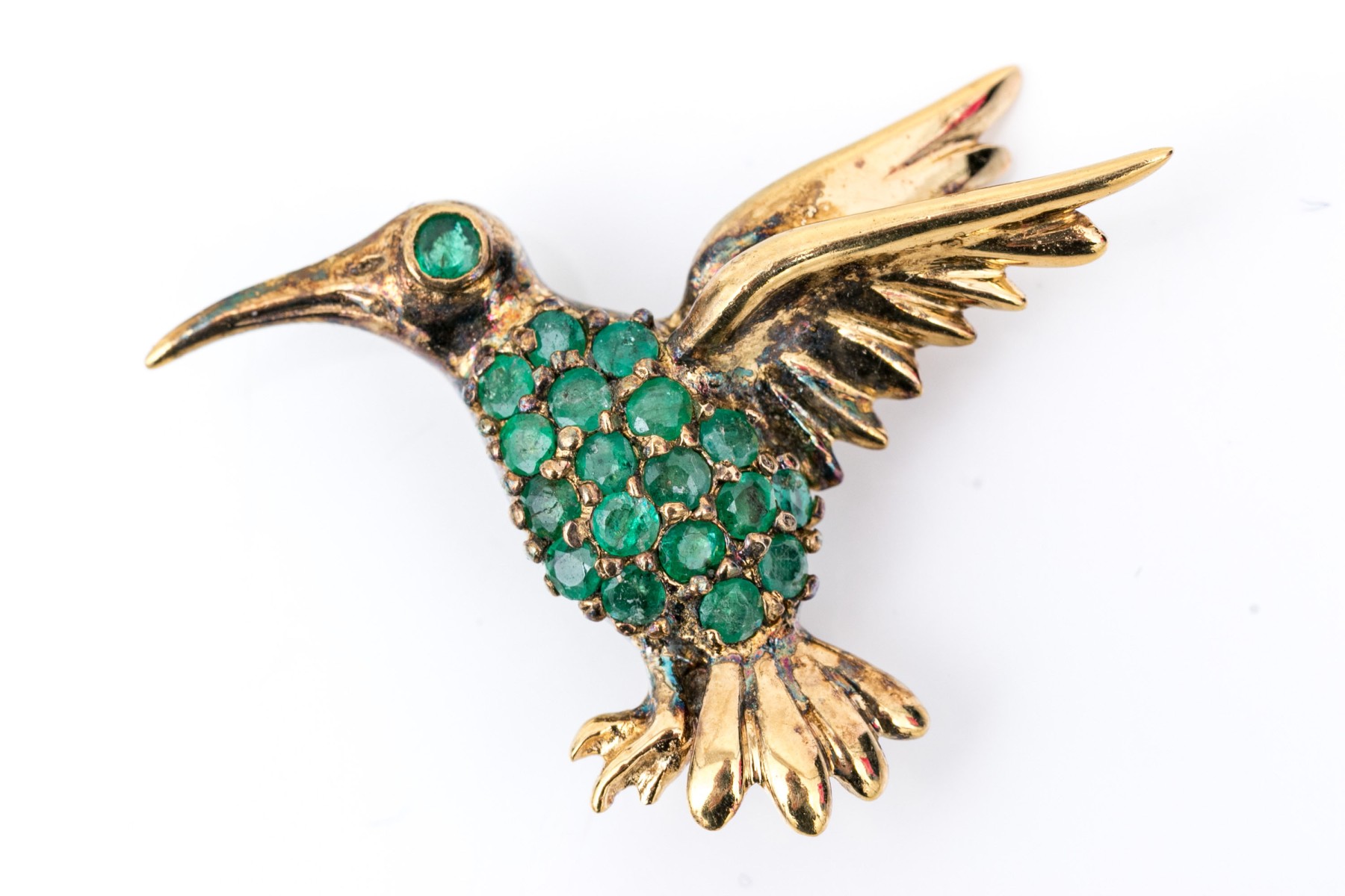 Sterling silver vermeil charming figural hummingbird brooch, set with round faceted emeralds, prong set. Total emerald weight is approximately 0.60 TCW