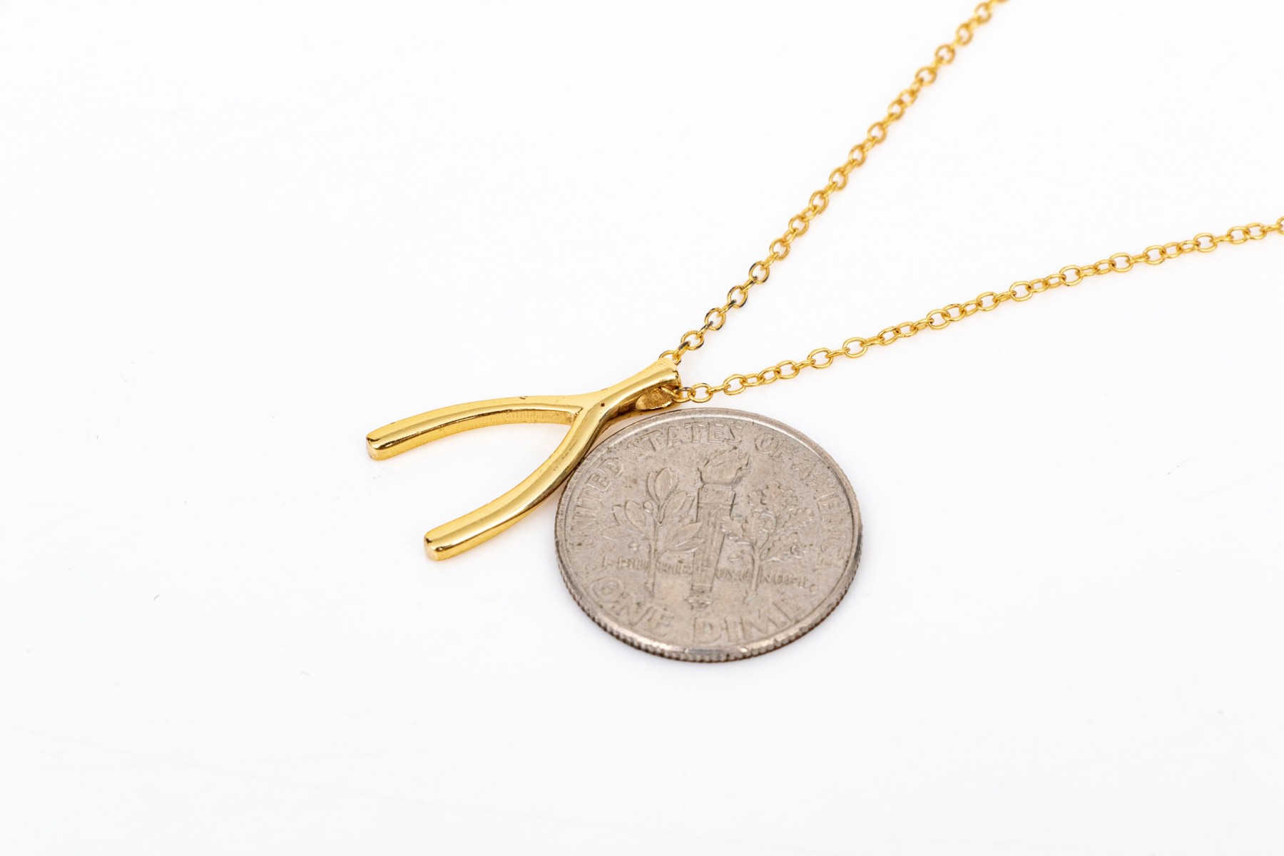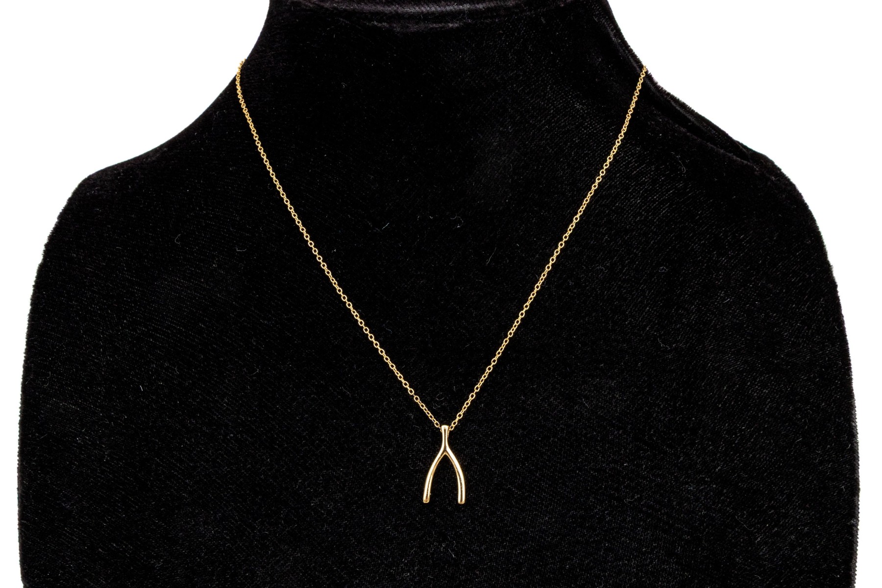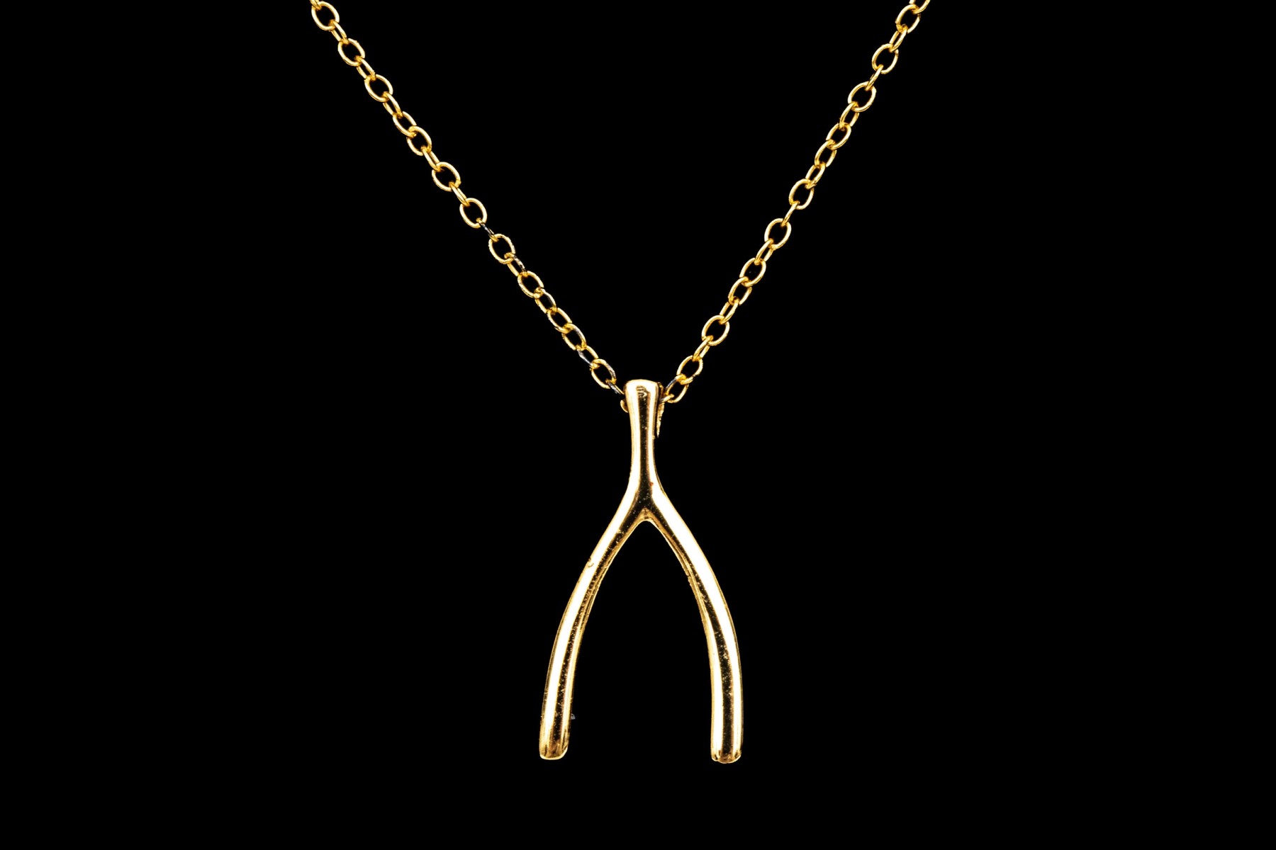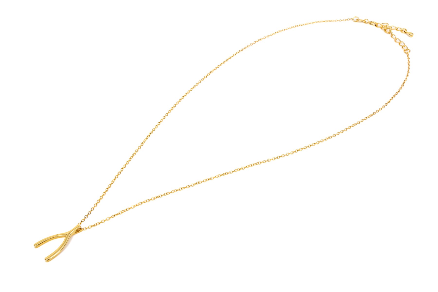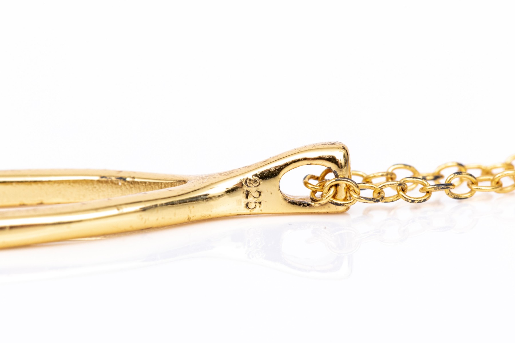 A wishbone motif pendant, made of sterling silver vermeil, displayed on a fine sterling silver vermeil curb chain, finished with a spring ring style clasp