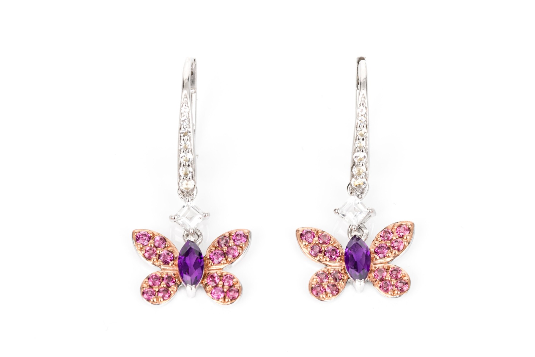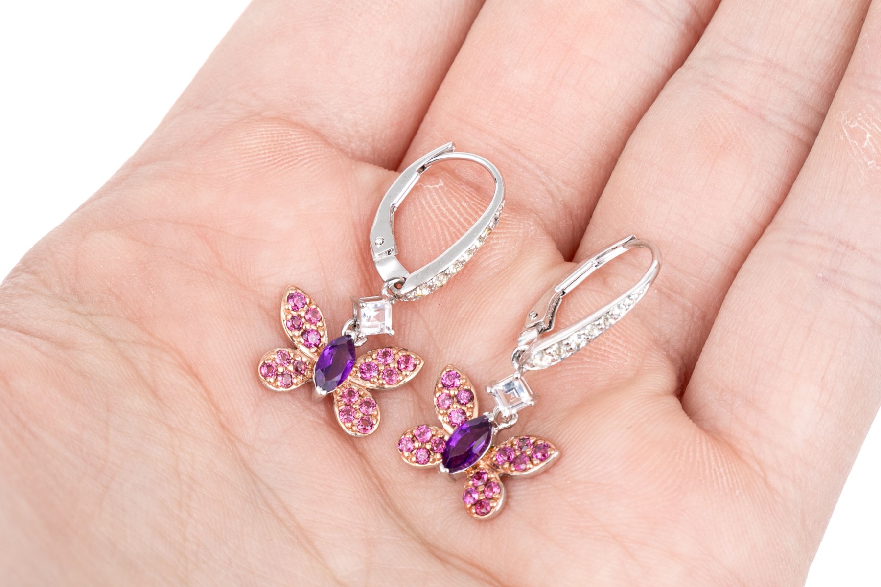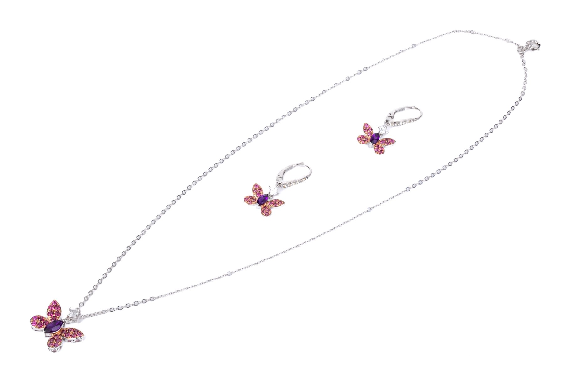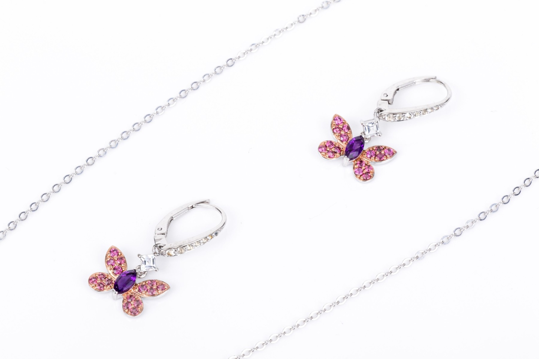 Sterling silver whimsical butterfly necklace and matching earrings, set with amethysts, purple cz stones and white quartz. Earrings are finished with wires and lever style backs; pendant is displayed on a cable chain with a spring ring style clasp