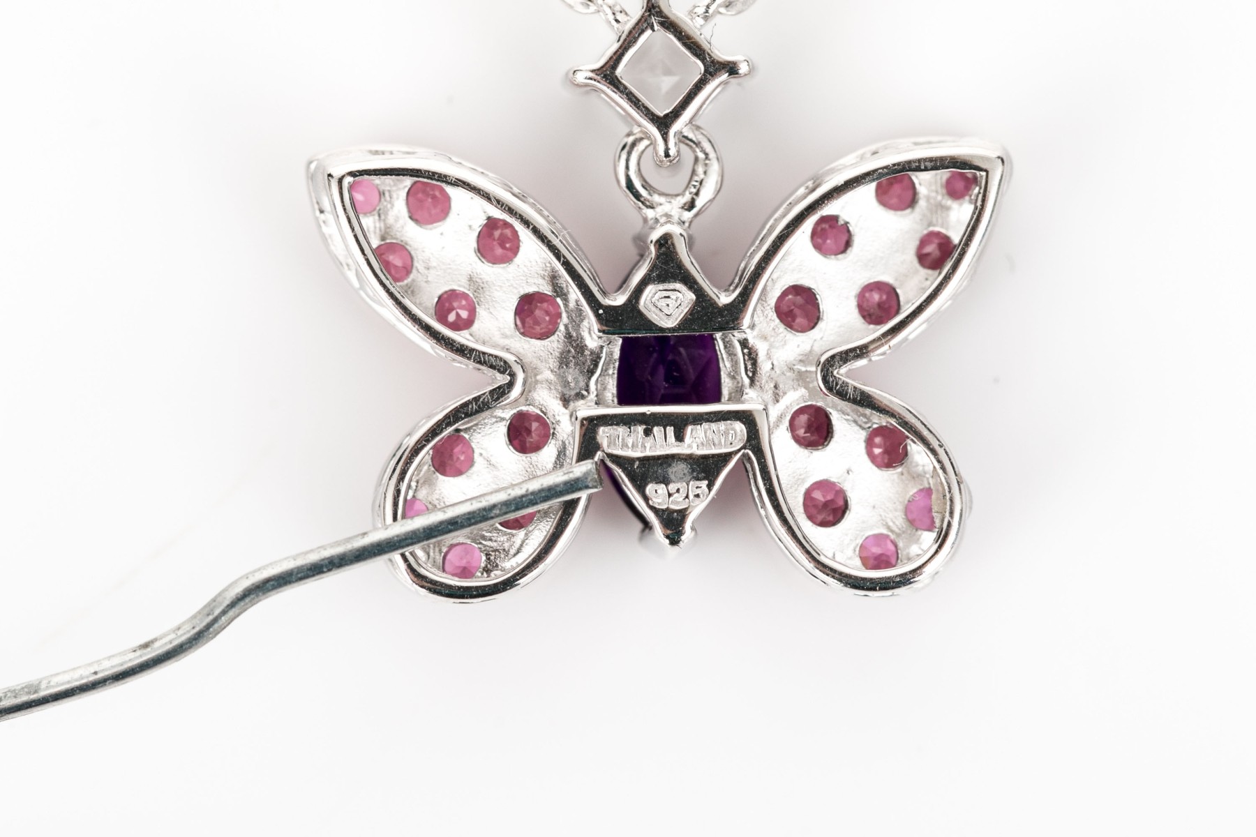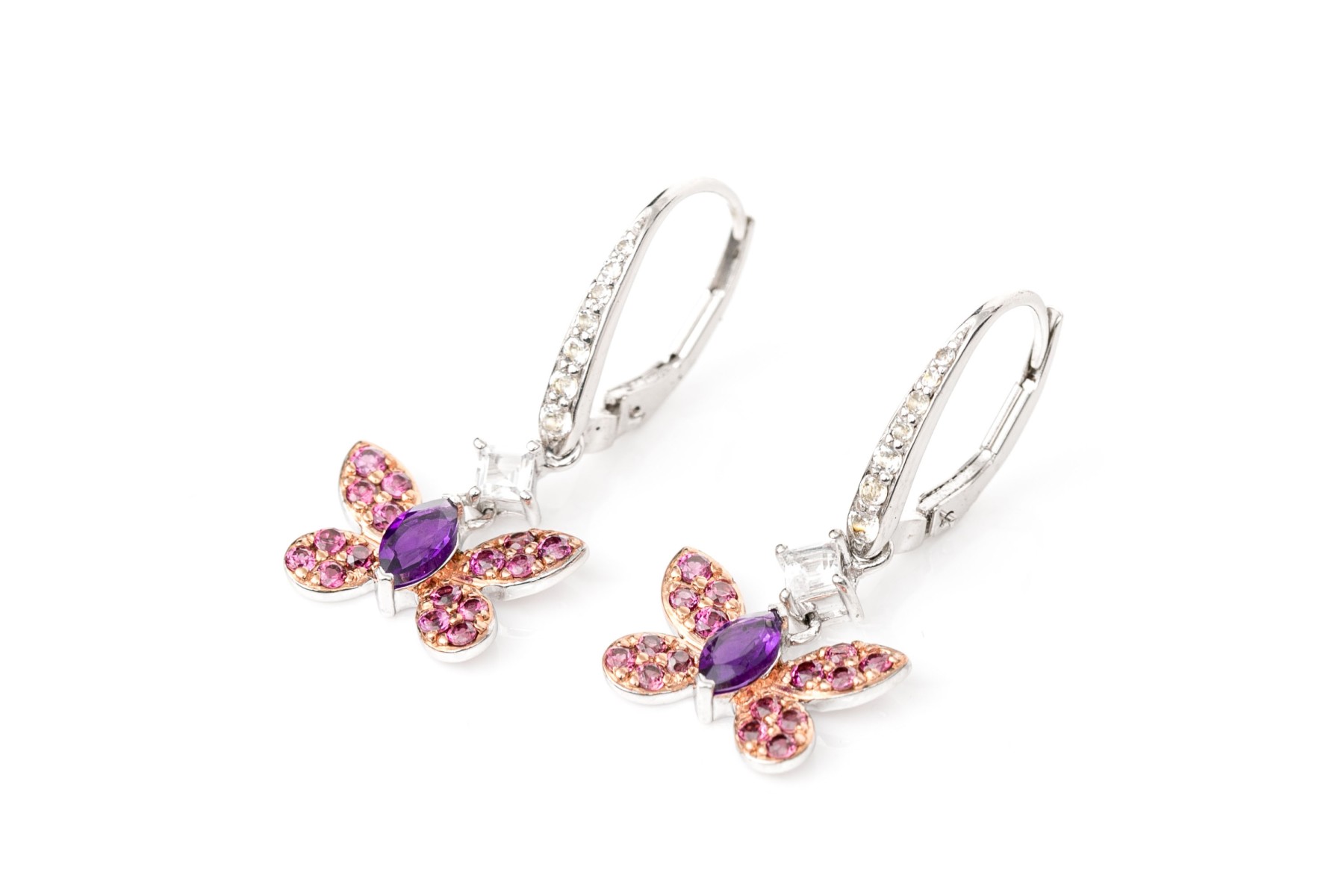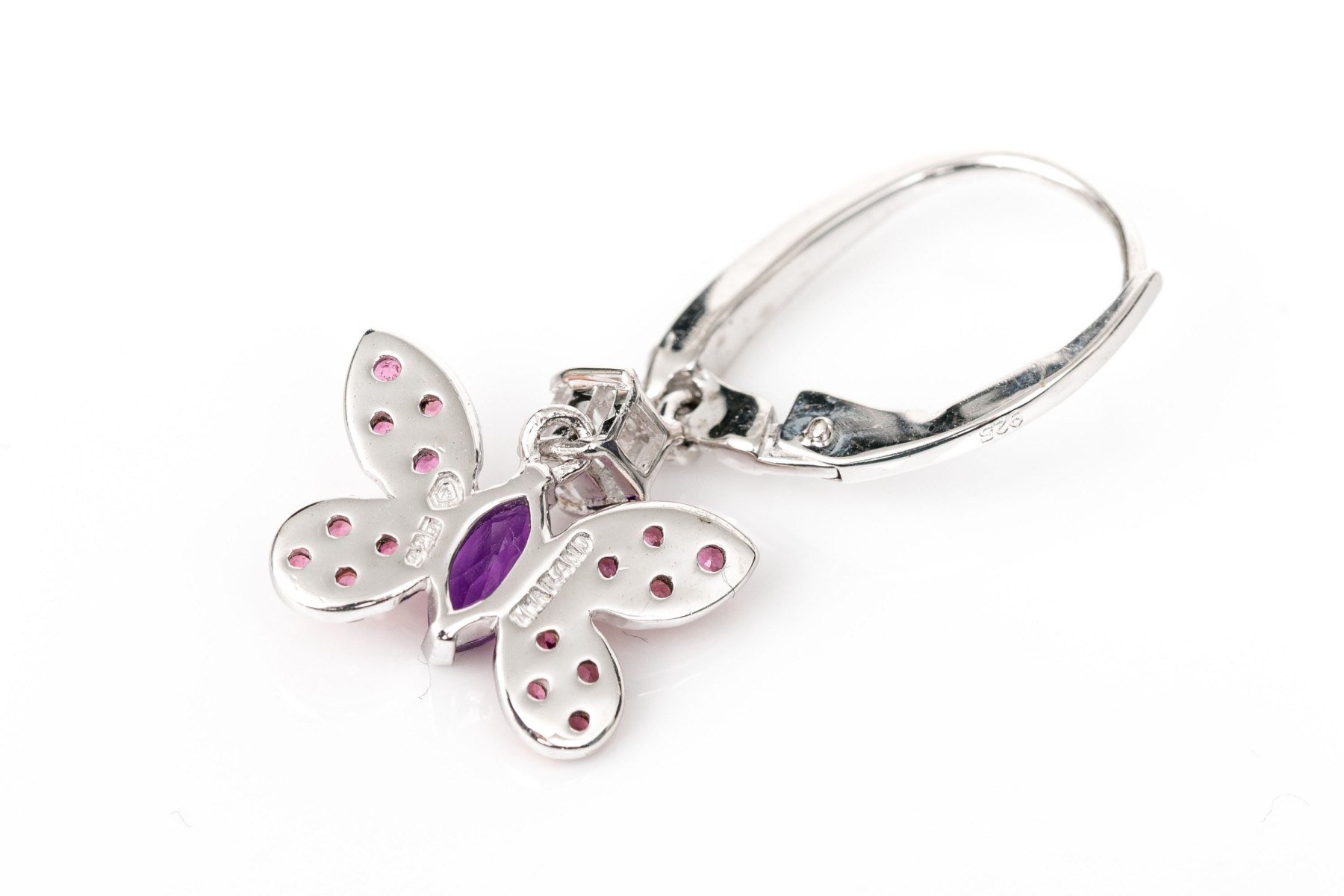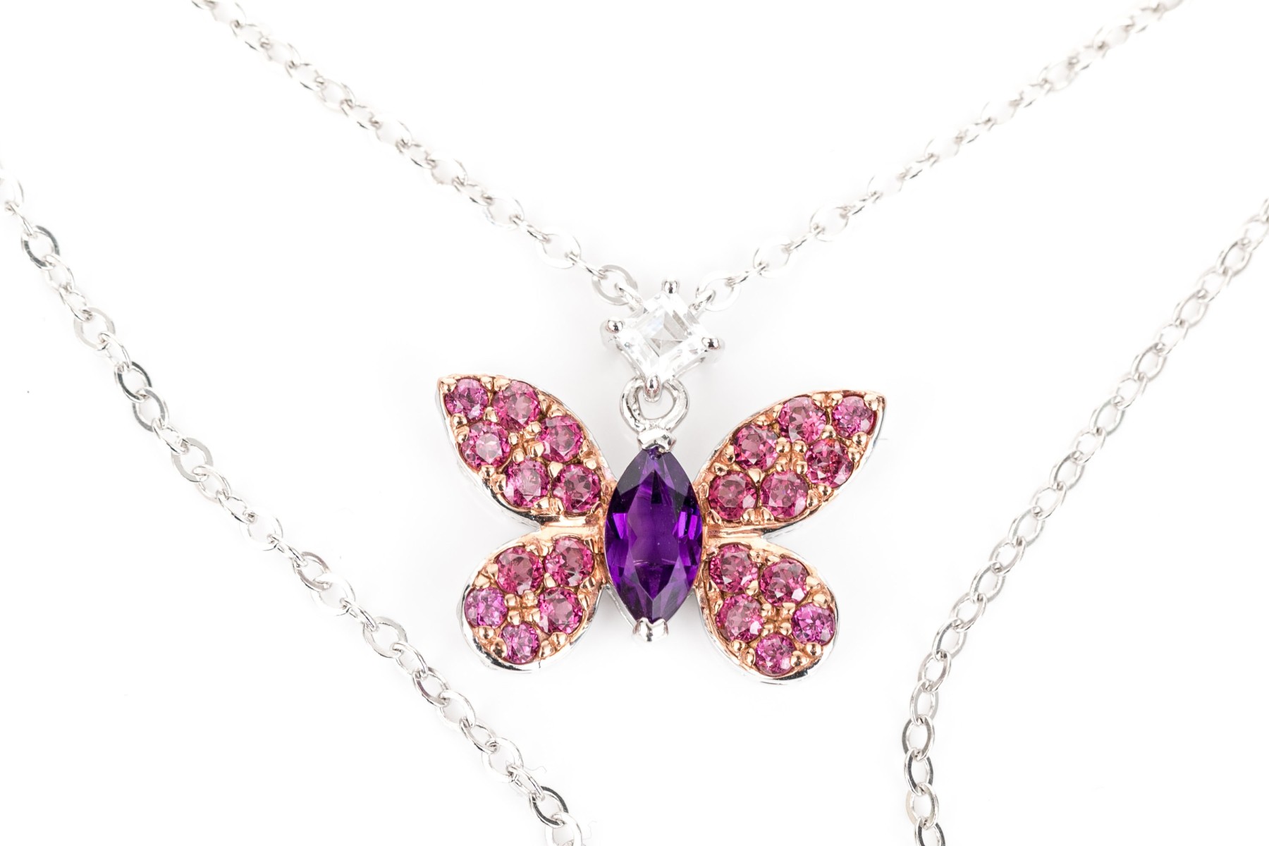 Sterling silver whimsical butterfly necklace and matching earrings, set with amethysts, purple cz stones and white quartz. Earrings are finished with wires and lever style backs; pendant is displayed on a cable chain with a spring ring style clasp