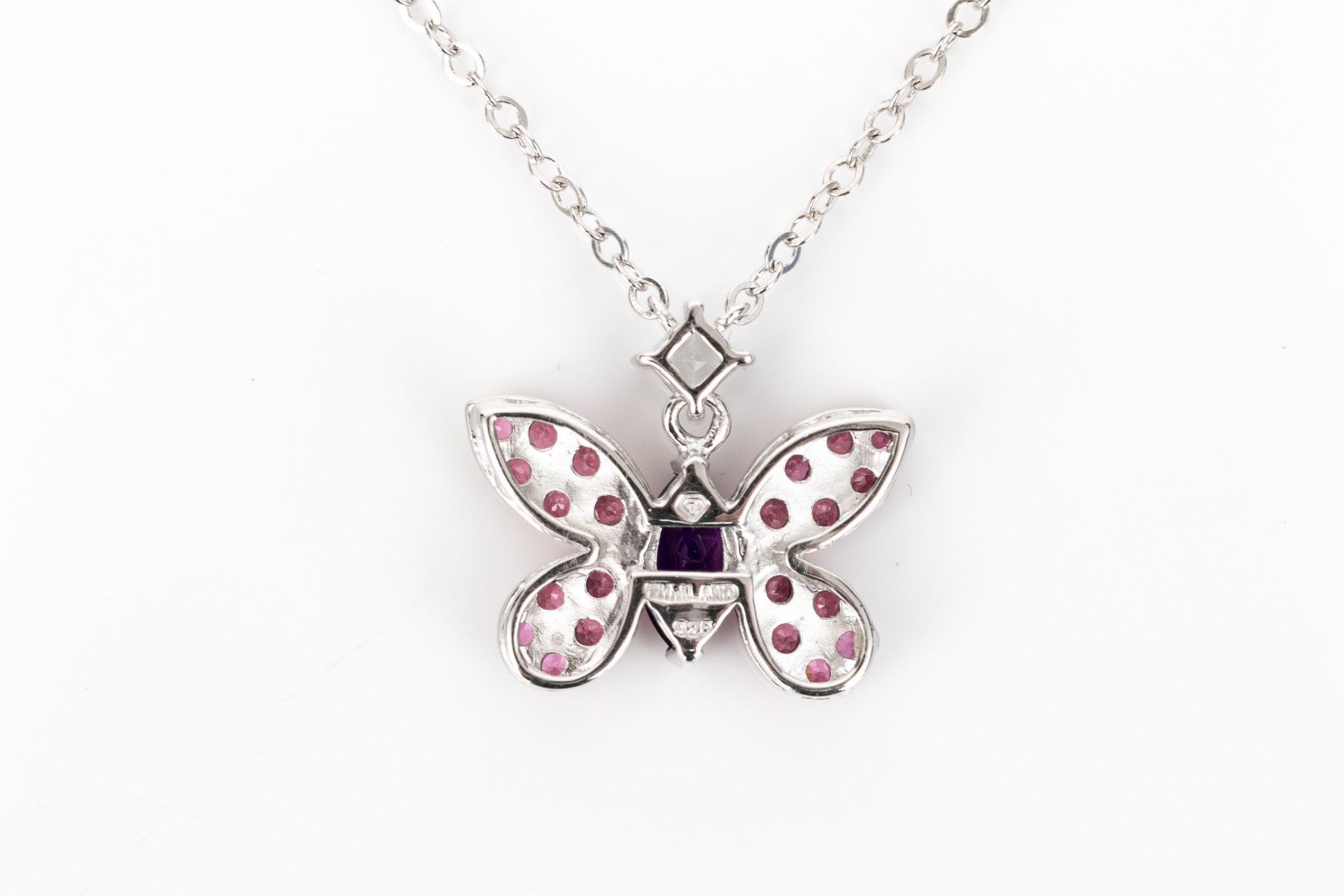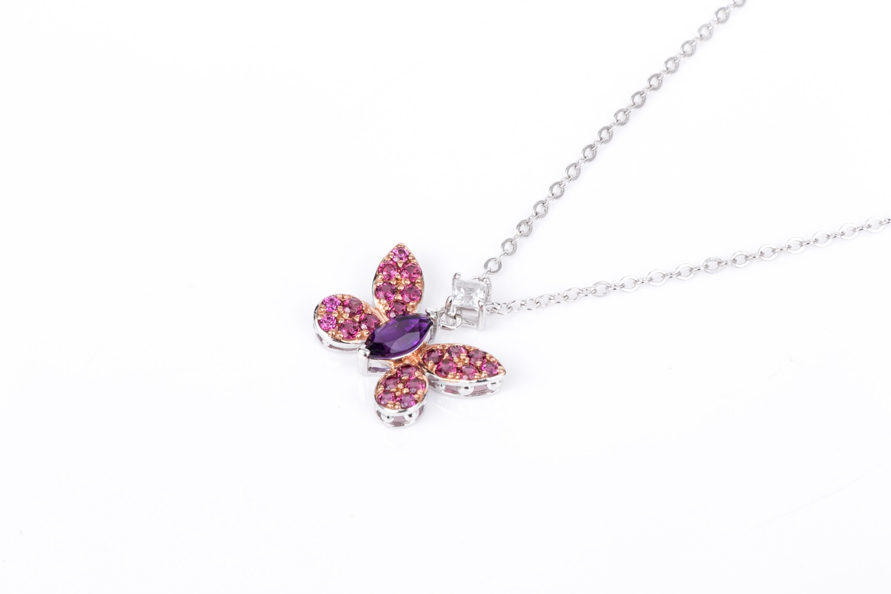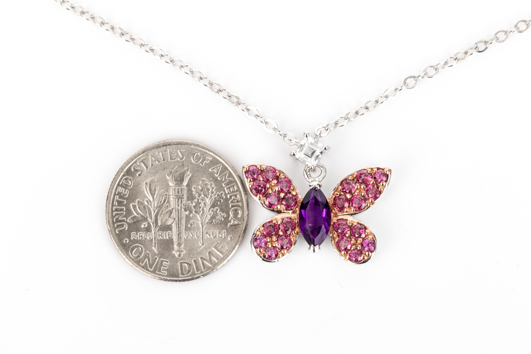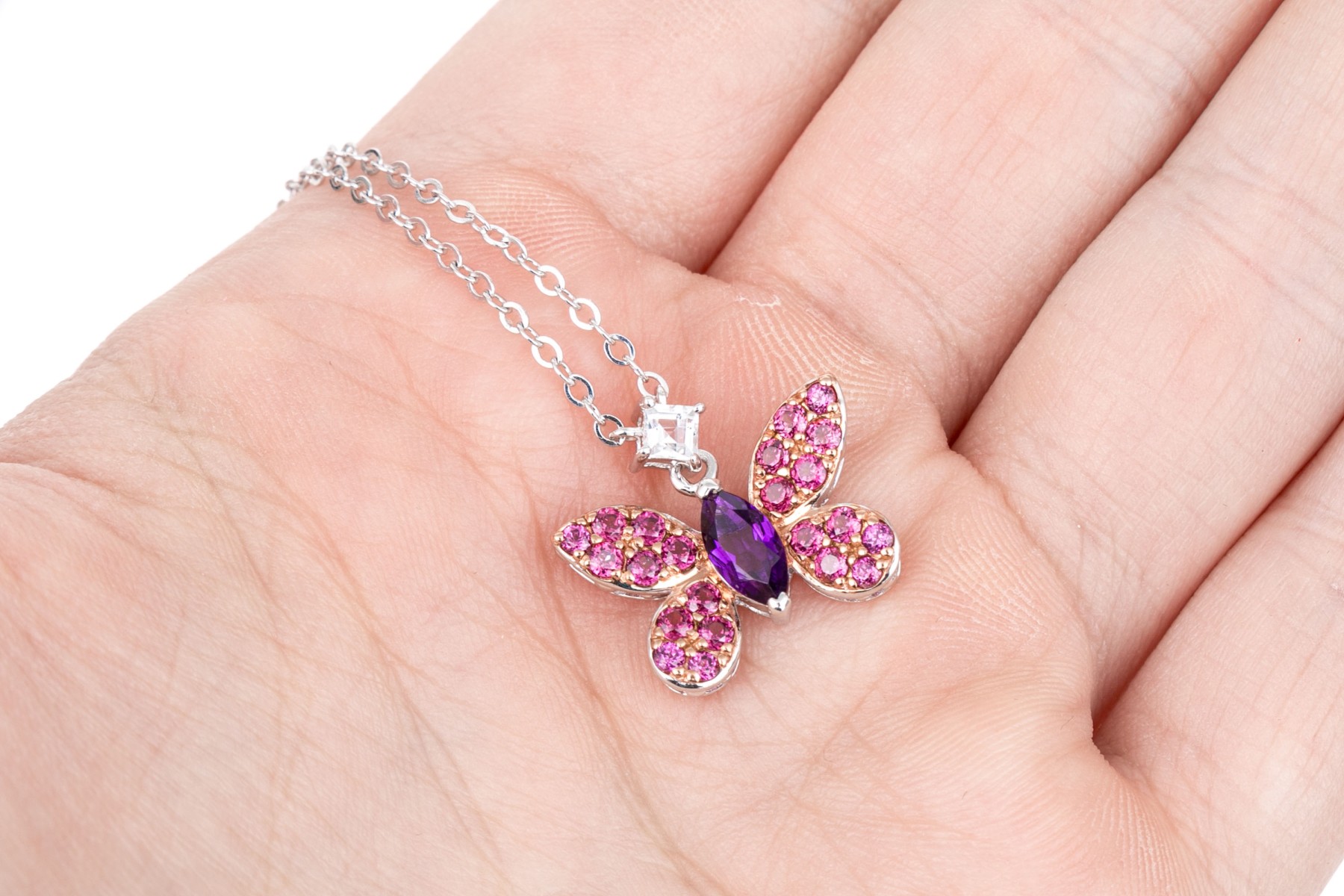 Sterling silver whimsical butterfly necklace and matching earrings, set with amethysts, purple cz stones and white quartz. Earrings are finished with wires and lever style backs; pendant is displayed on a cable chain with a spring ring style clasp