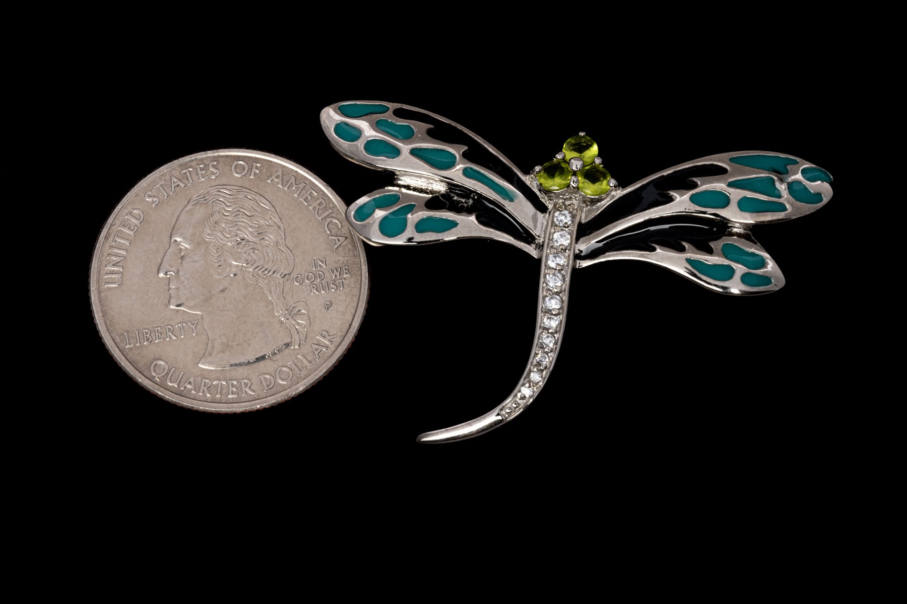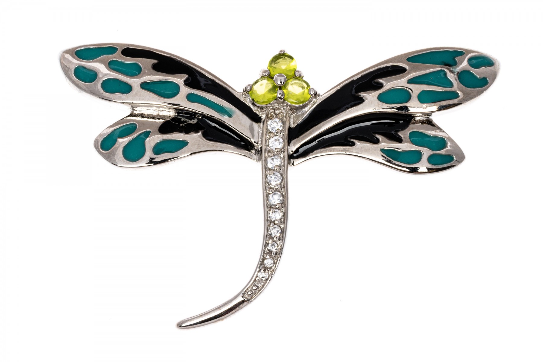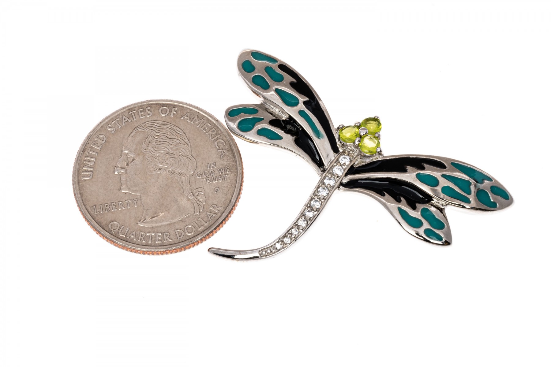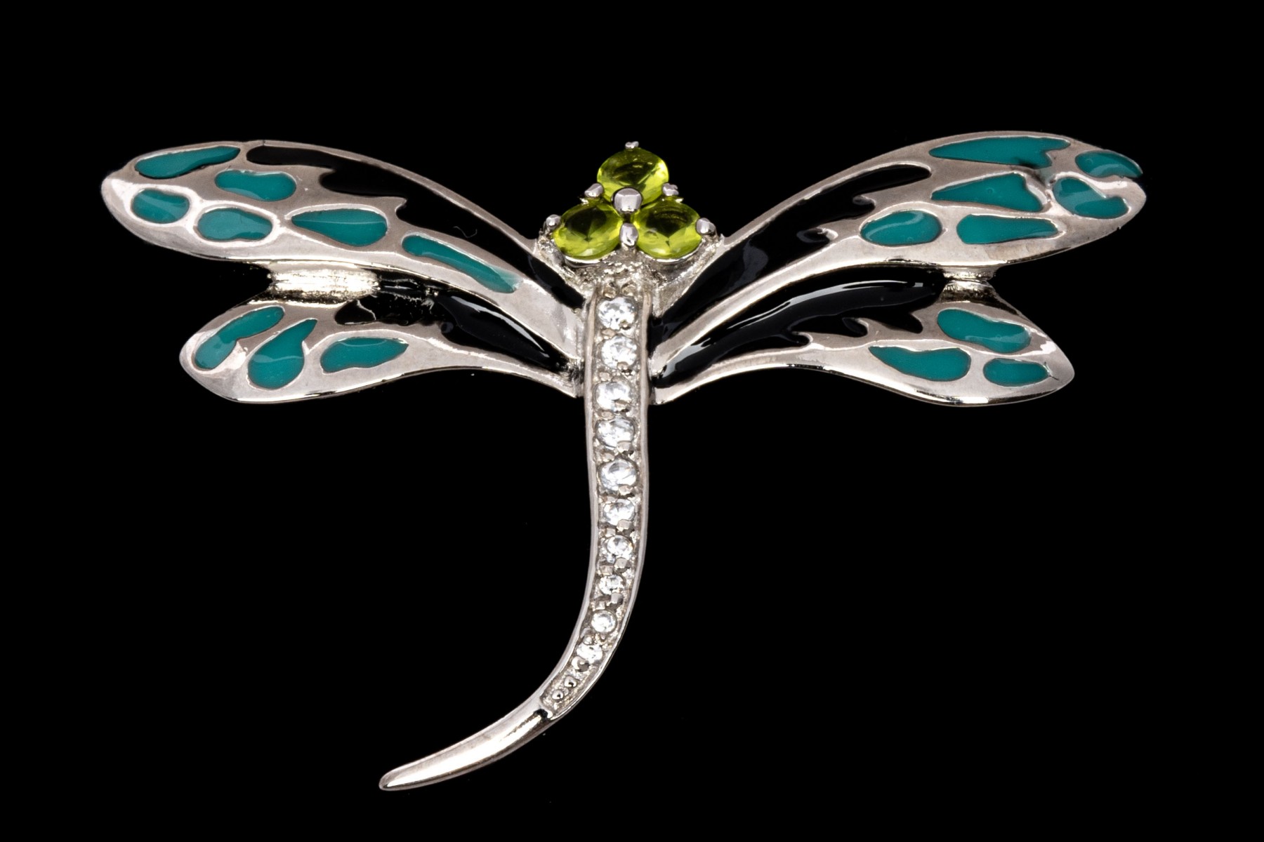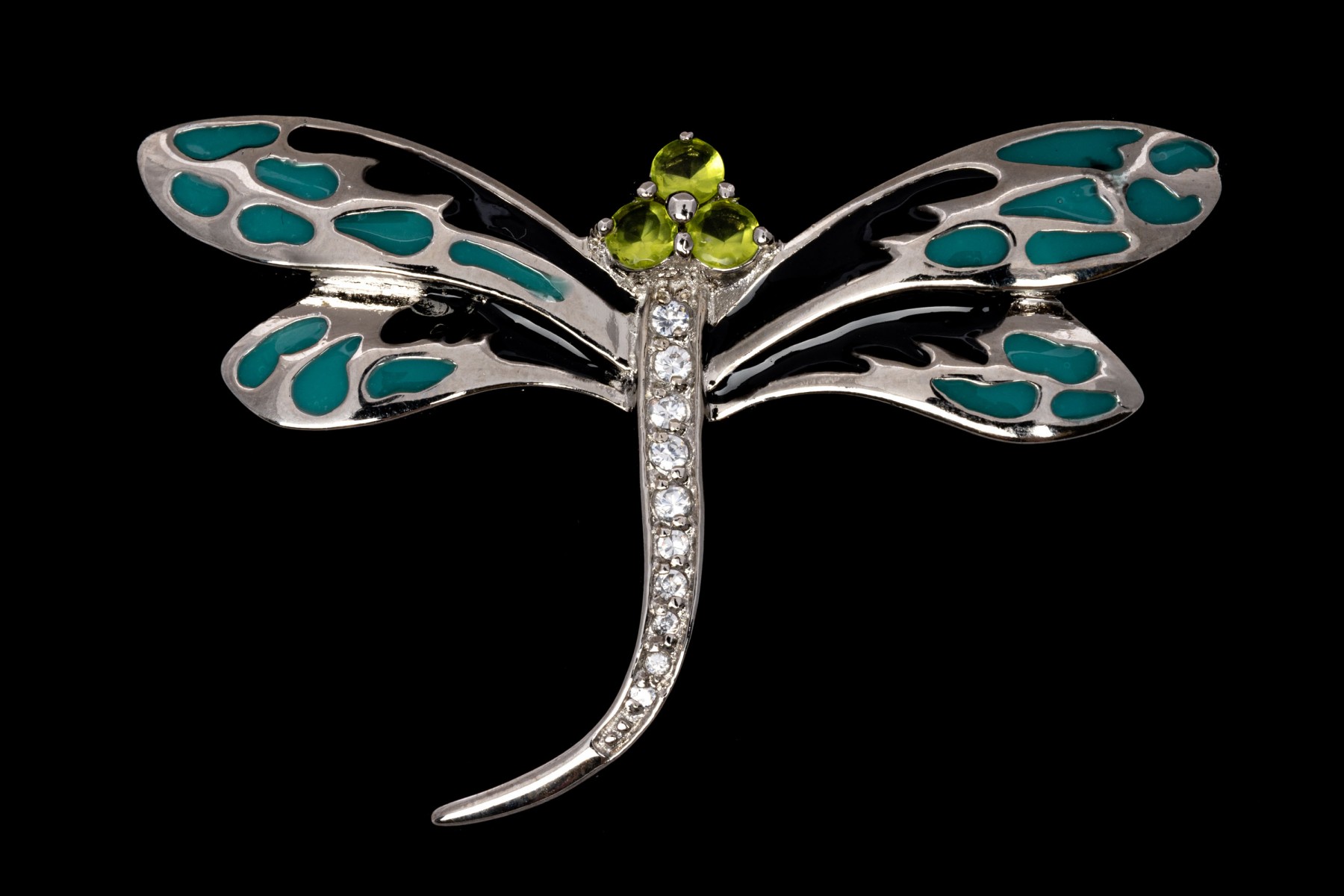 Sterling silver pin. This whimsical pin is a figural dragonfly, set with black and teal colored enamel wings, a round brilliant cut, prong set, cz body, and a clustered round faceted, chartreuse green stone head.