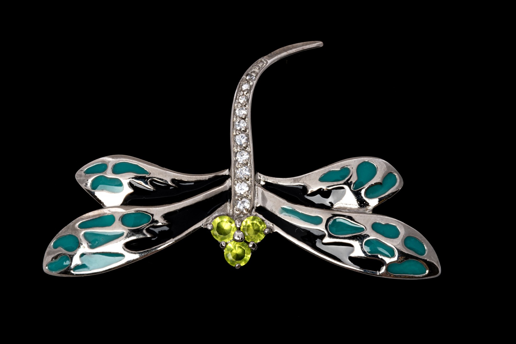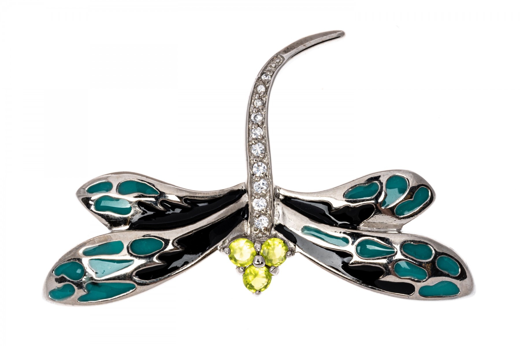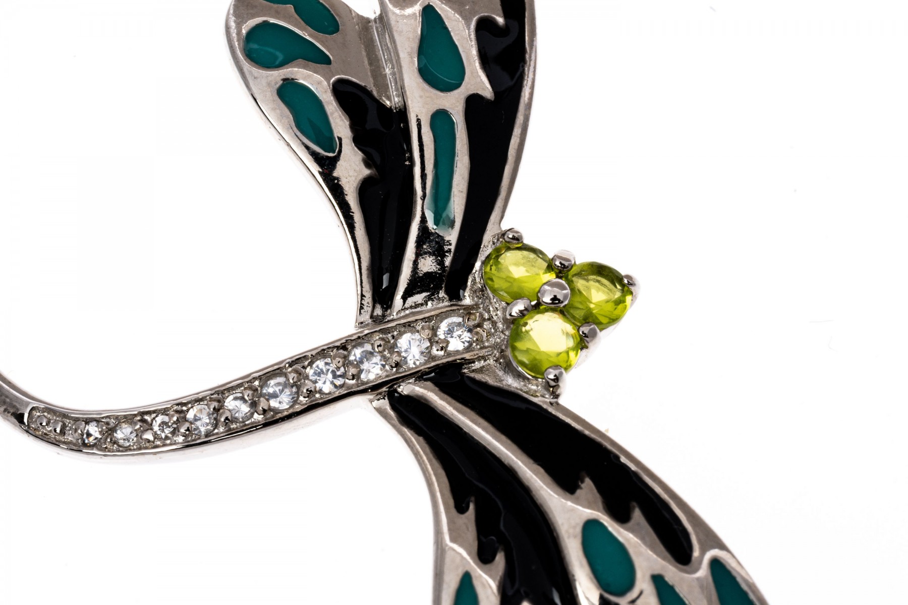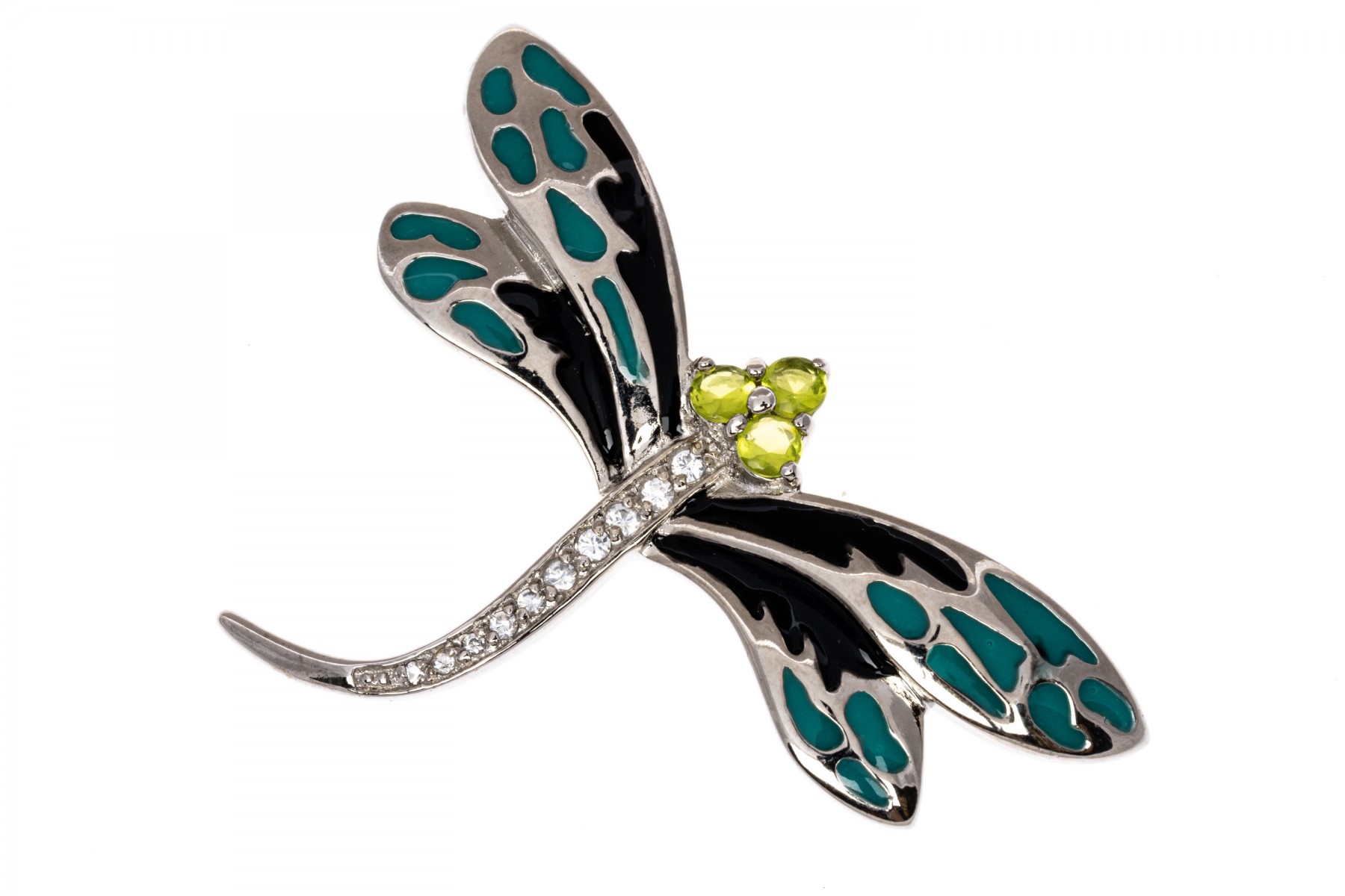 Sterling silver pin. This whimsical pin is a figural dragonfly, set with black and teal colored enamel wings, a round brilliant cut, prong set, cz body, and a clustered round faceted, chartreuse green stone head.