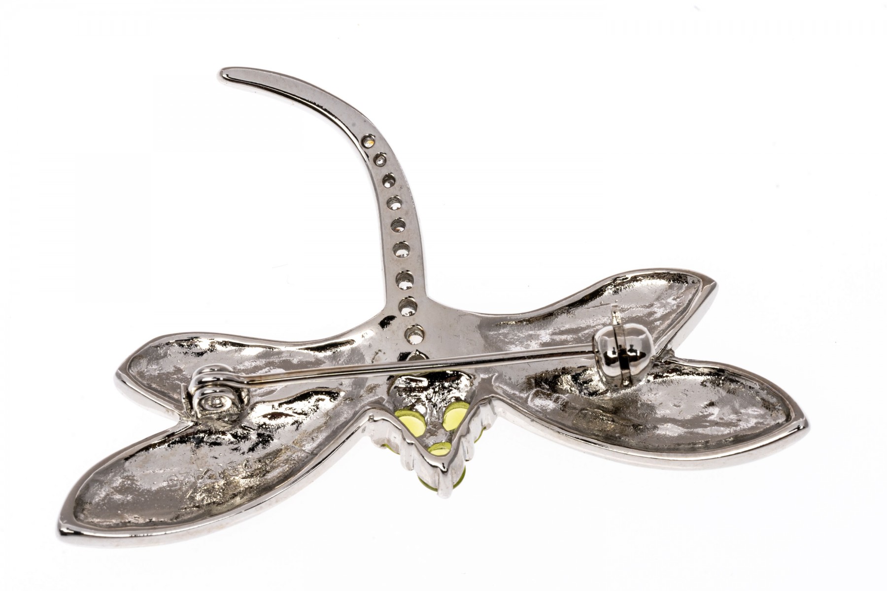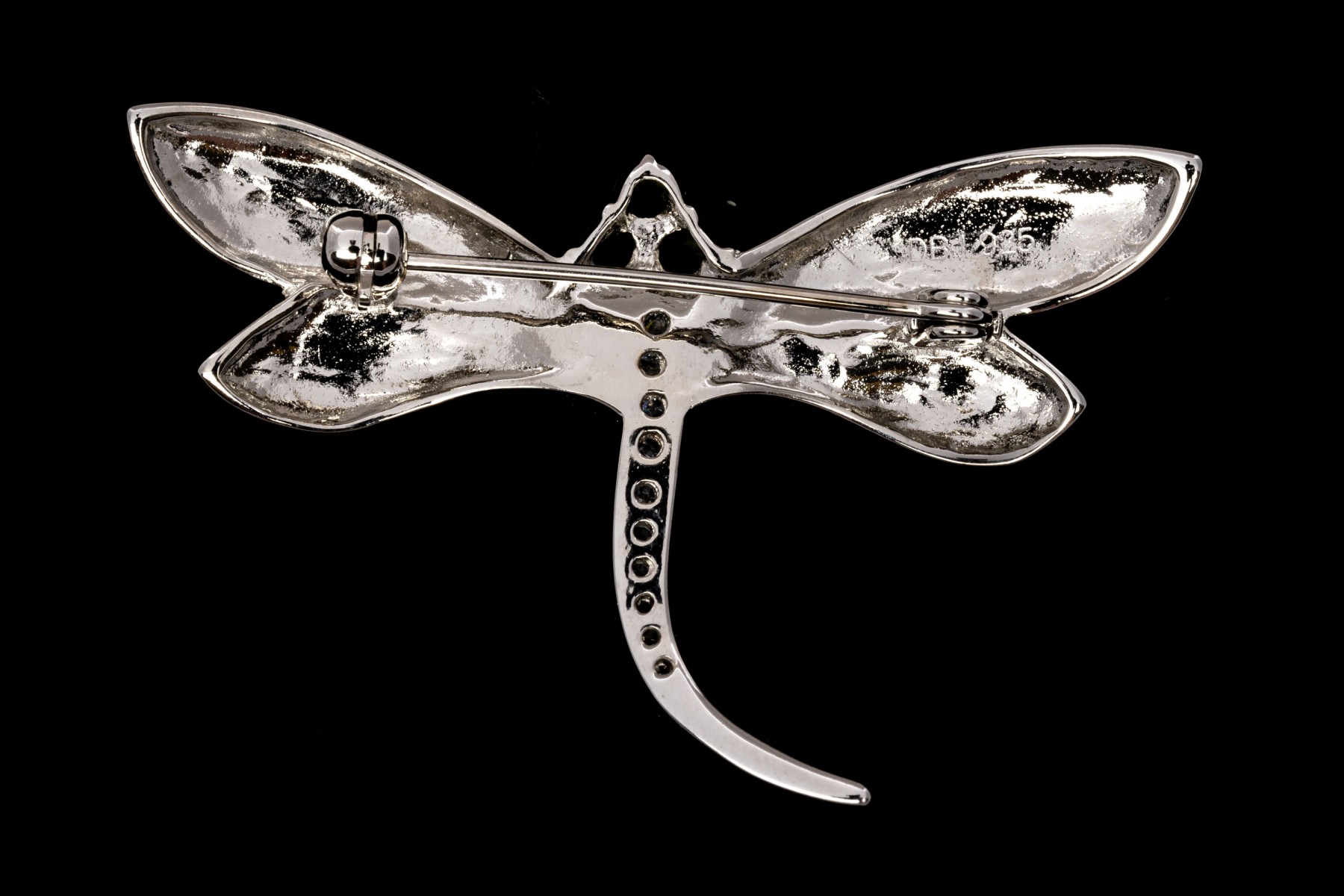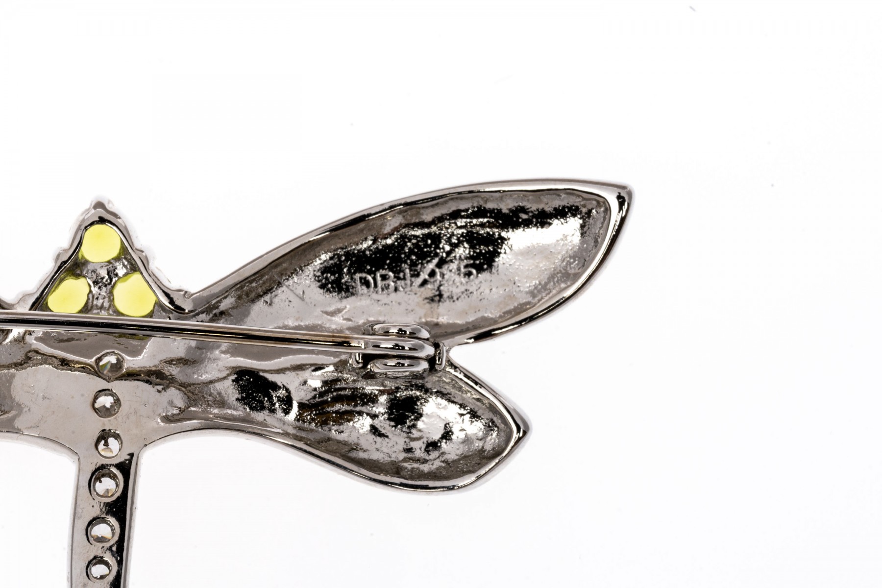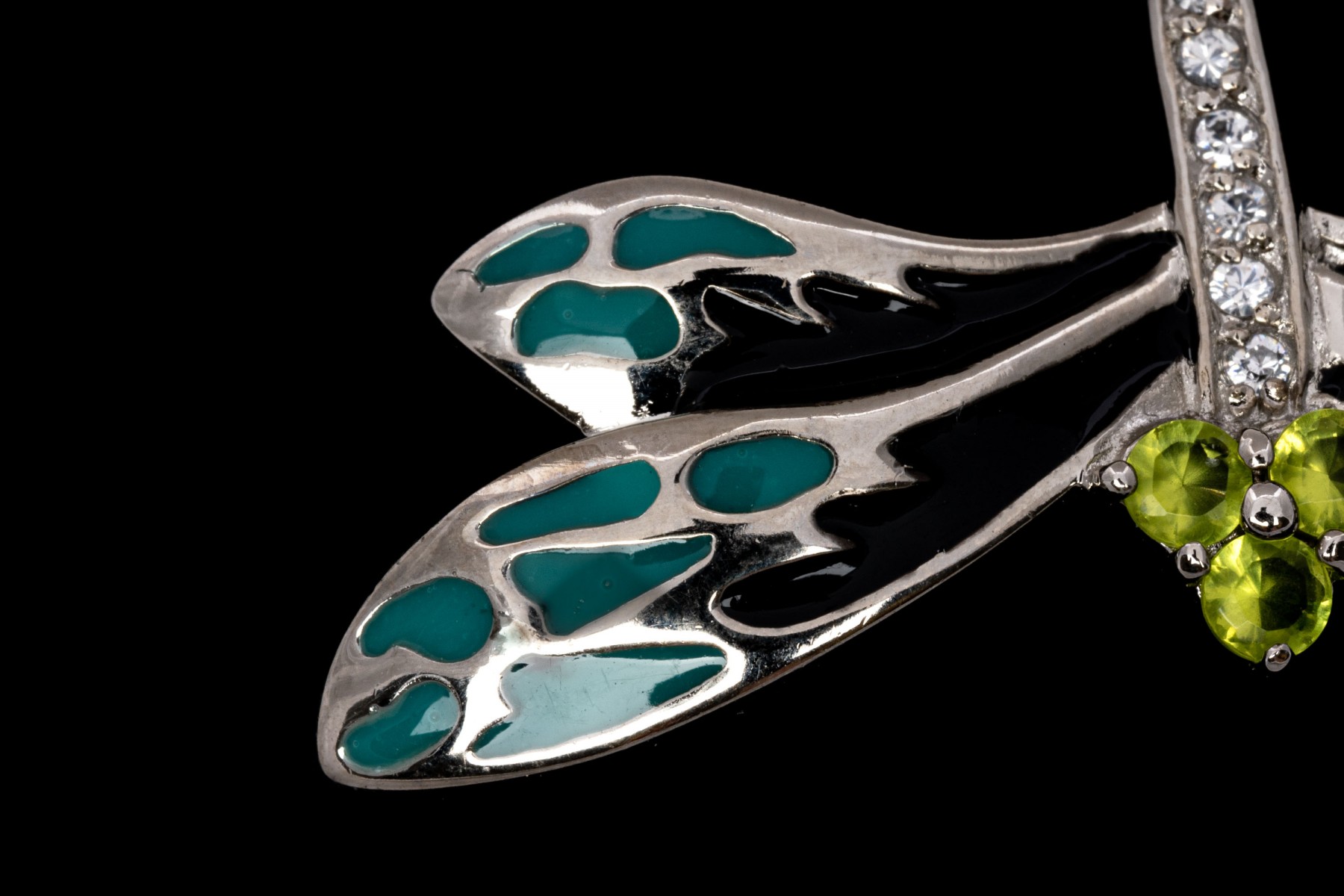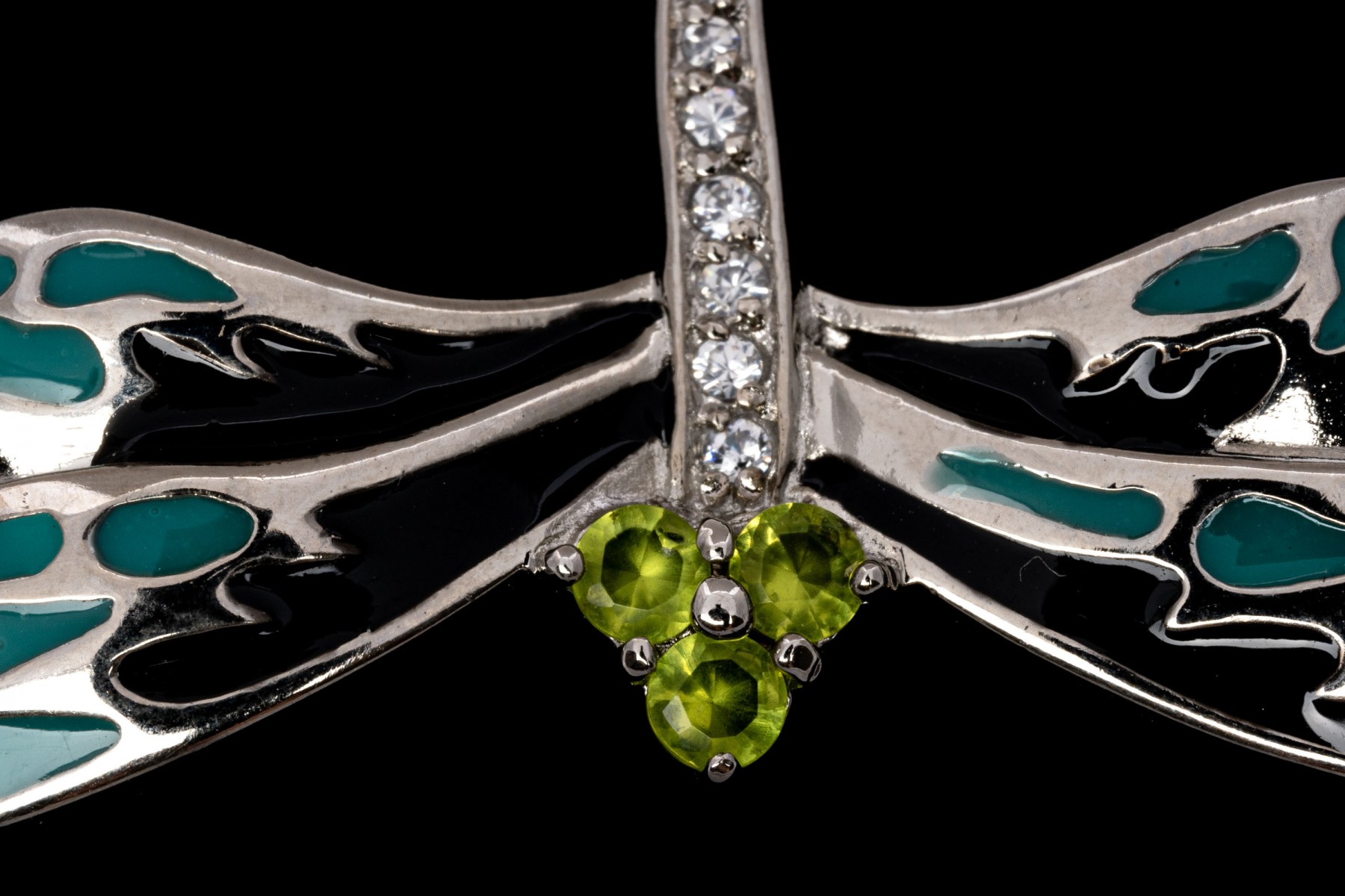 Sterling silver pin. This whimsical pin is a figural dragonfly, set with black and teal colored enamel wings, a round brilliant cut, prong set, cz body, and a clustered round faceted, chartreuse green stone head.