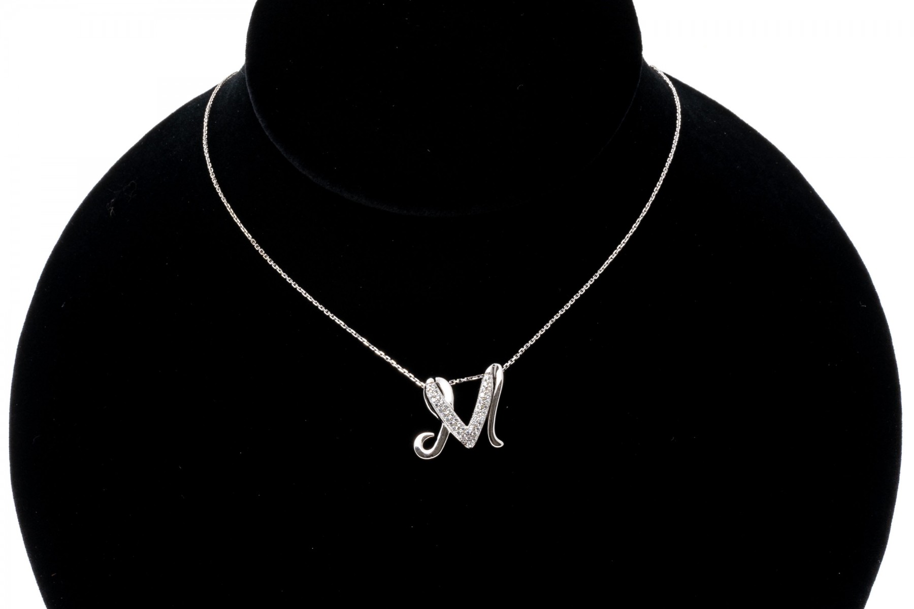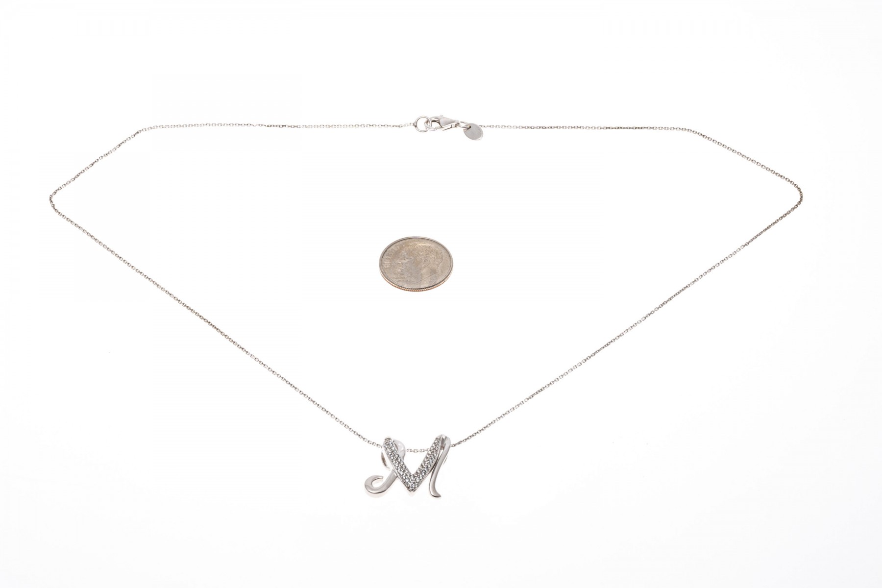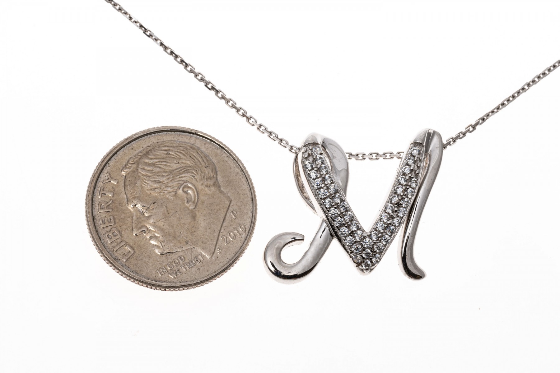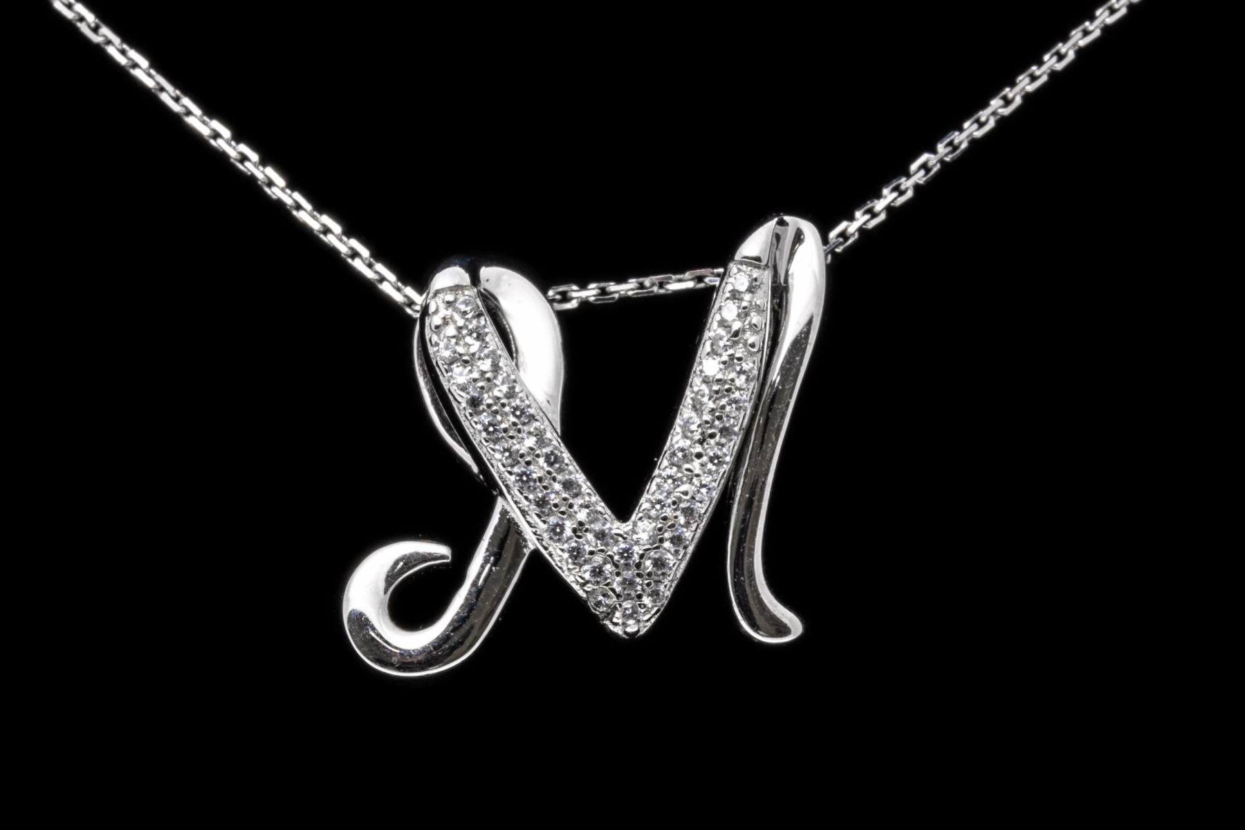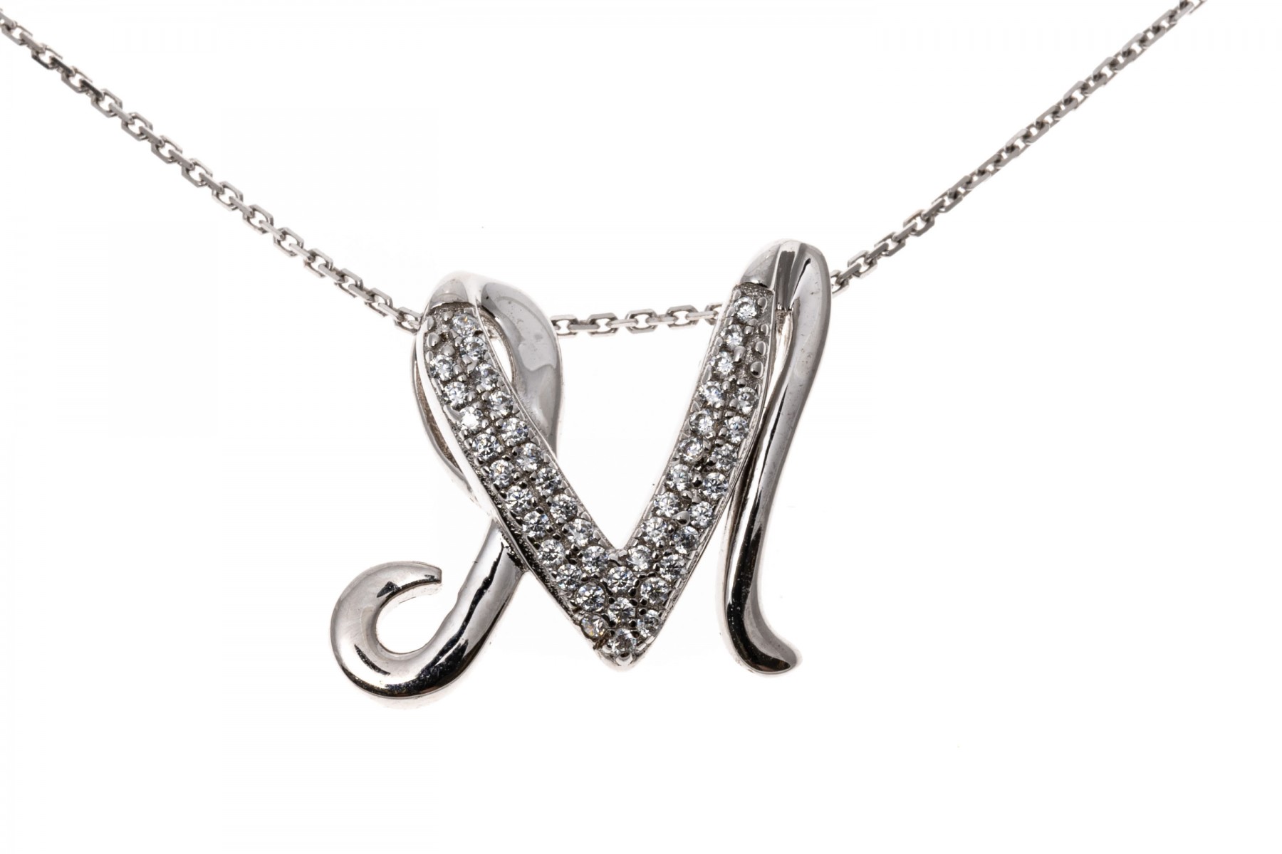 Sterling silver necklace. This whimsical sterling silver pendant necklace is a script "M" initial pendant, decorated with round faceted cz stones, pave set. The pendant is suspended from a fine curb link style chain, with a lobster claw style clasp.