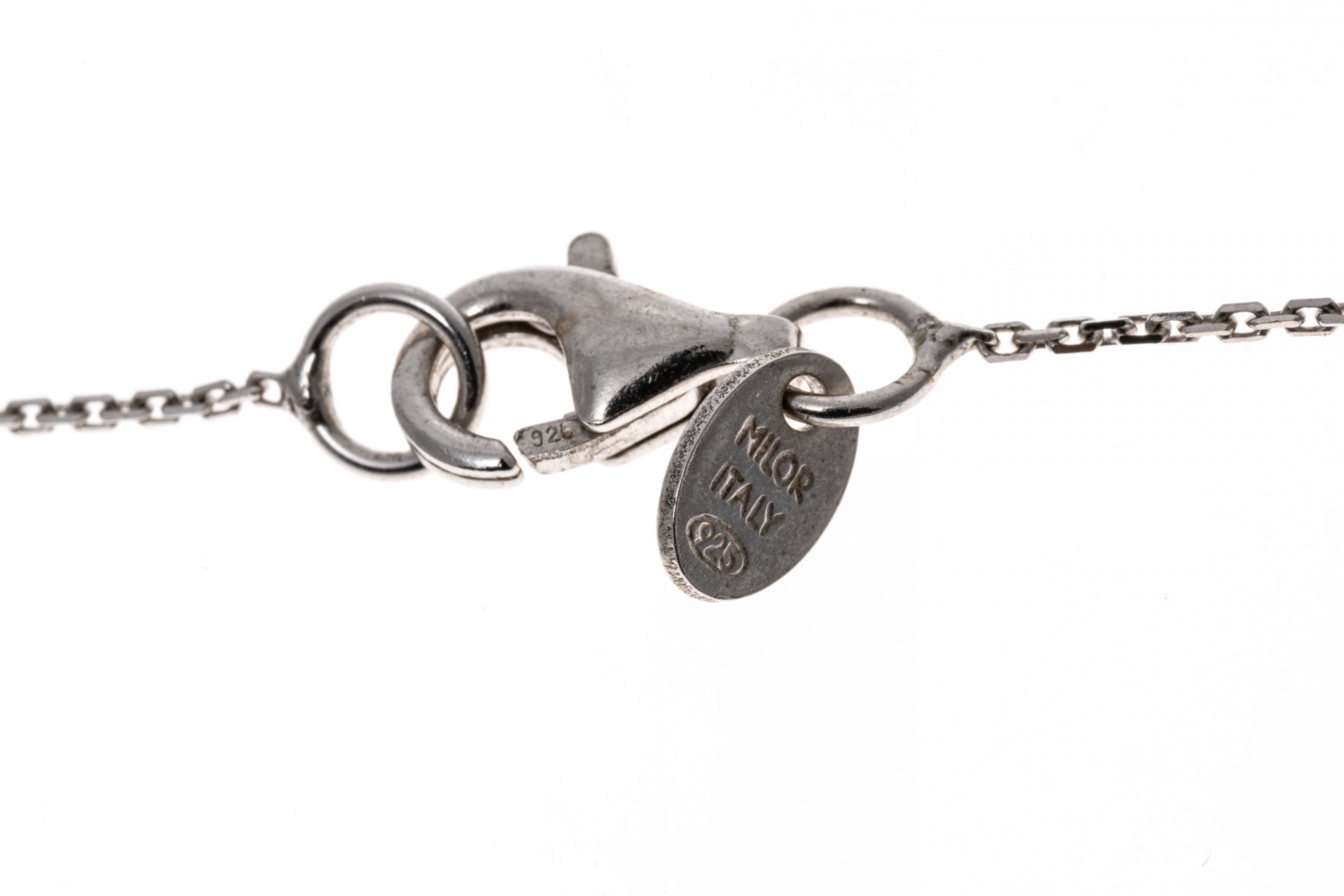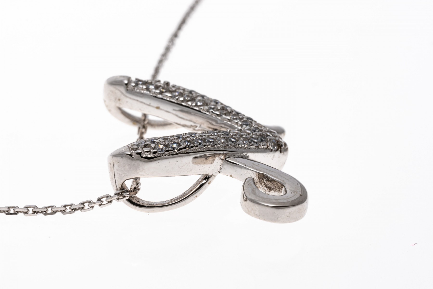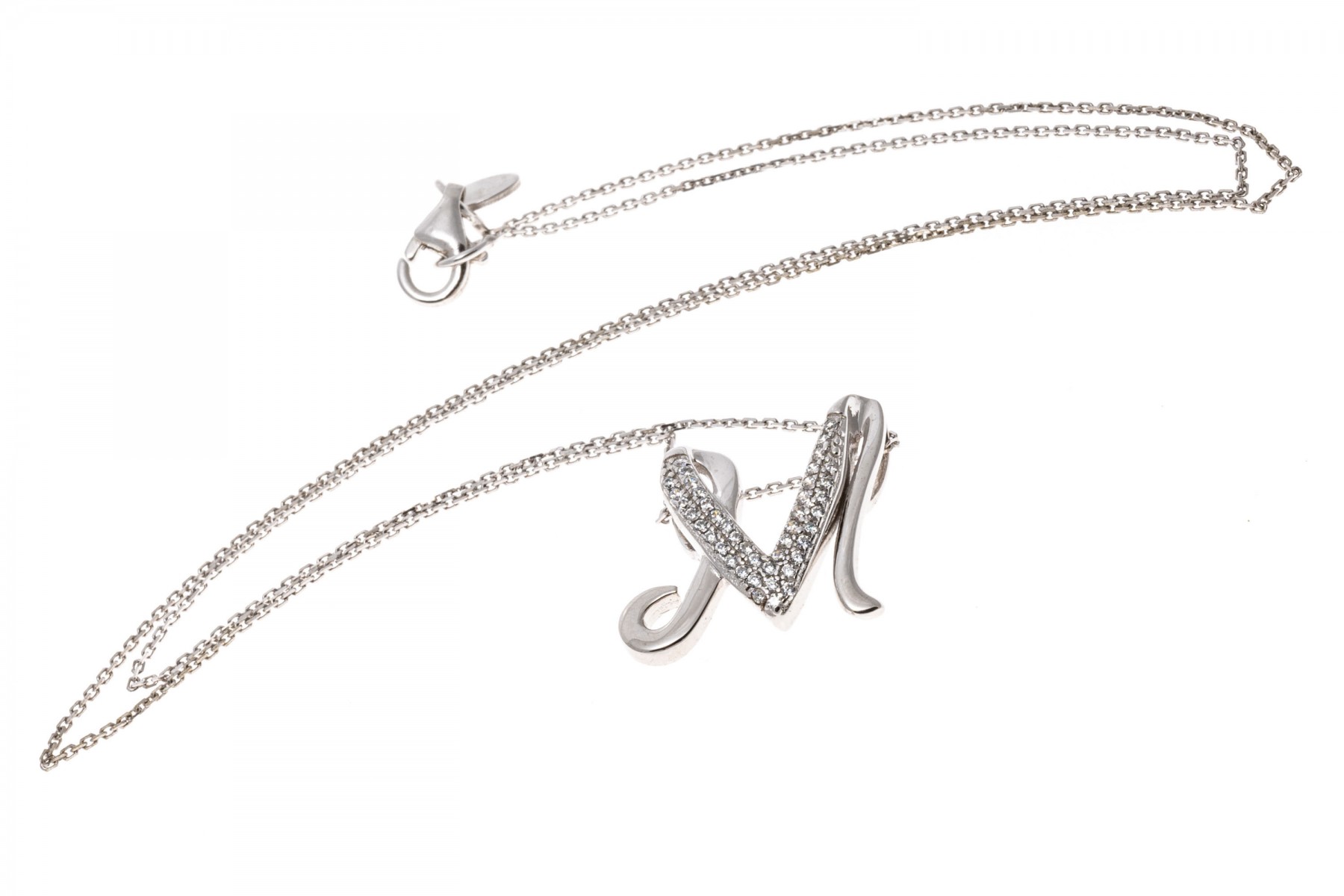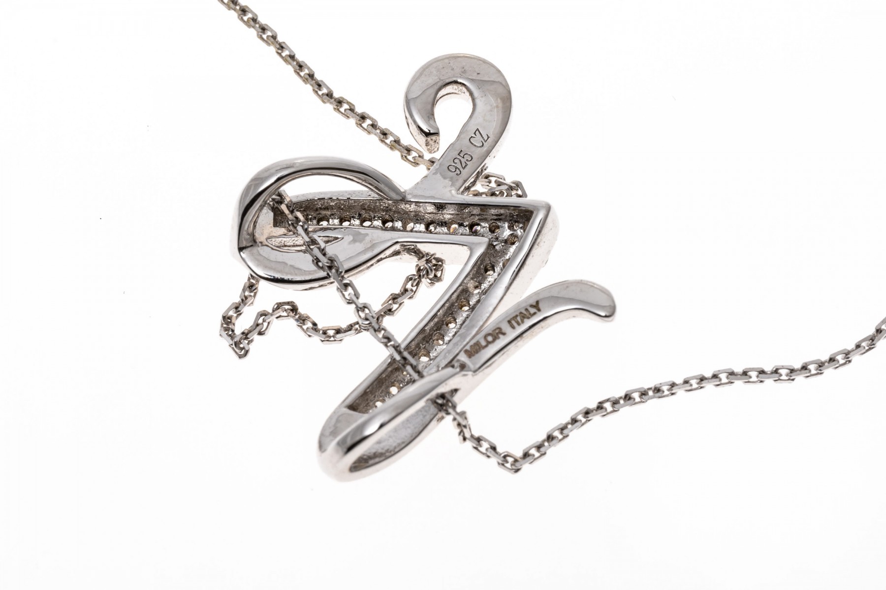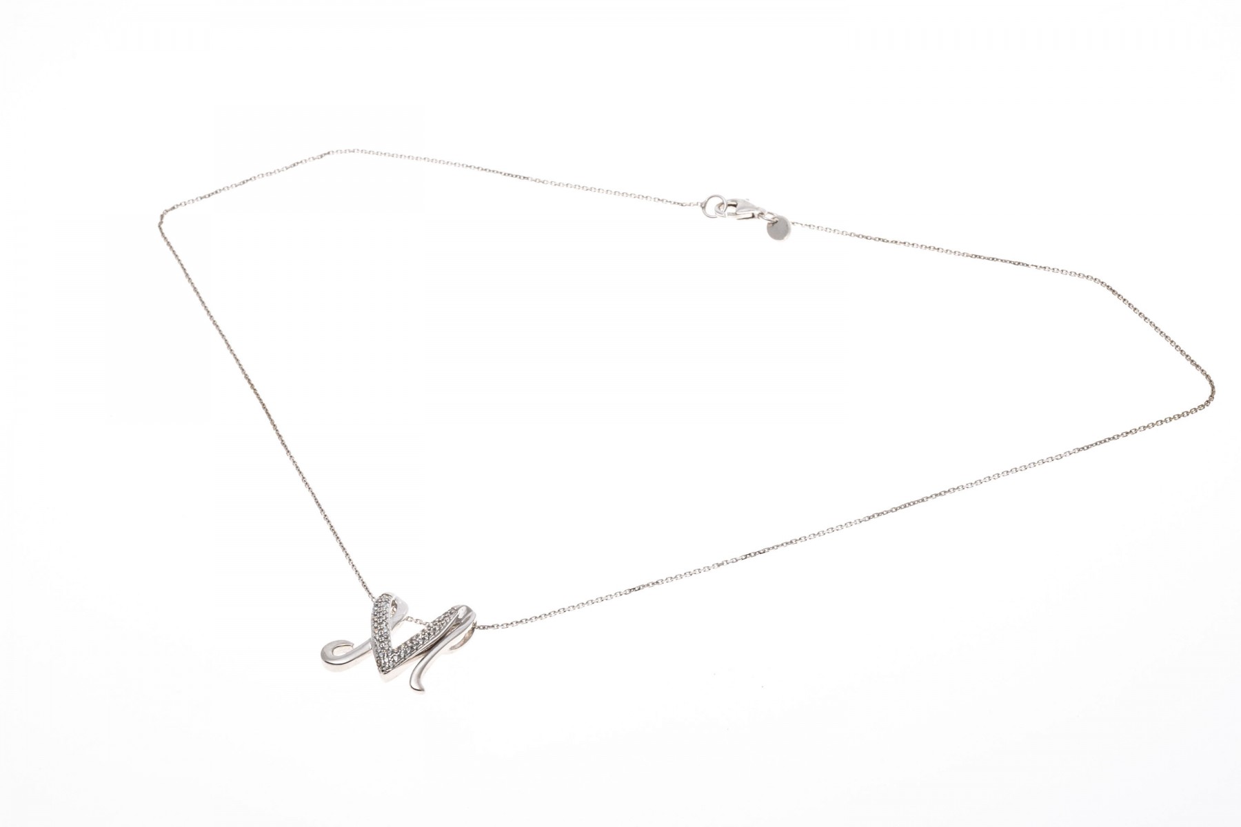 Sterling silver necklace. This whimsical sterling silver pendant necklace is a script "M" initial pendant, decorated with round faceted cz stones, pave set. The pendant is suspended from a fine curb link style chain, with a lobster claw style clasp.