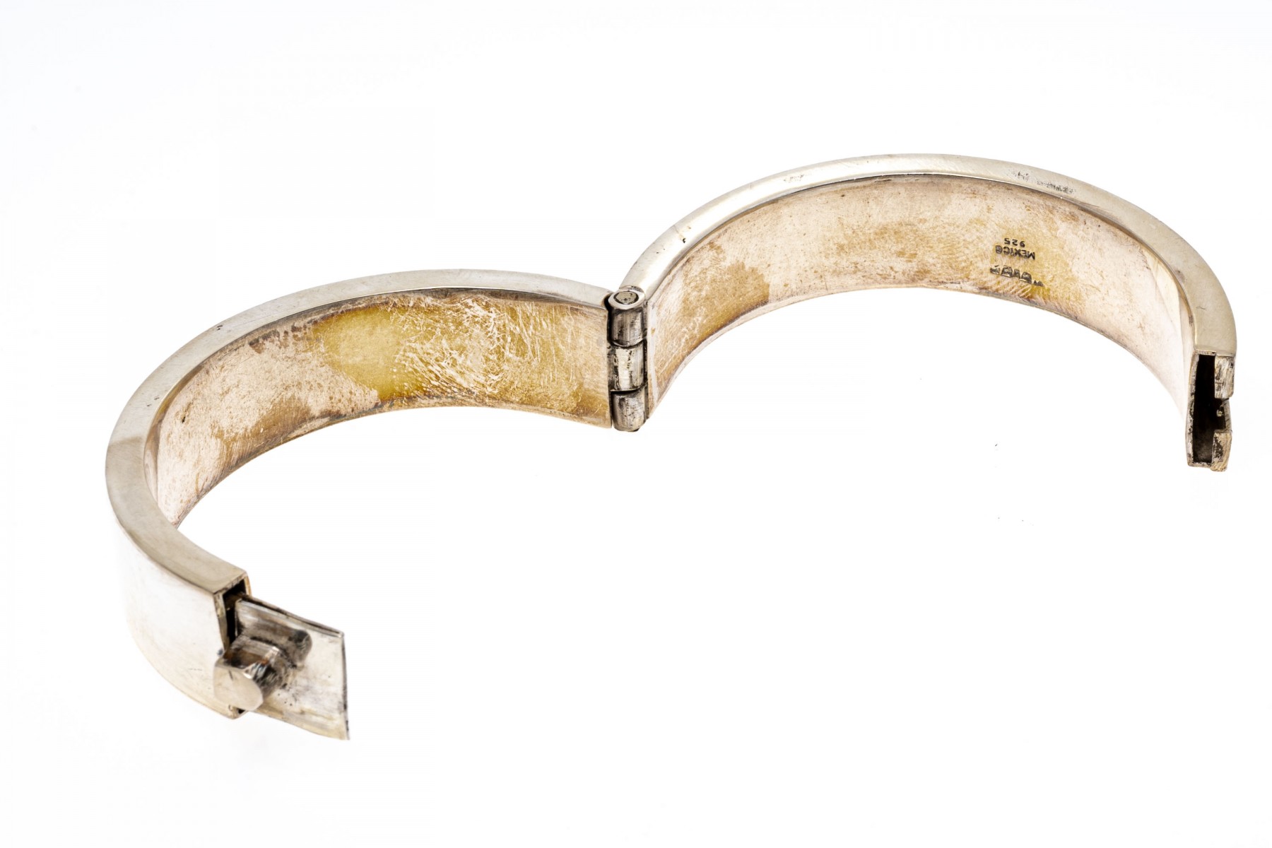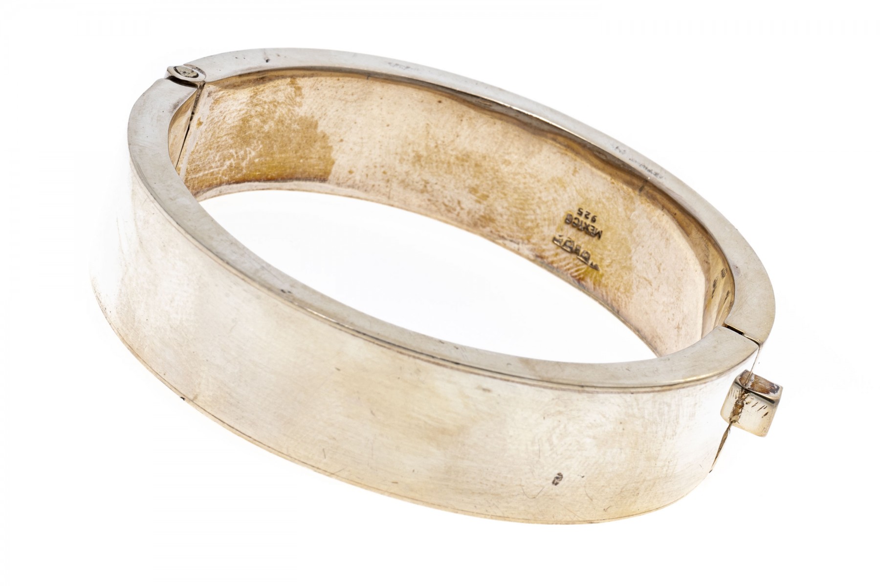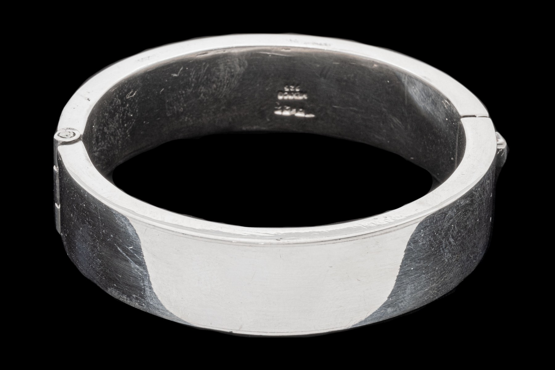Sterling silver bracelet. This striking bracelet is a sterling silver, wide hinged bangle bracelet, with a high polished finish and a contemporary edged profile. The bracelet has a push button style clasp.