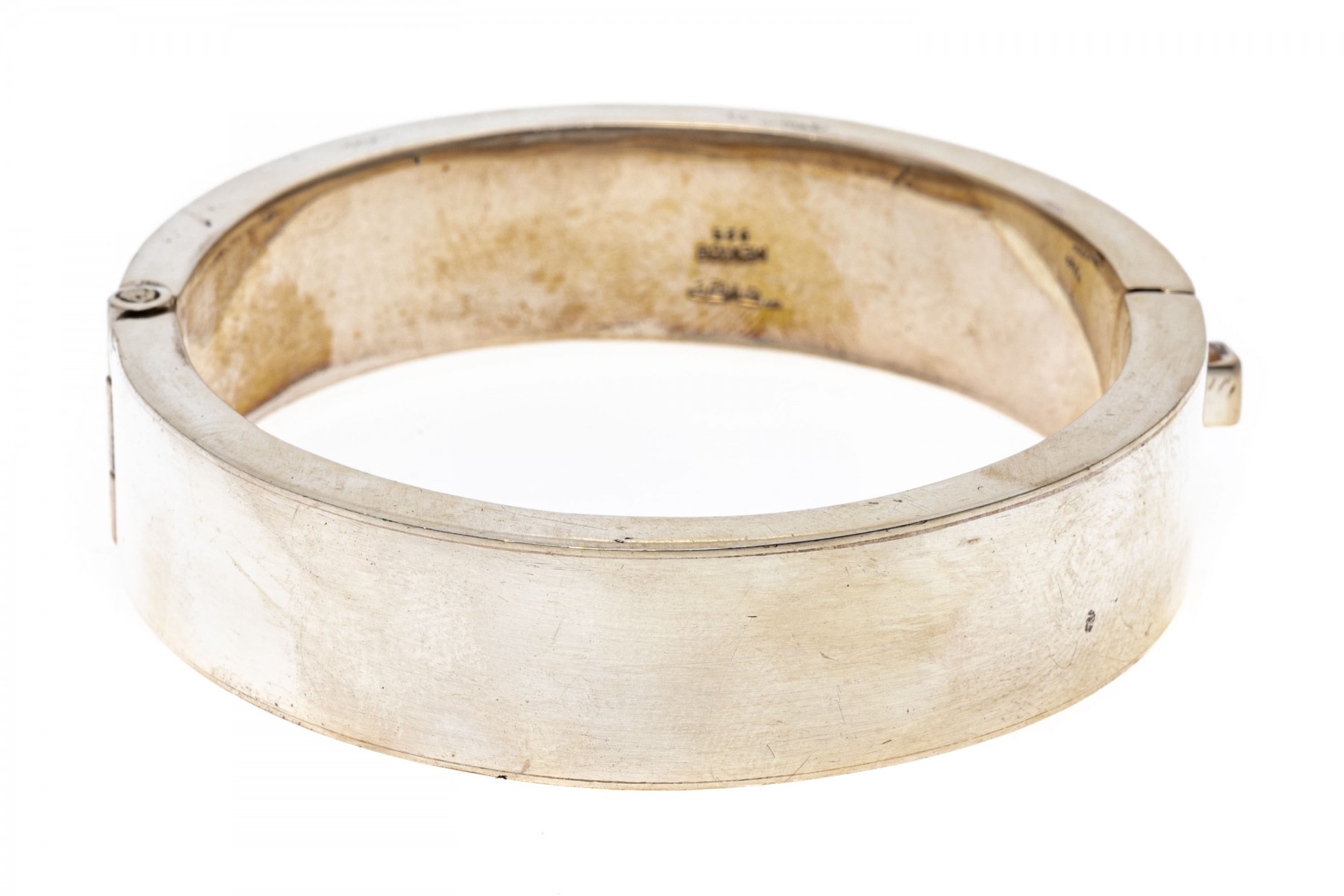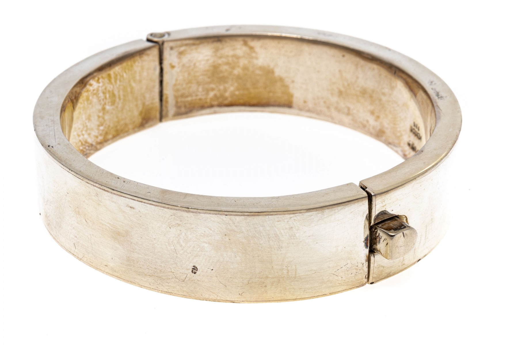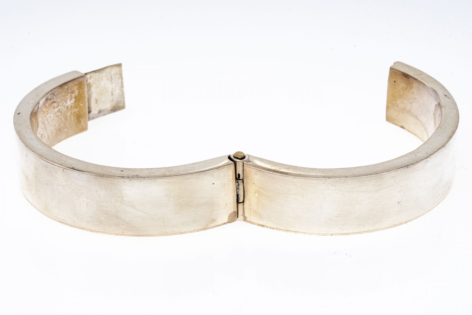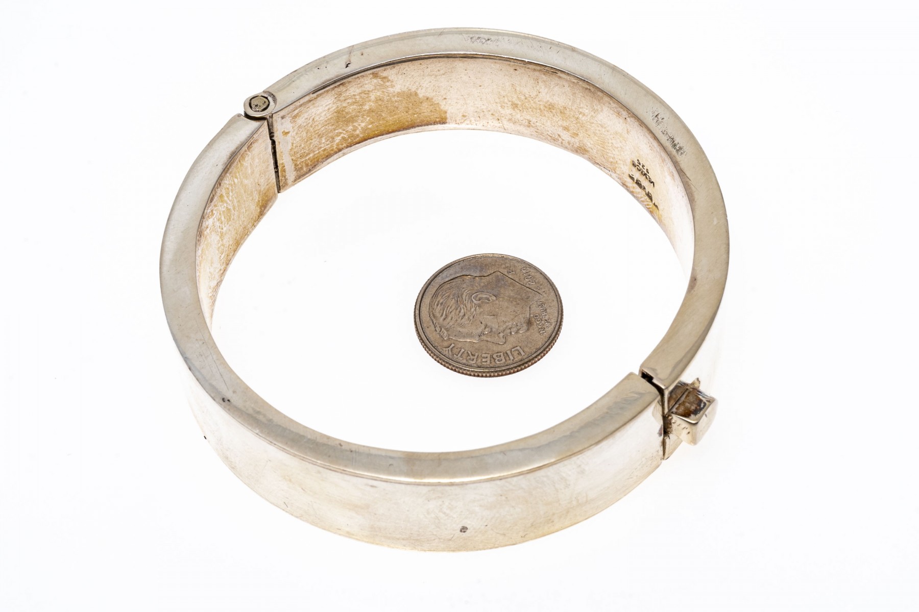 Sterling silver bracelet. This striking bracelet is a sterling silver, wide hinged bangle bracelet, with a high polished finish and a contemporary edged profile. The bracelet has a push button style clasp.