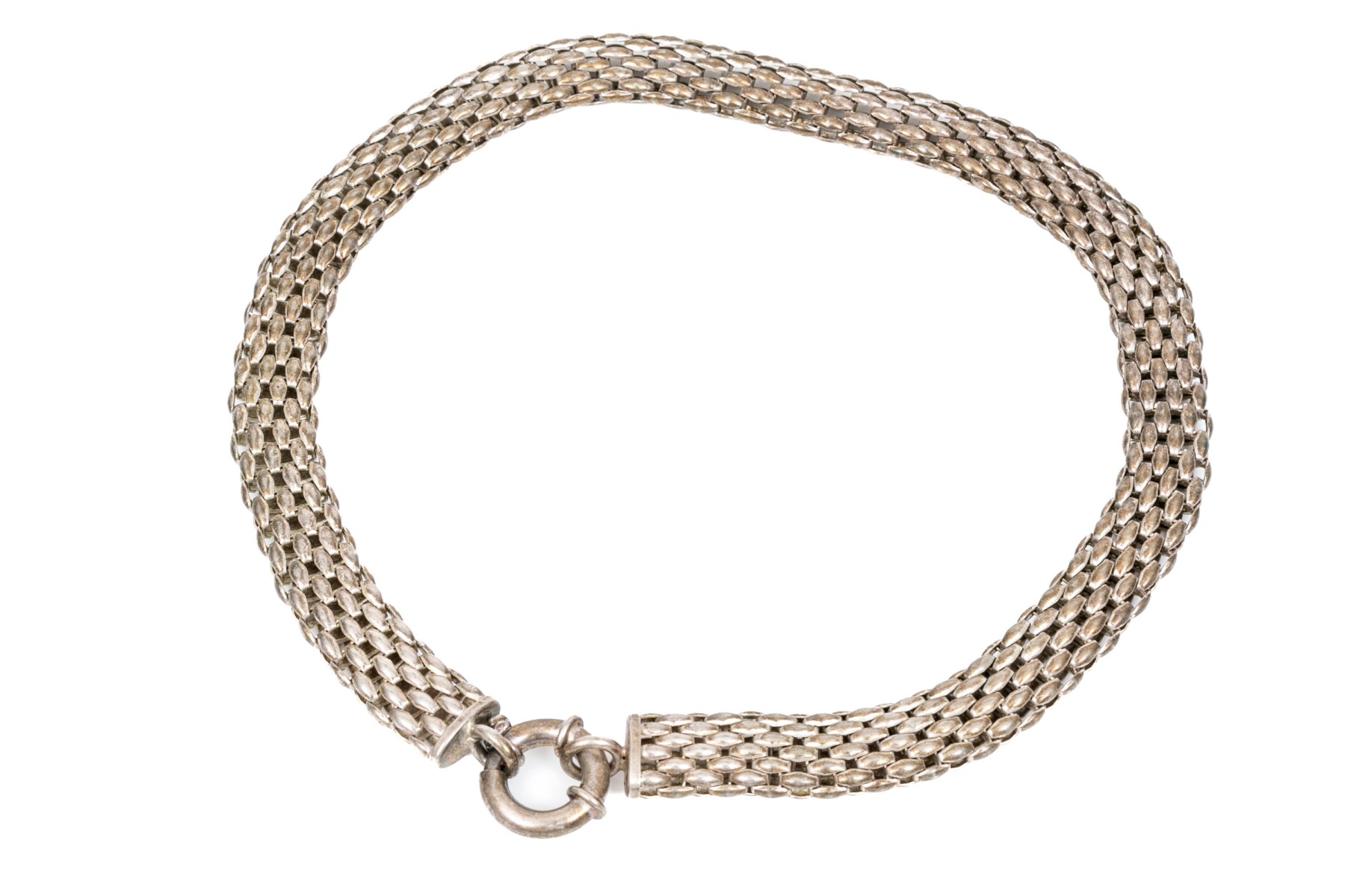 Sterling silver wide mesh choker necklace finished with a jumbo spring ring style clasp