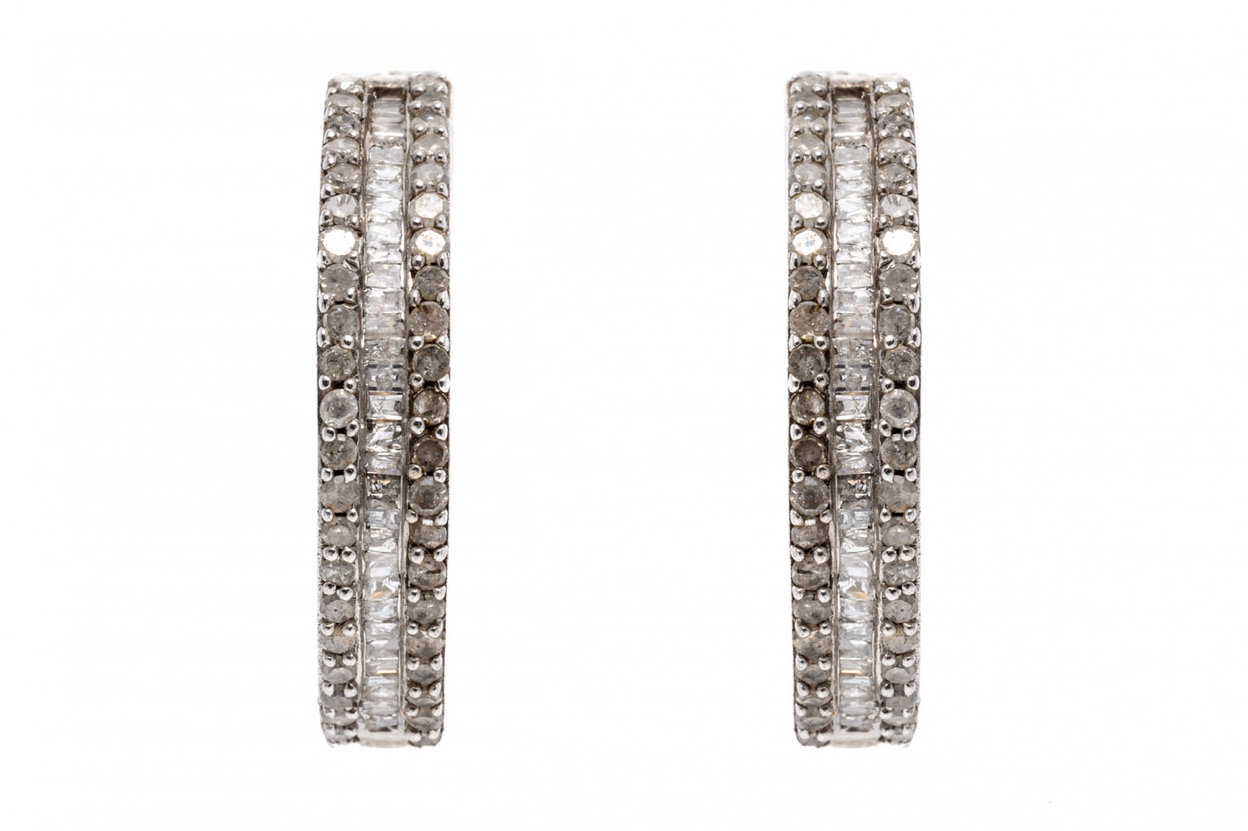 A striking pair of sterling silver hoop earrings set with round and baguette cut accent diamonds across the face. Post backings.