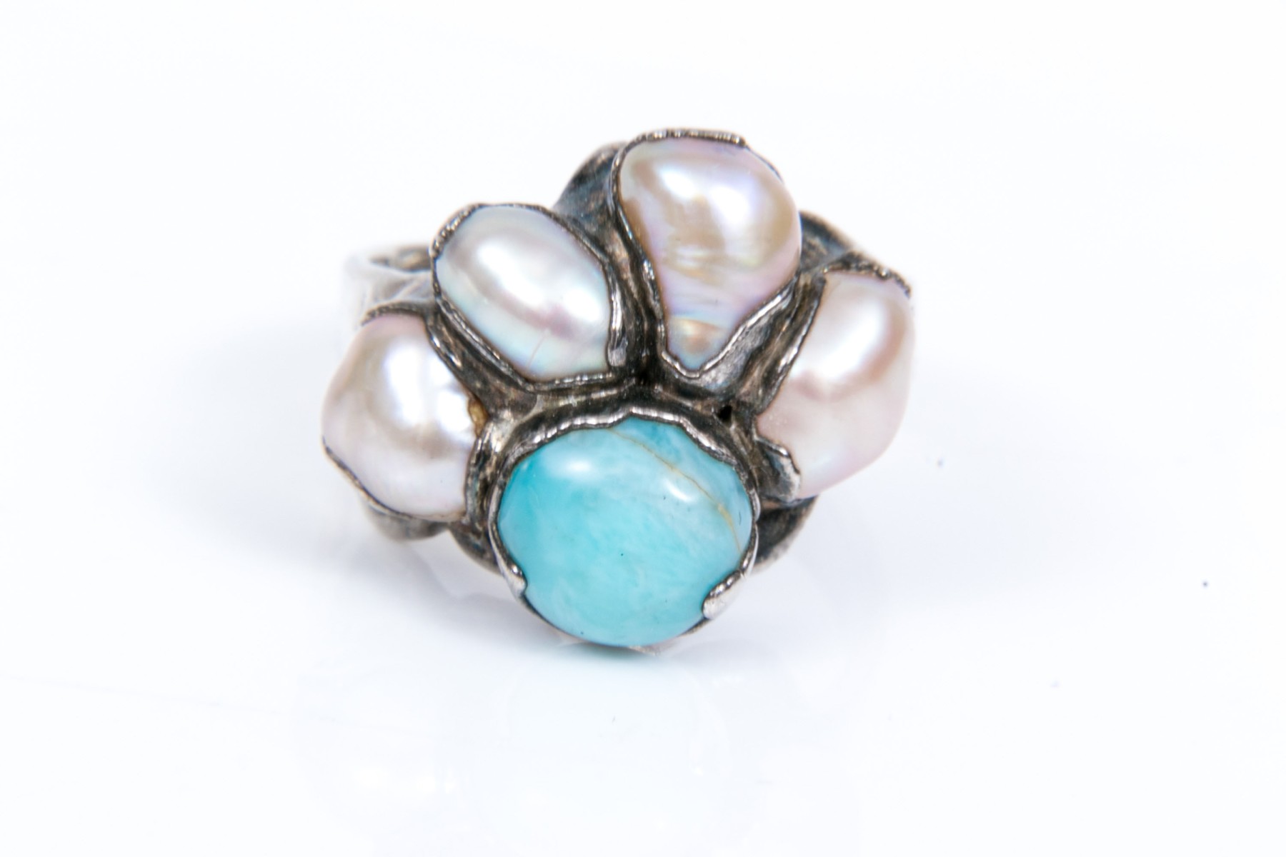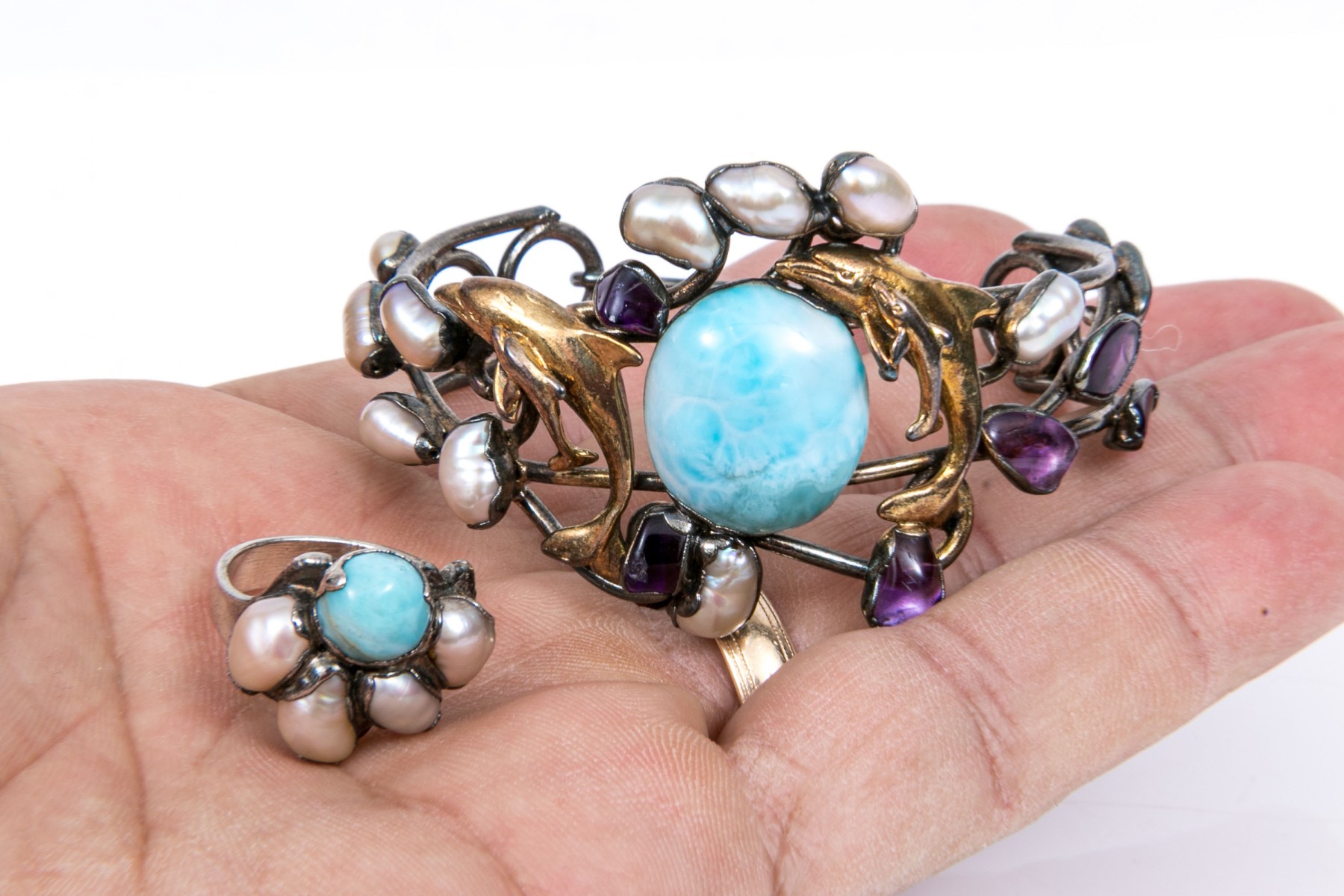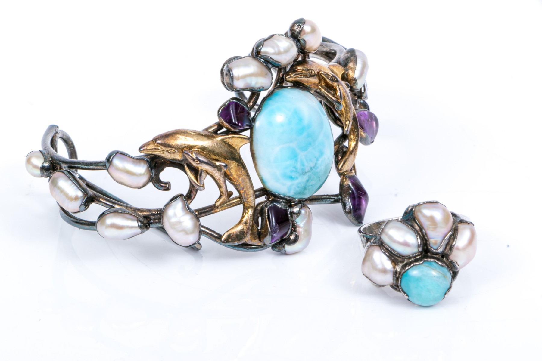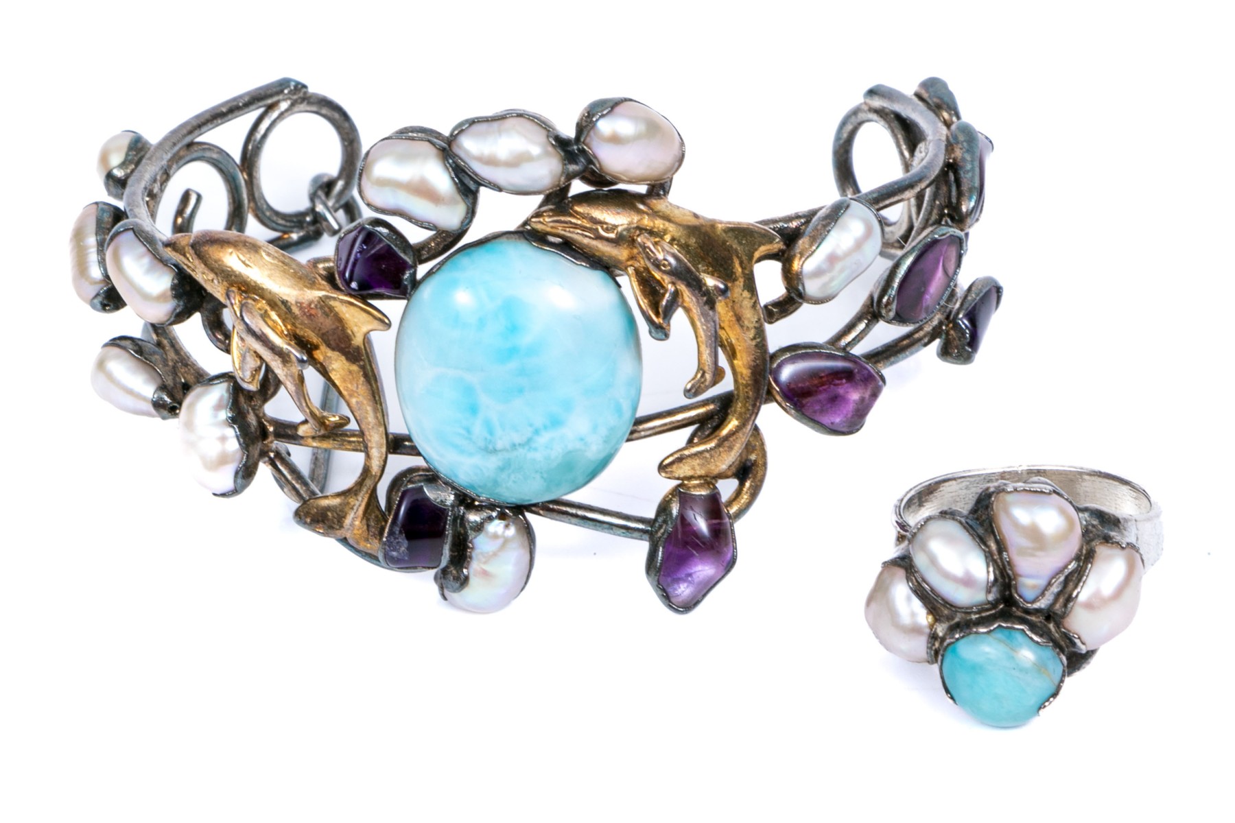 Sterling silver striking larimer, amethyst and cultured freshwater pearl cuff bracelet and complementary larimar and cultured freshwater pearl ring, size 7 1/2