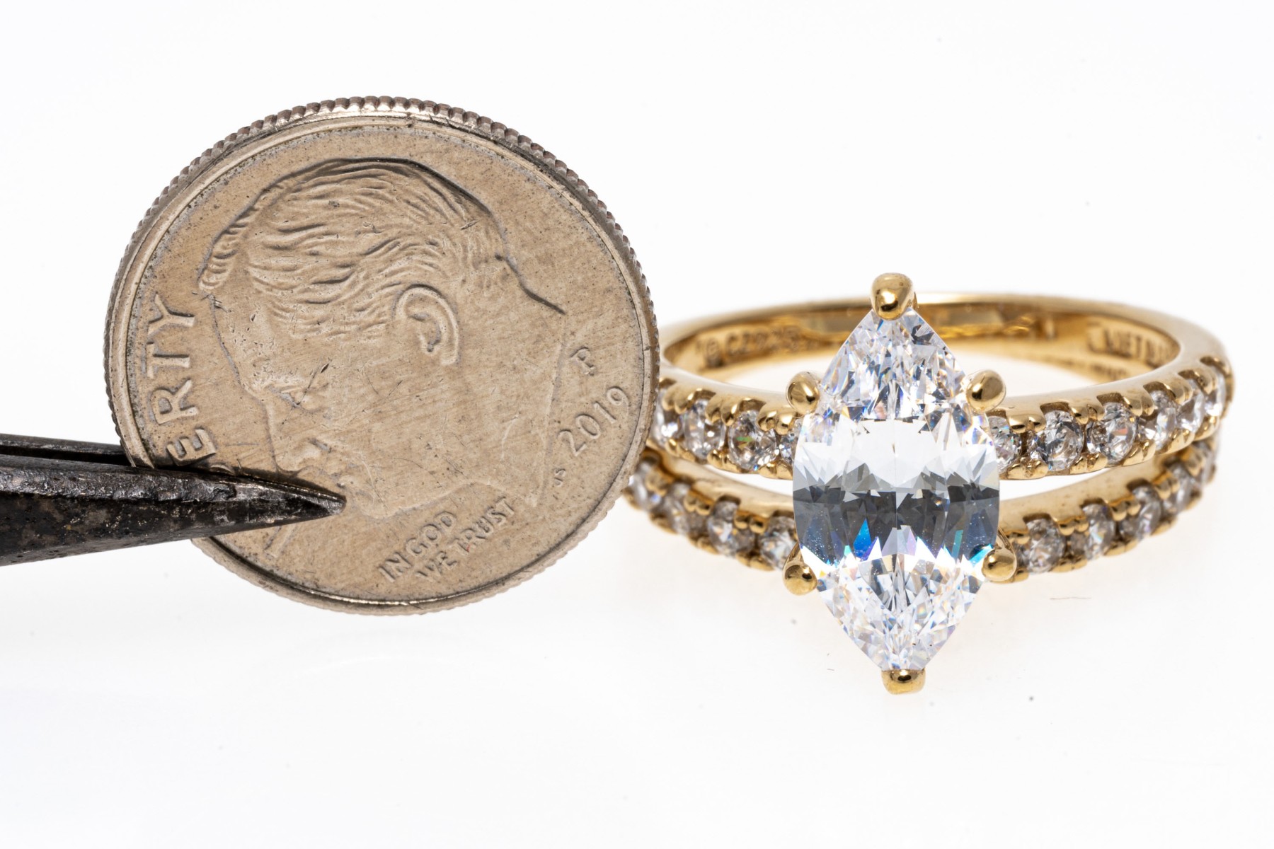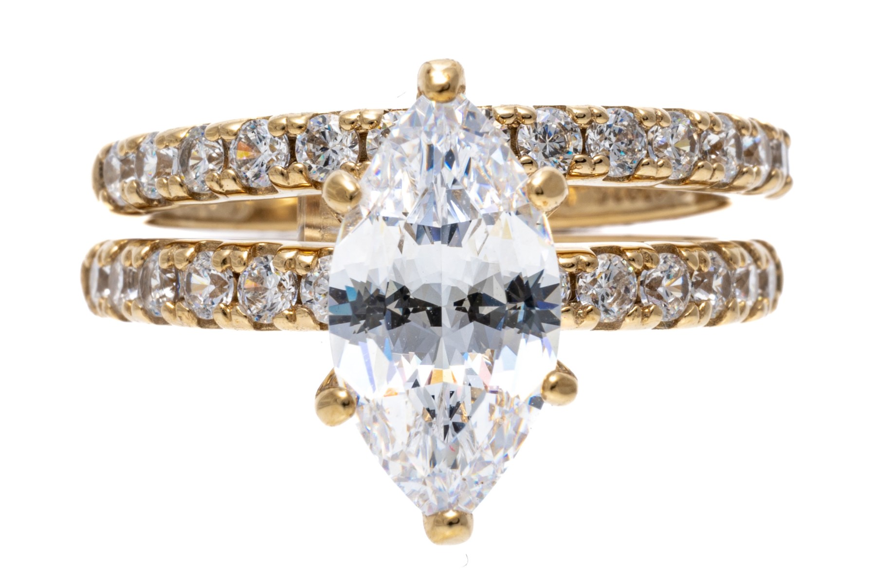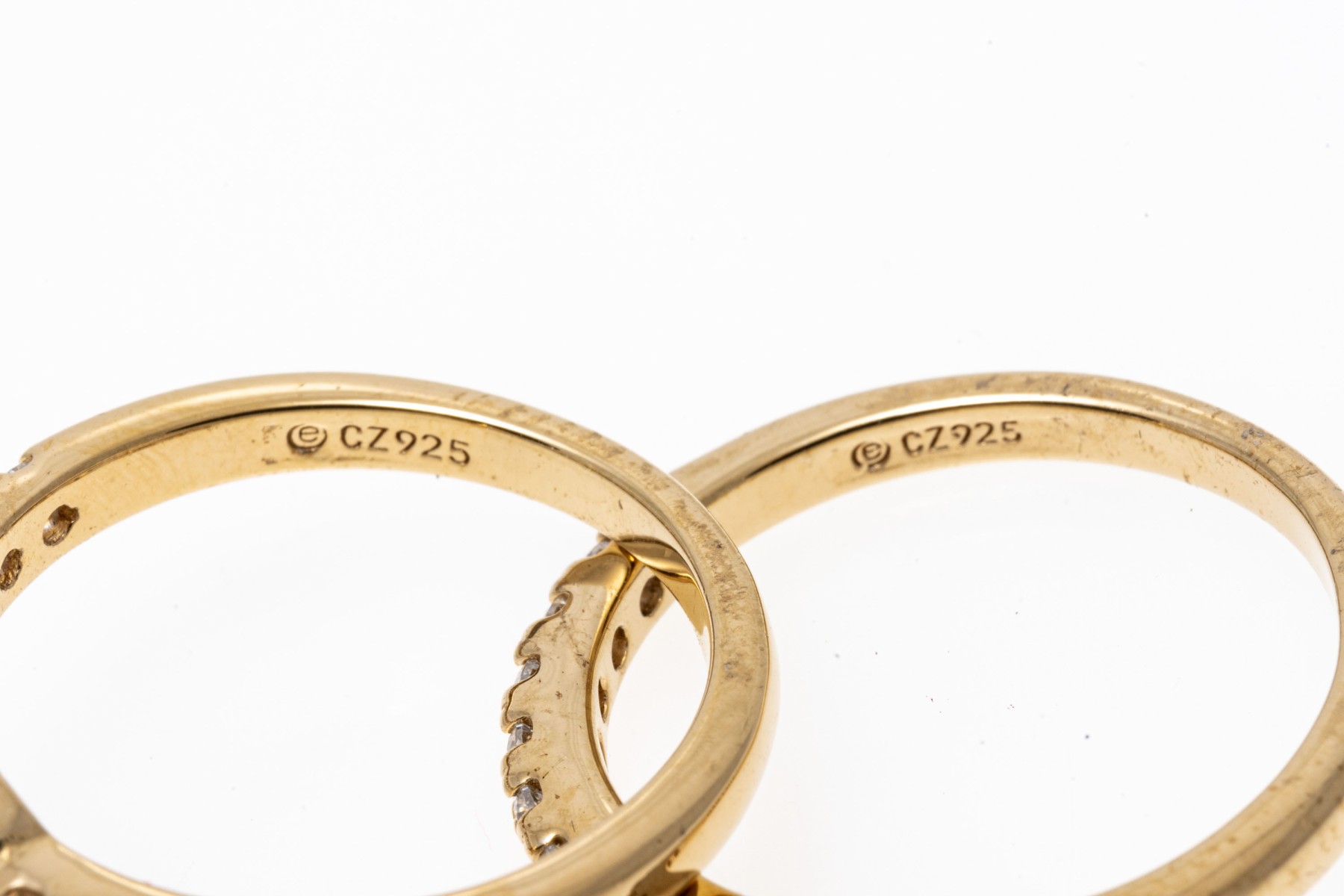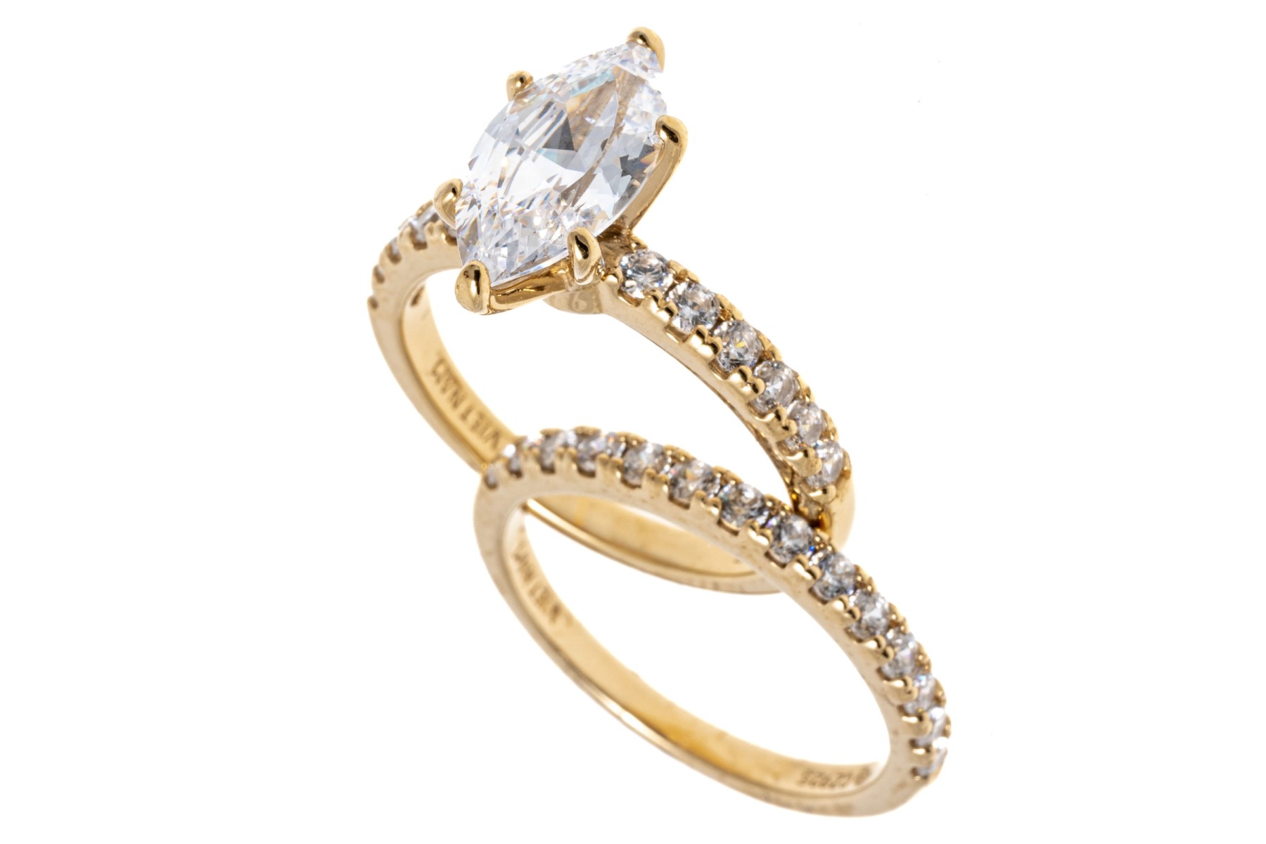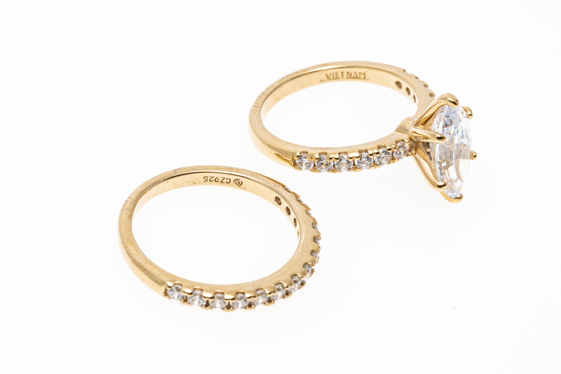 A sterling vermeil engagement ring and wedding band set featuring pave round CZ, one accented with a marquise main stone.