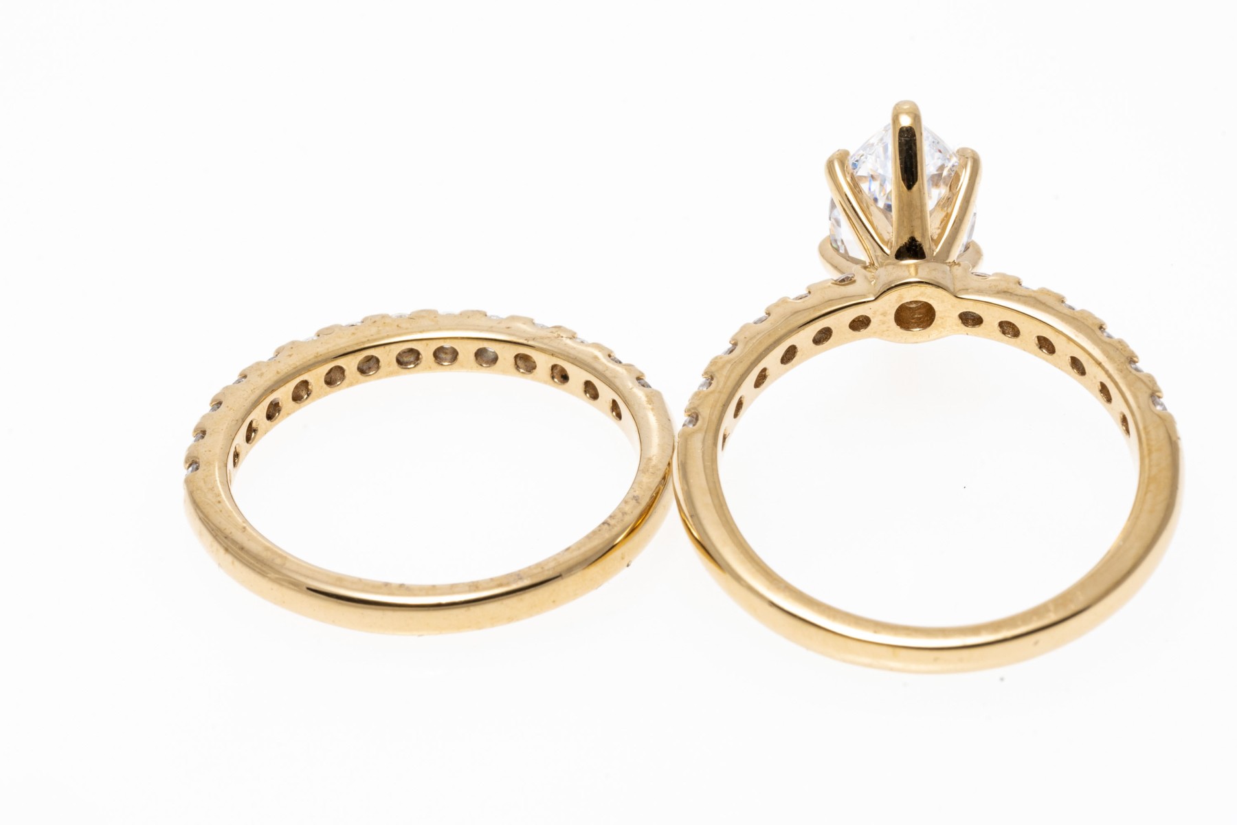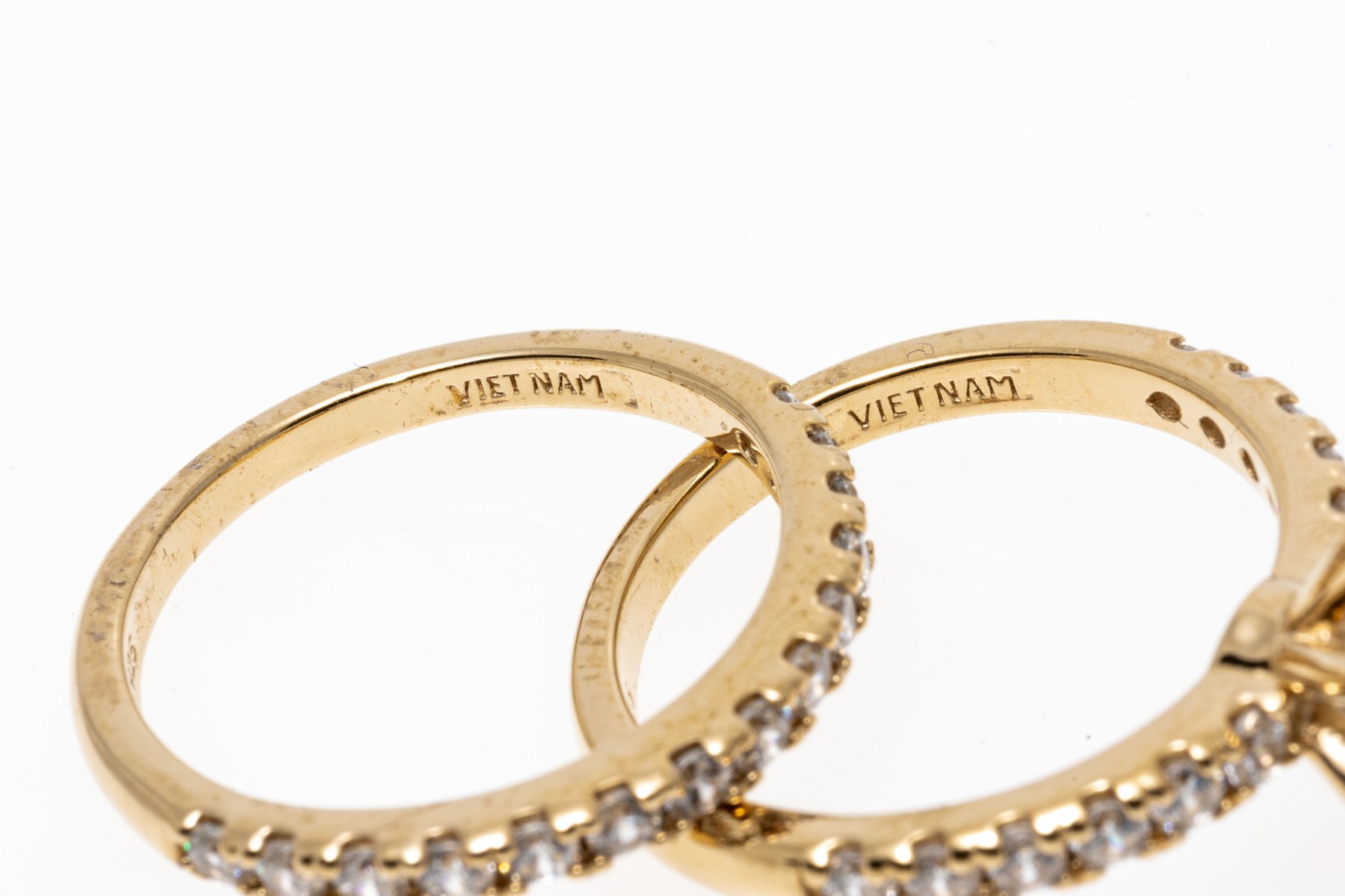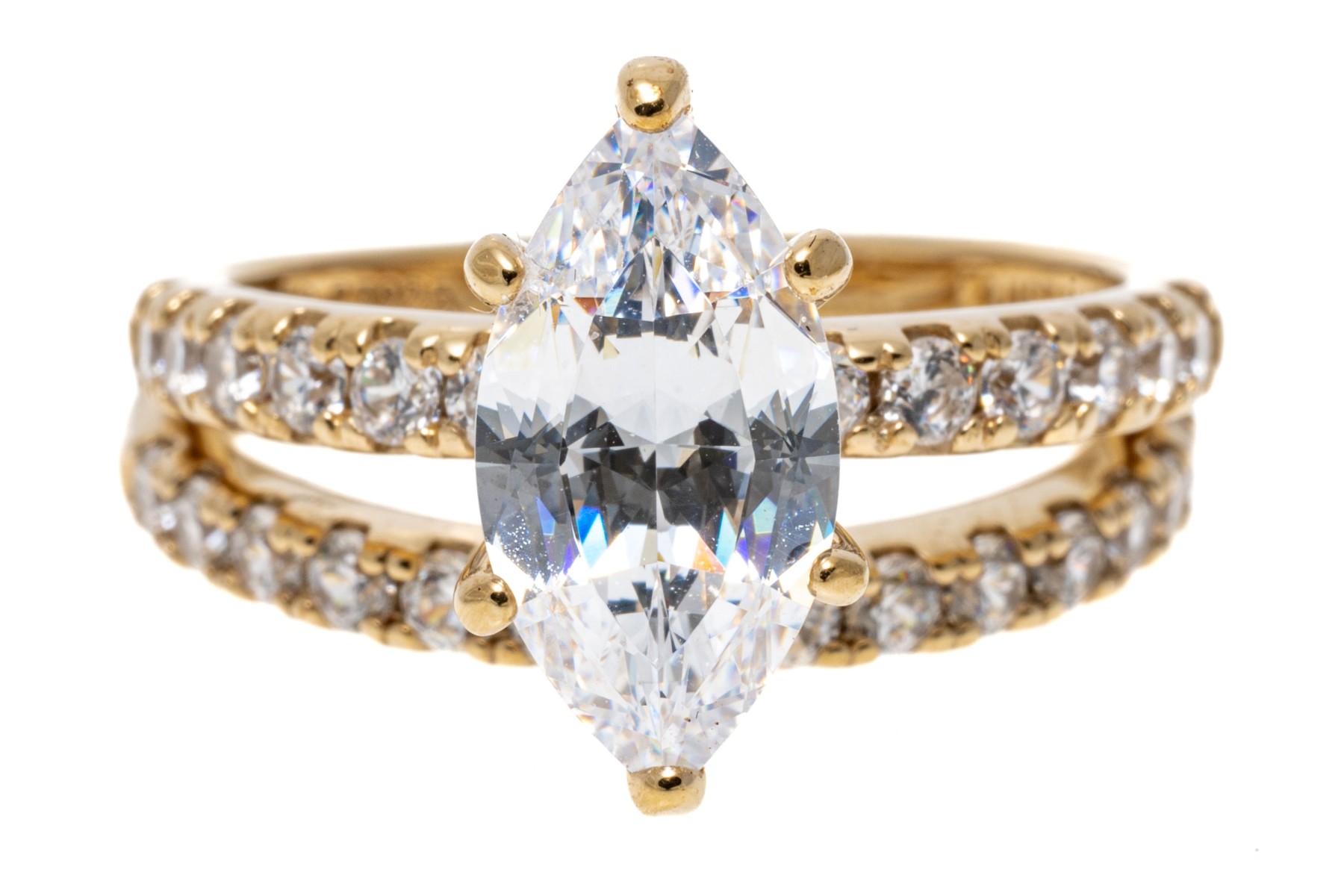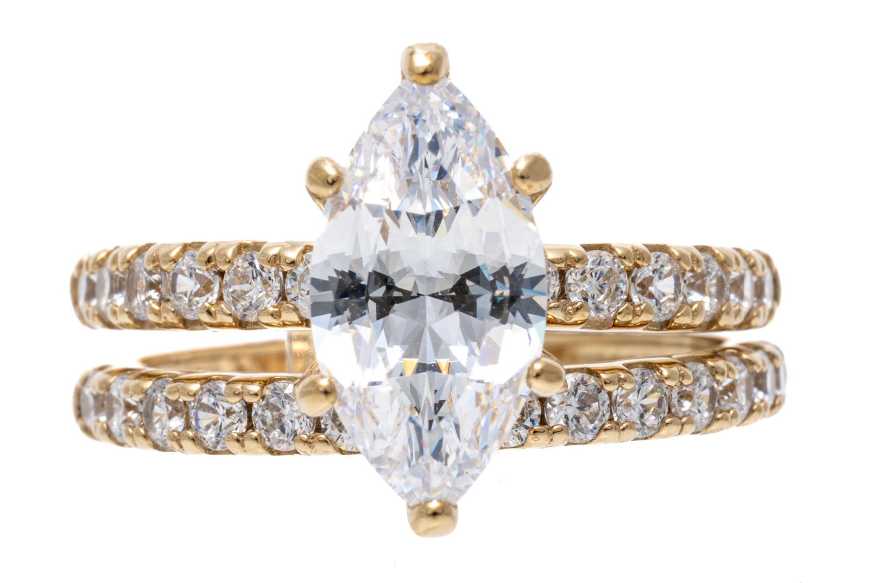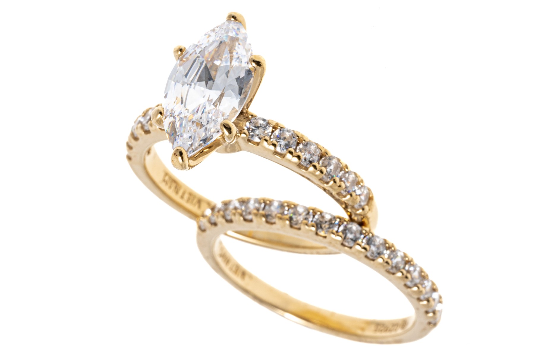 A sterling vermeil engagement ring and wedding band set featuring pave round CZ, one accented with a marquise main stone.