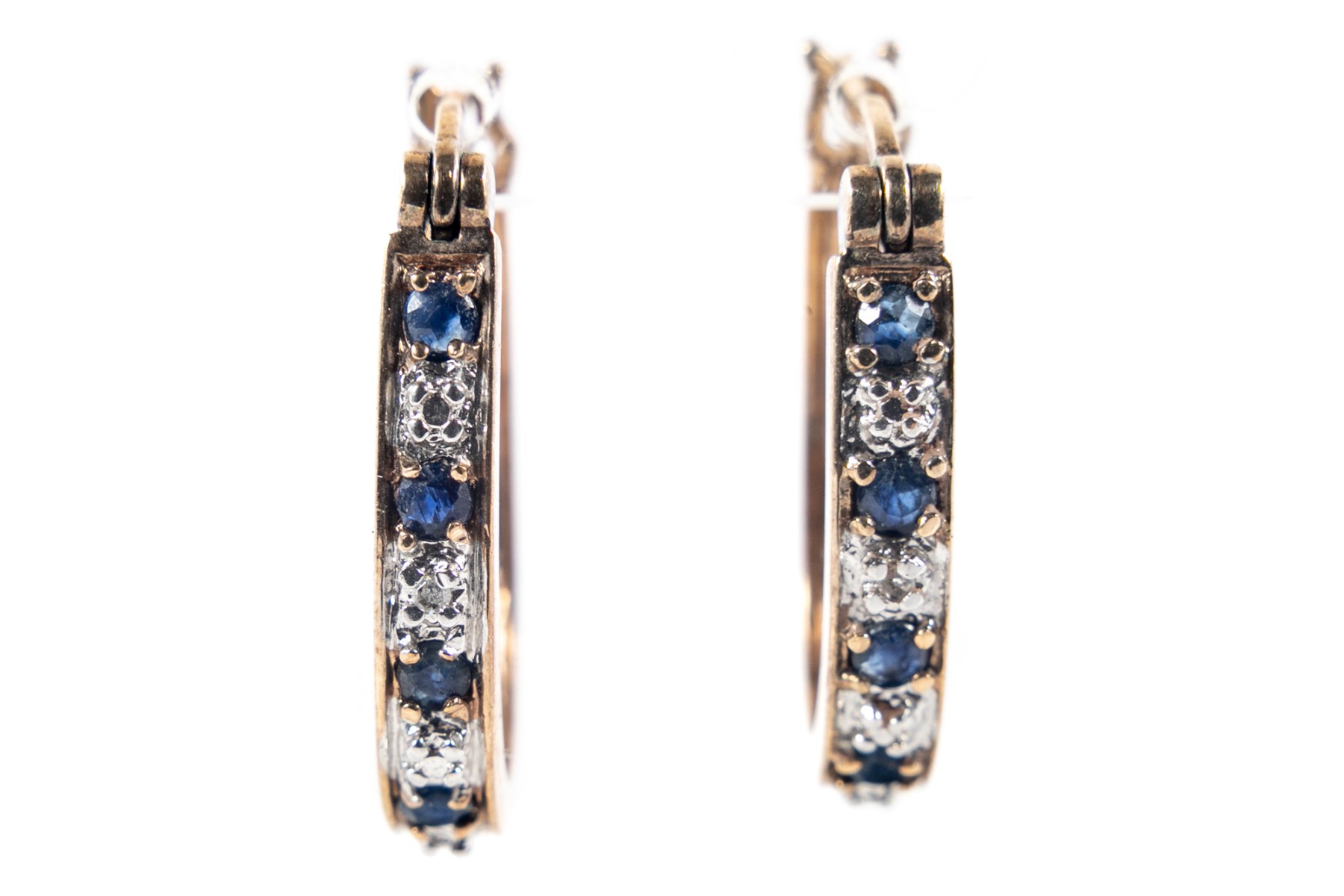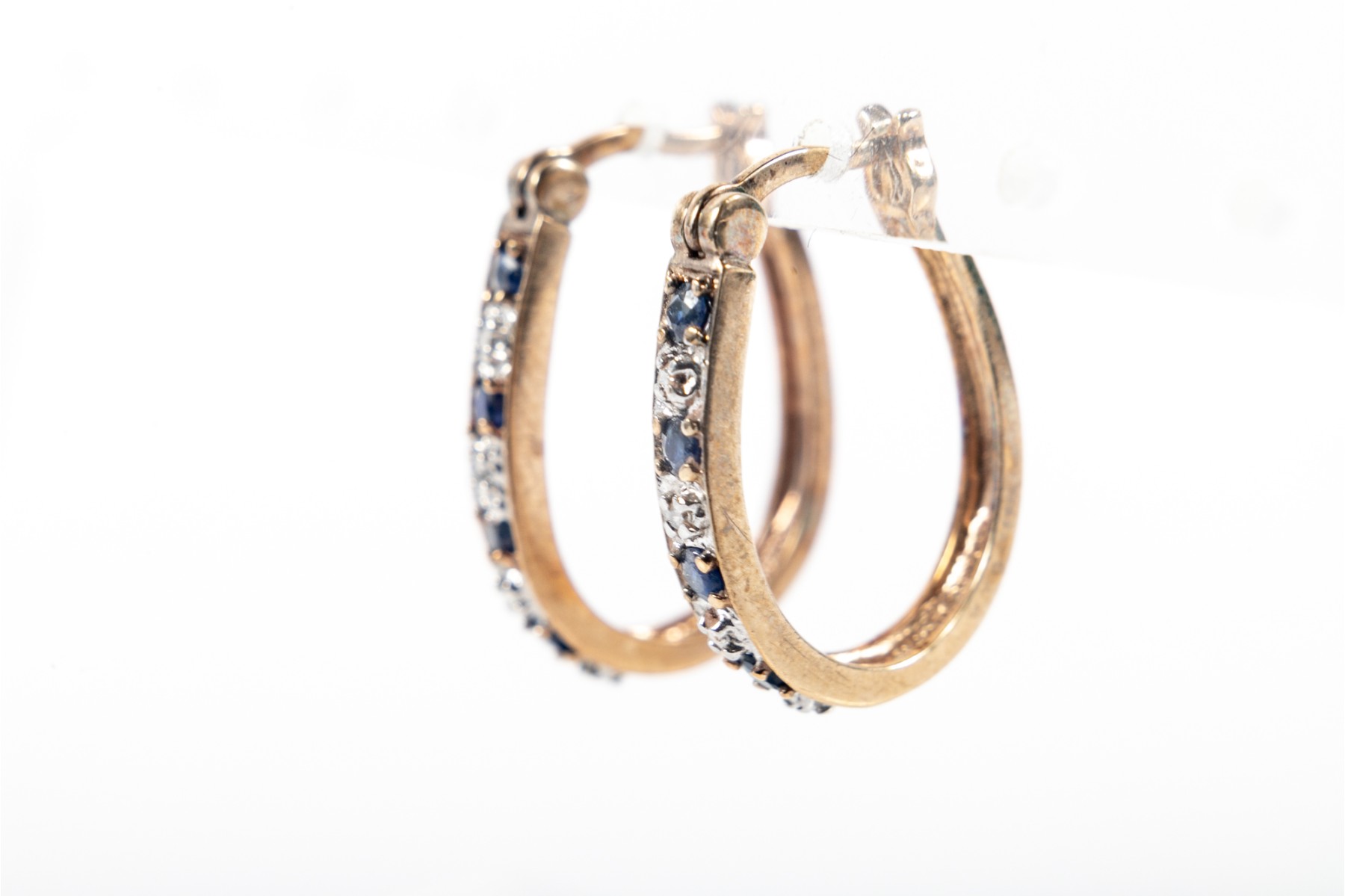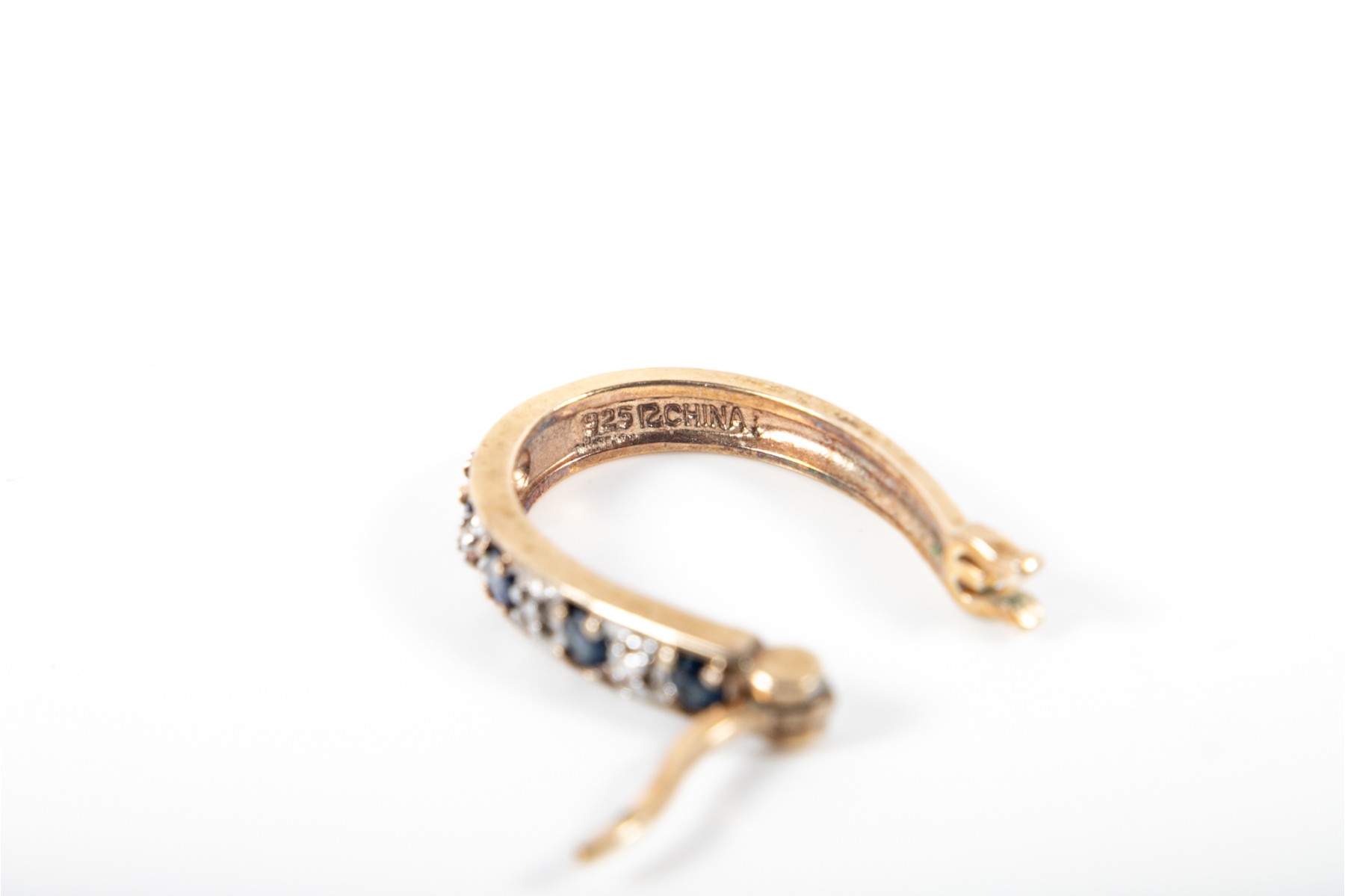 A delightful pair of sterling vermeil U-curve hoop earrings displaying alternating moissanites and blue CZ.