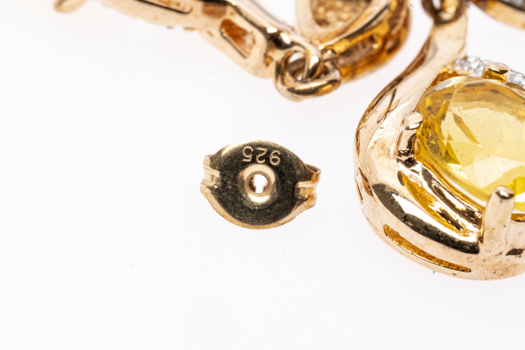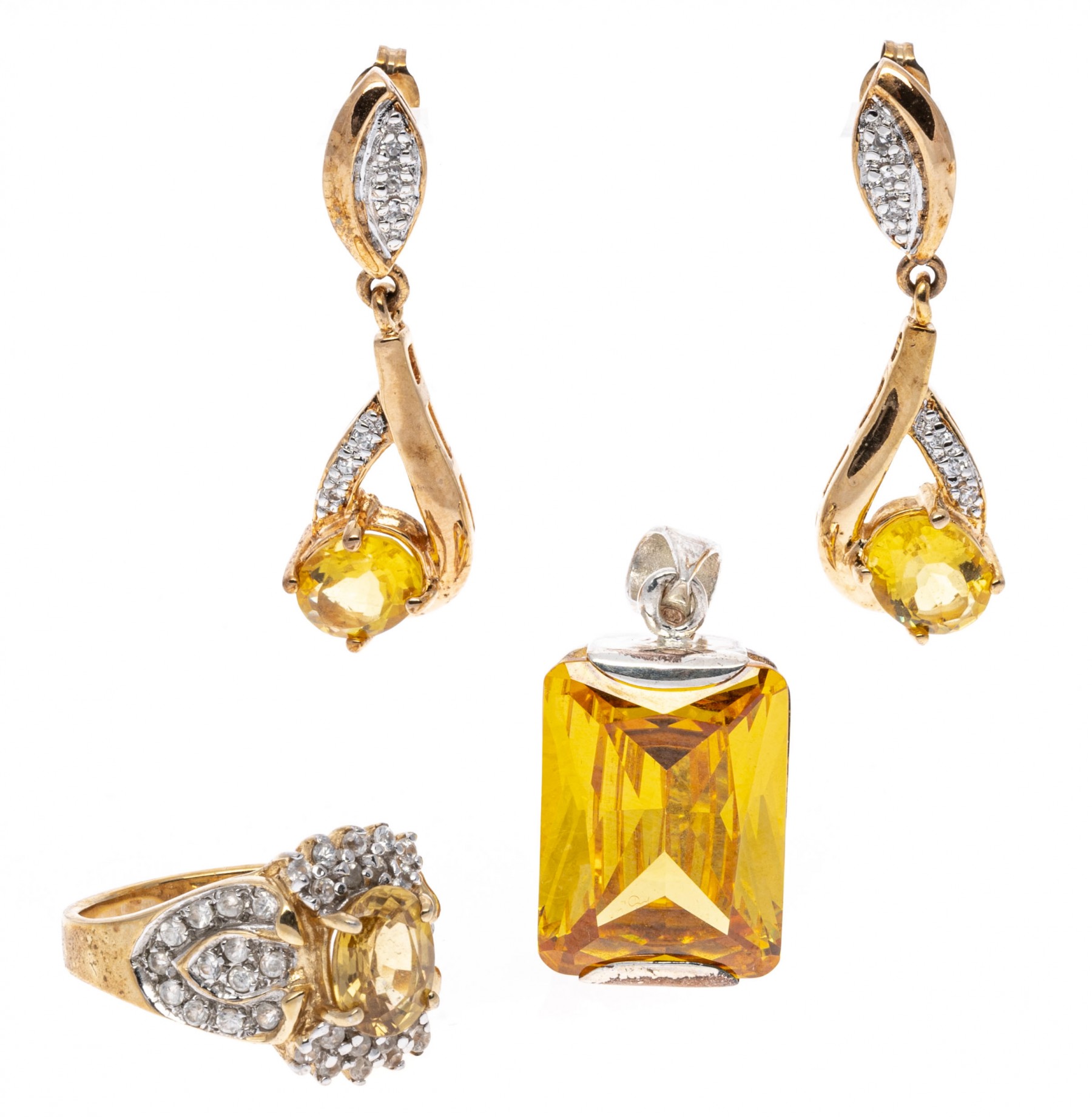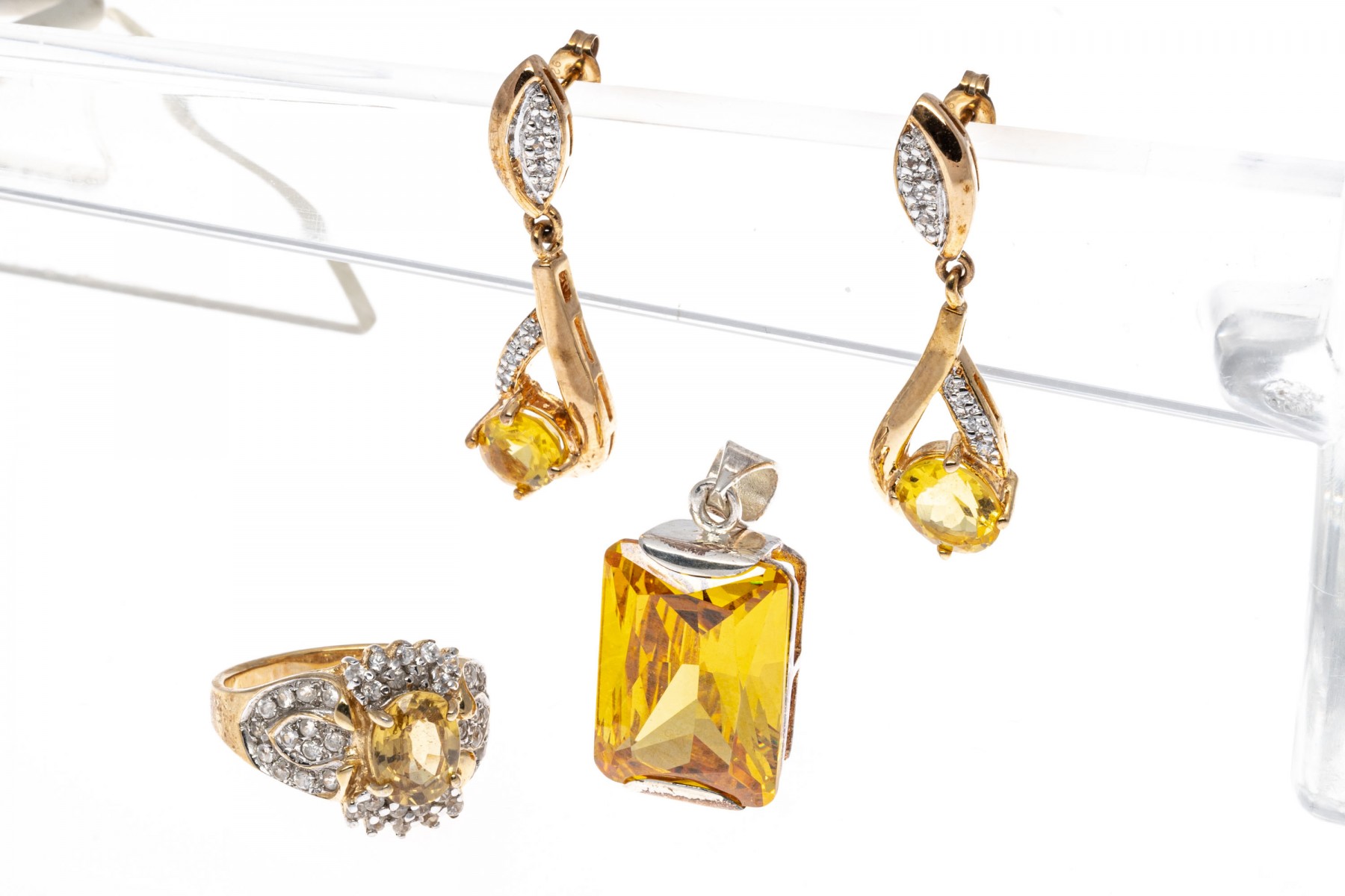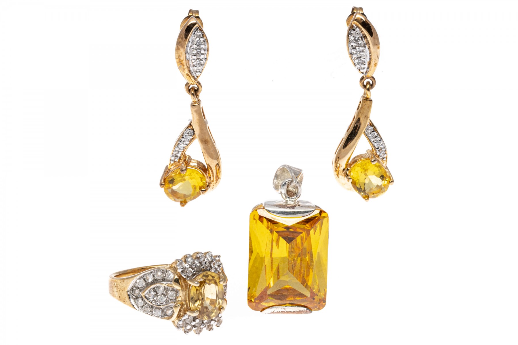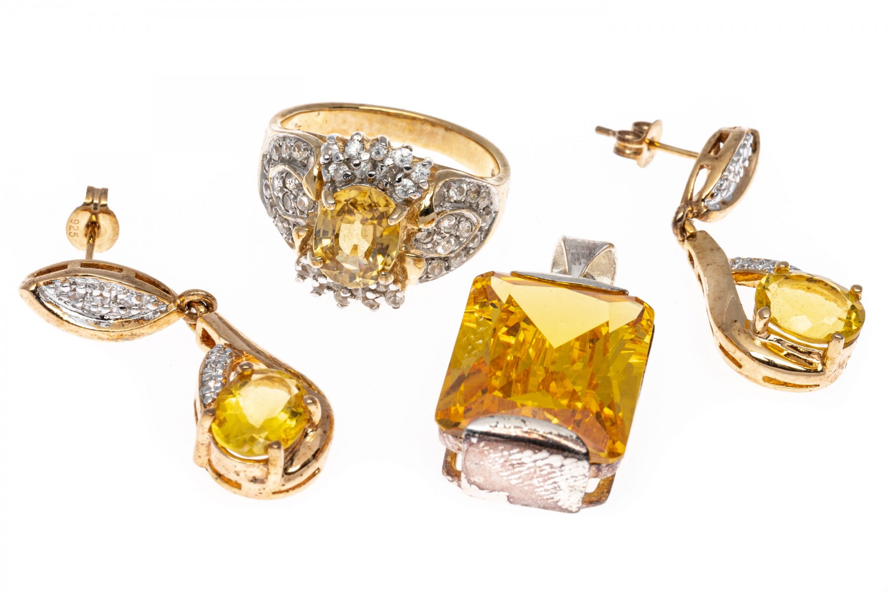 A group of sterling silver vermeil jewelry including ring, earrings and pendant. This bright and lively group contains a pendant with rectangular cut pineapple yellow zirconia and a ring (size 8.75) displaying an oval cut bright yellow zirconia framed by white zirconia that trail down the ring shanks. The earrings display bright yellow citrine stones set into a tear drop designed drop with white stones, post and clutch backings.