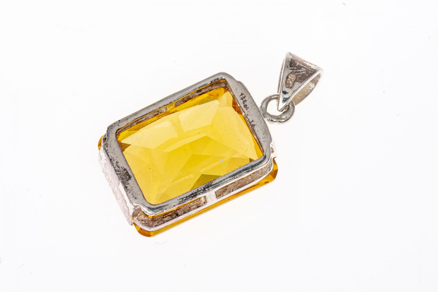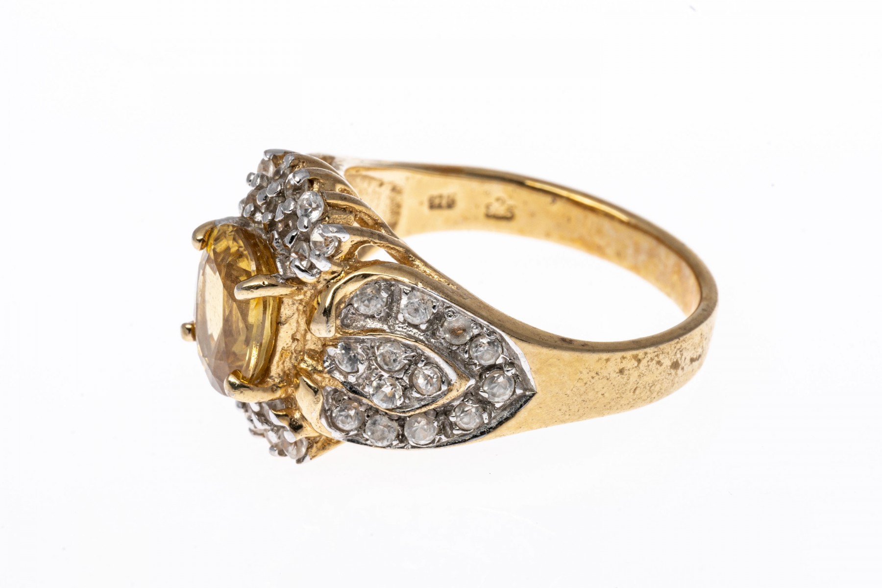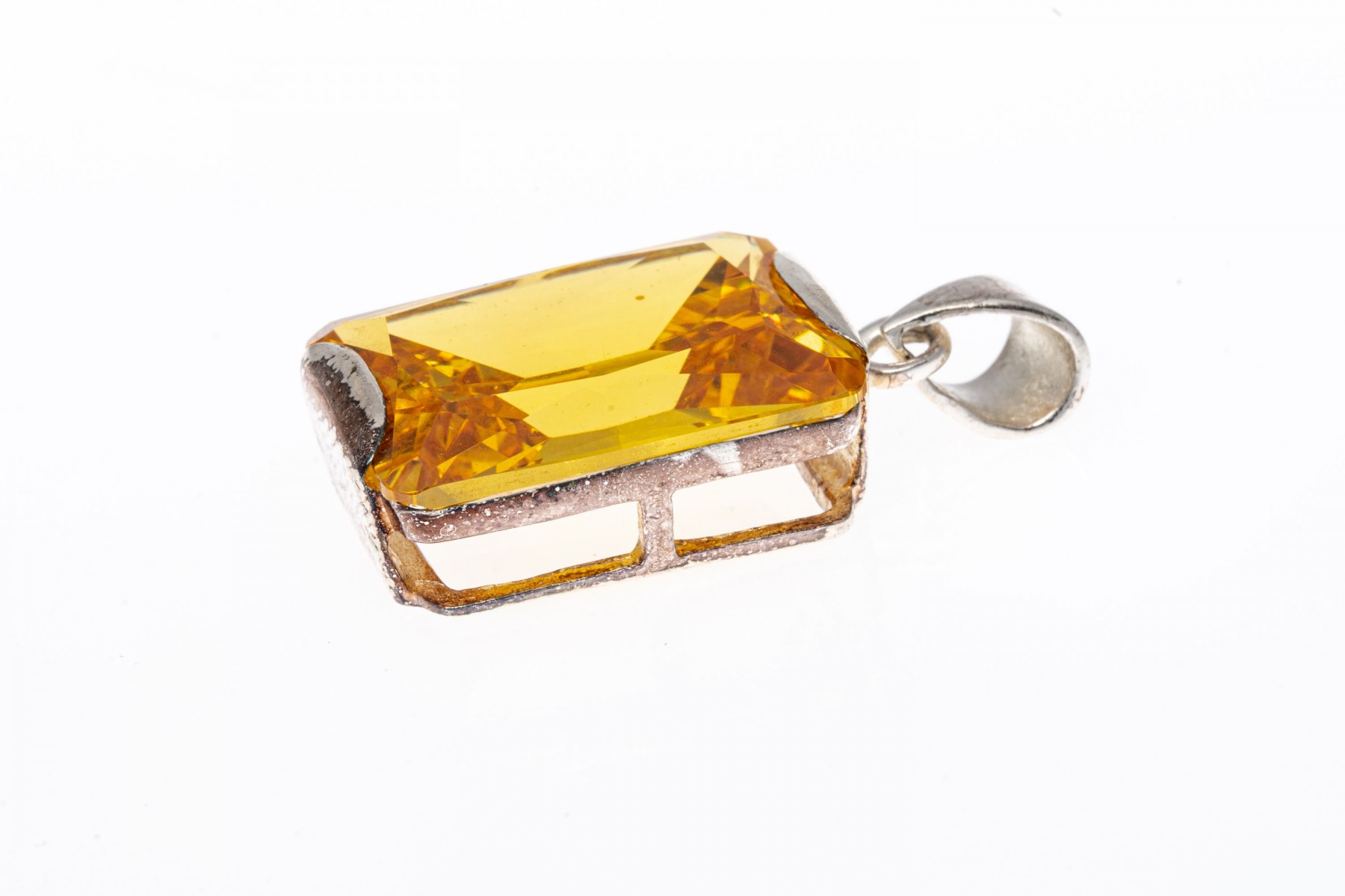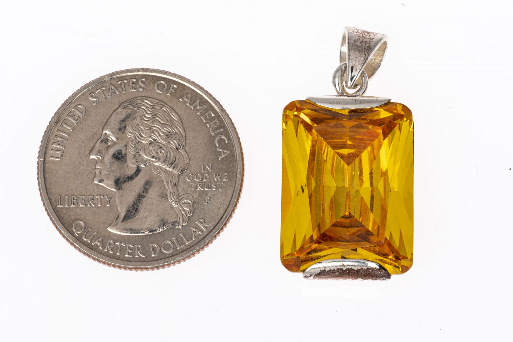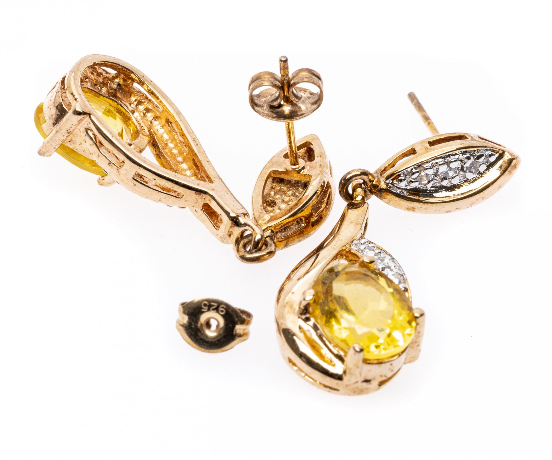 A group of sterling silver vermeil jewelry including ring, earrings and pendant. This bright and lively group contains a pendant with rectangular cut pineapple yellow zirconia and a ring (size 8.75) displaying an oval cut bright yellow zirconia framed by white zirconia that trail down the ring shanks. The earrings display bright yellow citrine stones set into a tear drop designed drop with white stones, post and clutch backings.