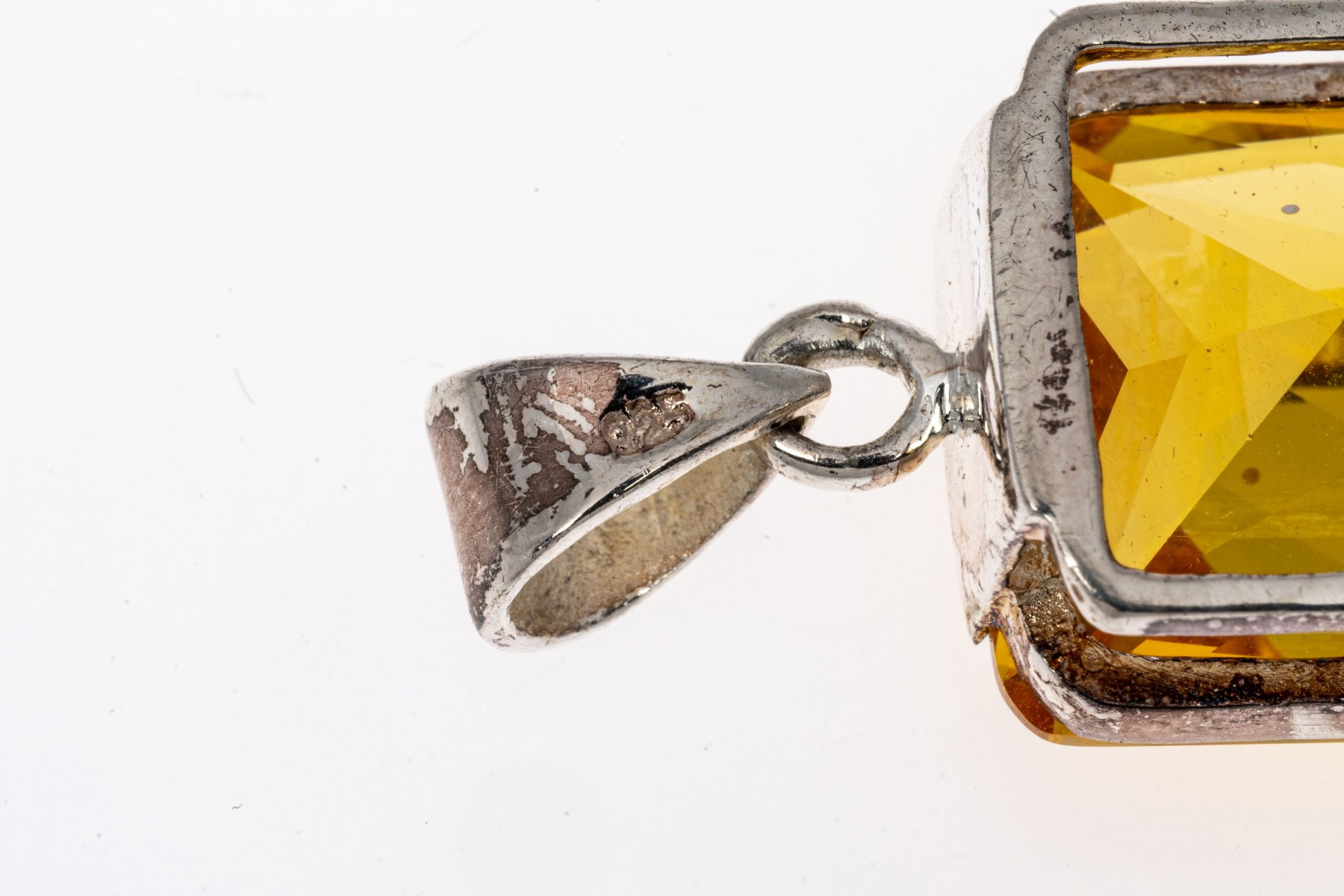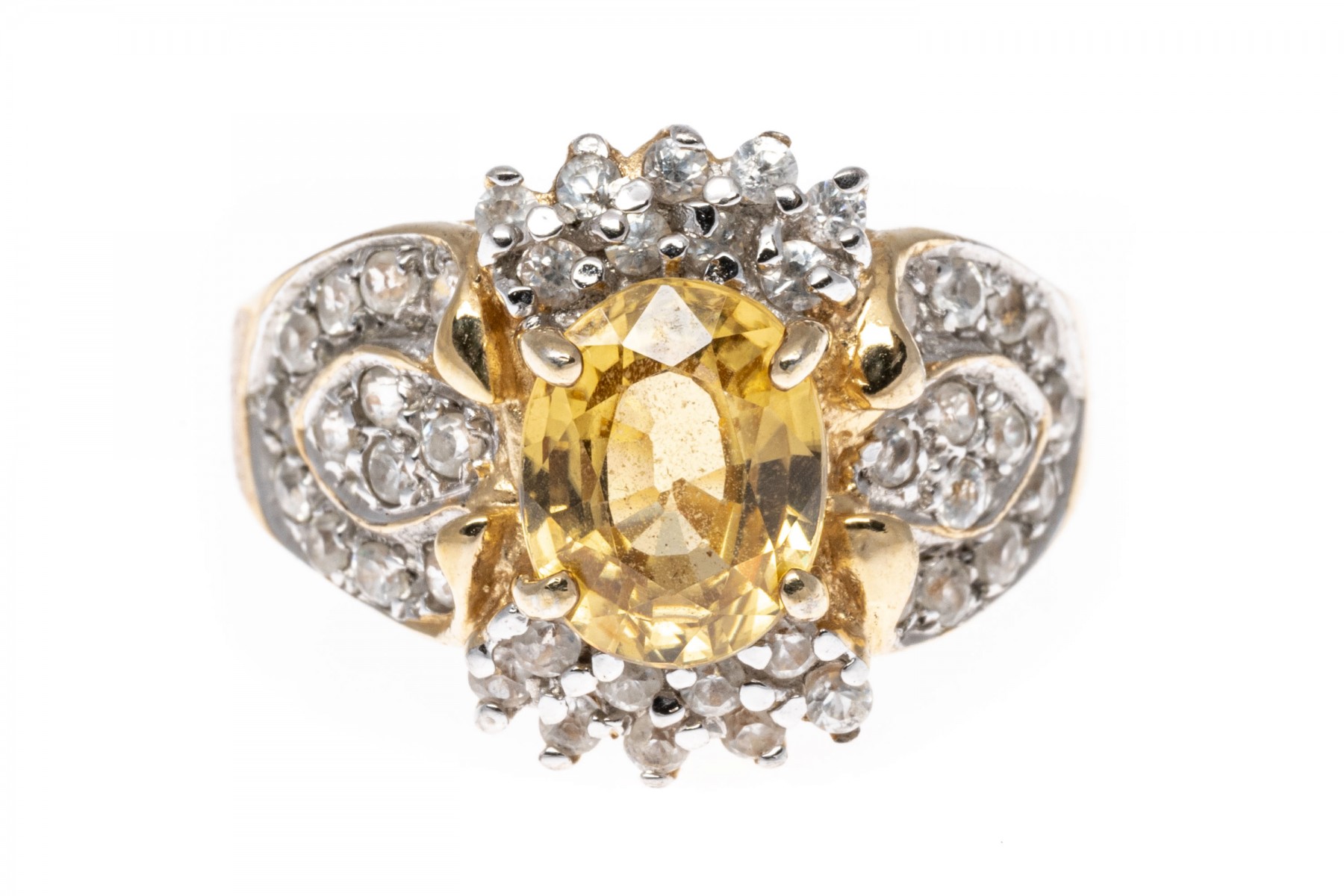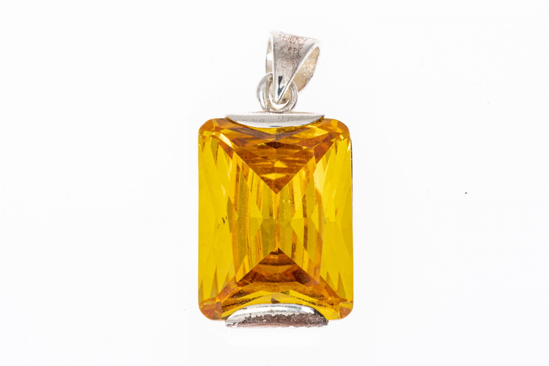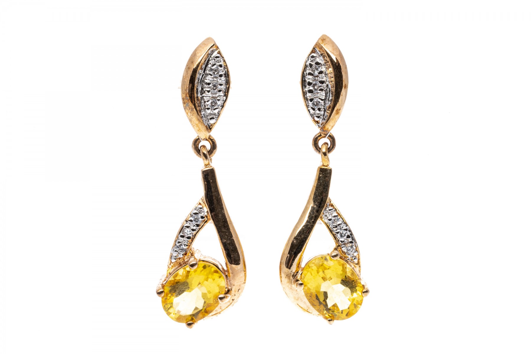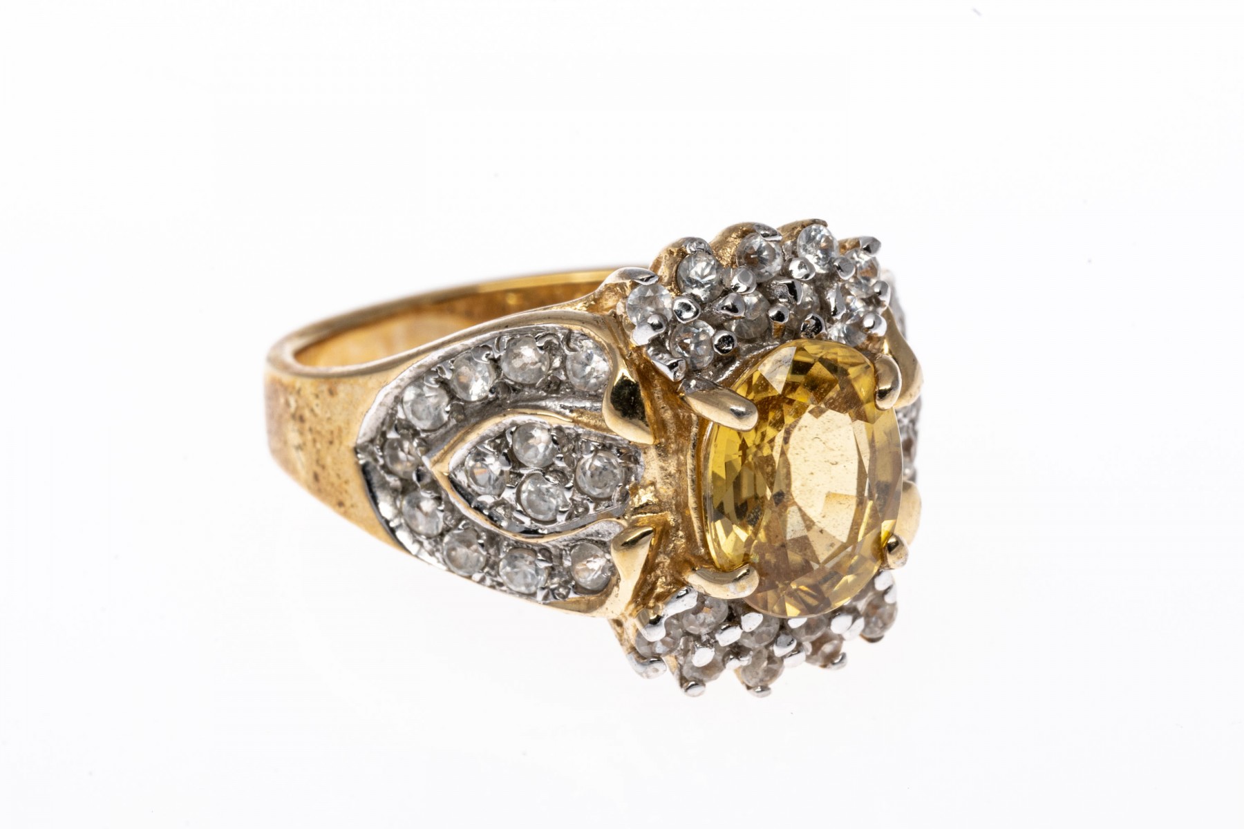 A group of sterling silver vermeil jewelry including ring, earrings and pendant. This bright and lively group contains a pendant with rectangular cut pineapple yellow zirconia and a ring (size 8.75) displaying an oval cut bright yellow zirconia framed by white zirconia that trail down the ring shanks. The earrings display bright yellow citrine stones set into a tear drop designed drop with white stones, post and clutch backings.