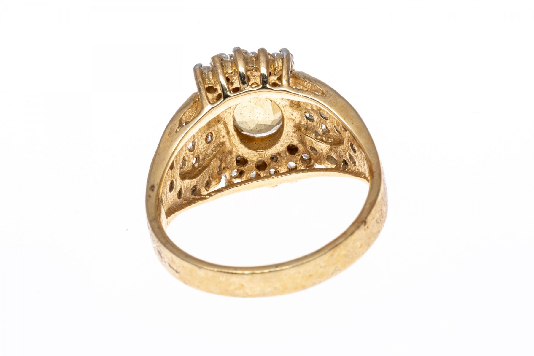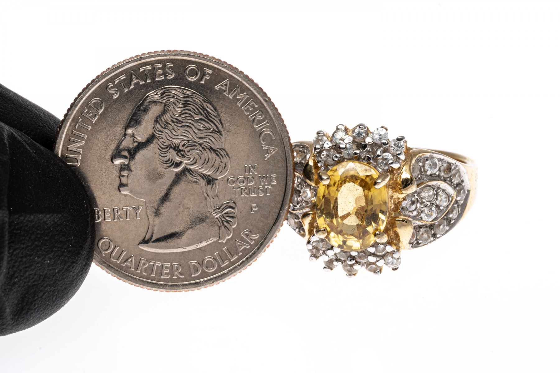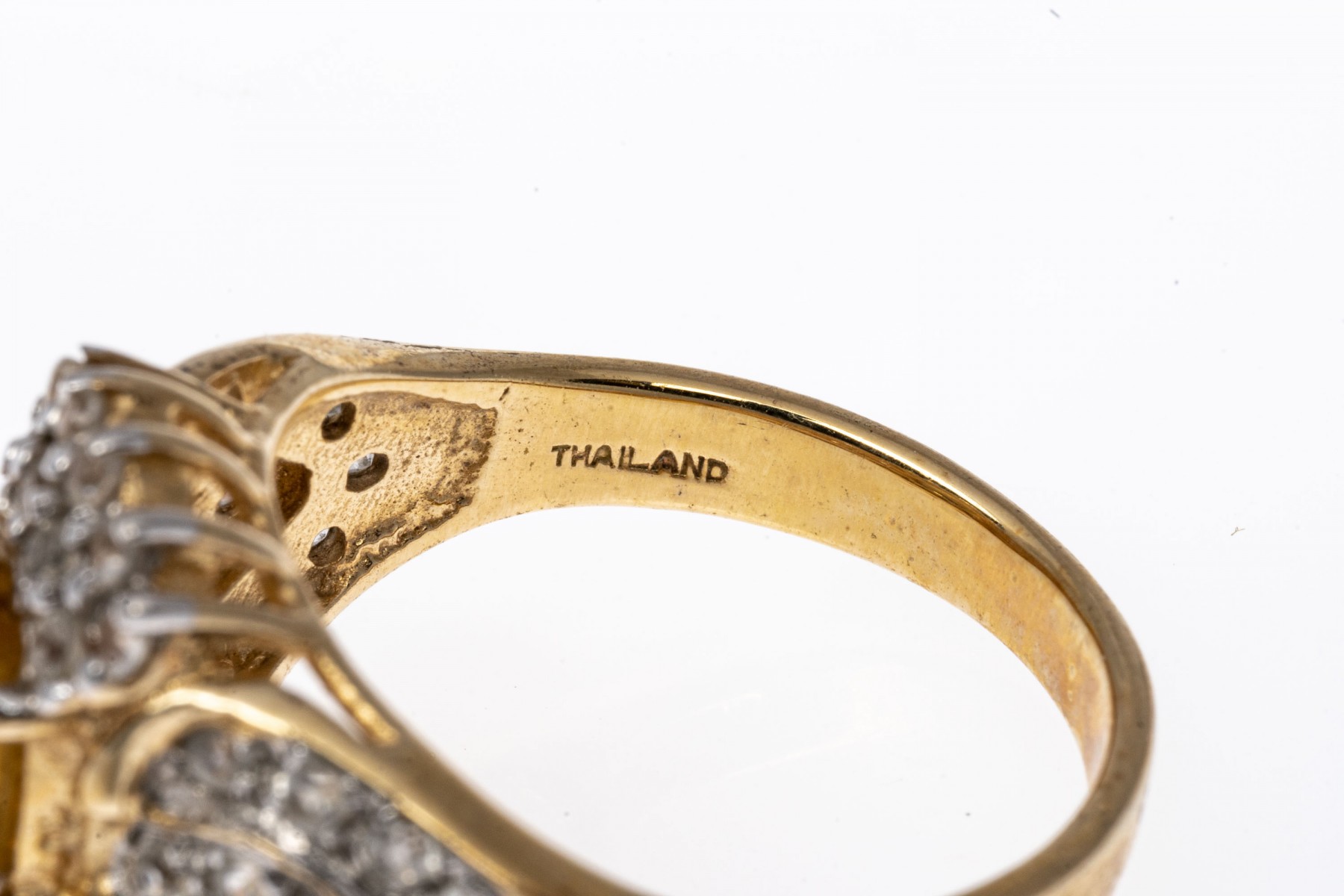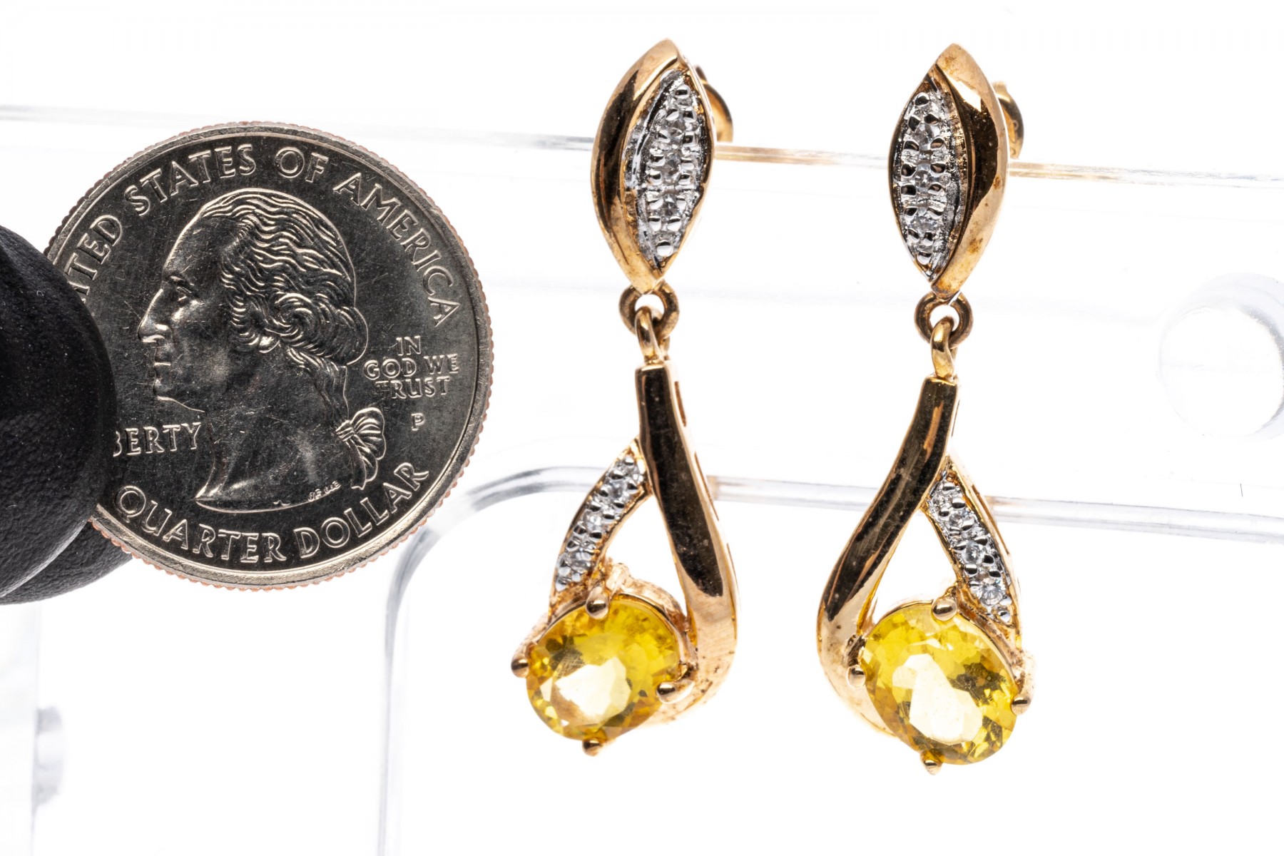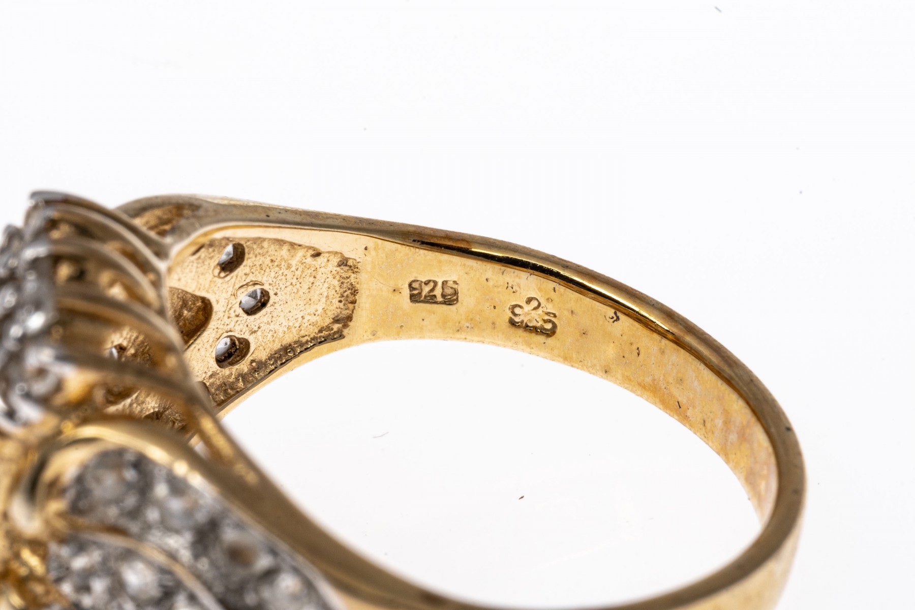 A group of sterling silver vermeil jewelry including ring, earrings and pendant. This bright and lively group contains a pendant with rectangular cut pineapple yellow zirconia and a ring (size 8.75) displaying an oval cut bright yellow zirconia framed by white zirconia that trail down the ring shanks. The earrings display bright yellow citrine stones set into a tear drop designed drop with white stones, post and clutch backings.