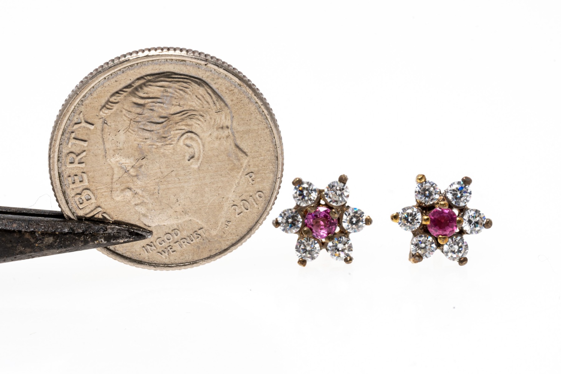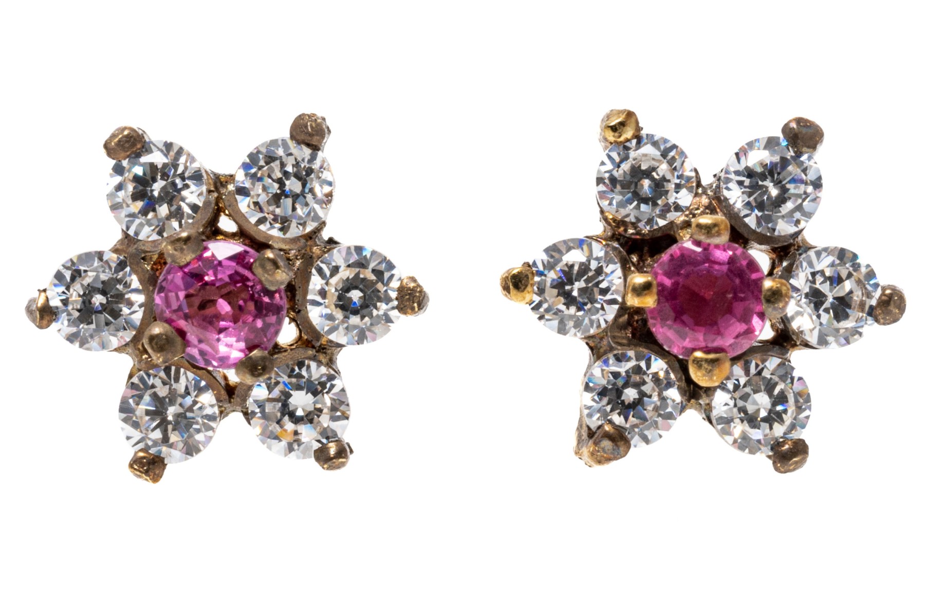 Sterling silver stud earrings. A cluster of white round cut cubic zirconia surrounds a single synthetic pink sapphire. Post backings with 14K yellow gold clutches