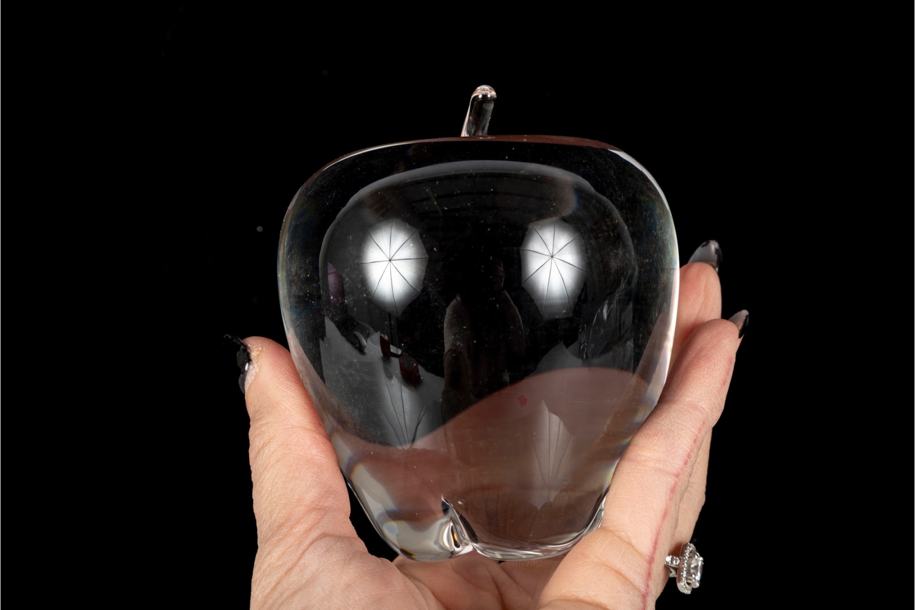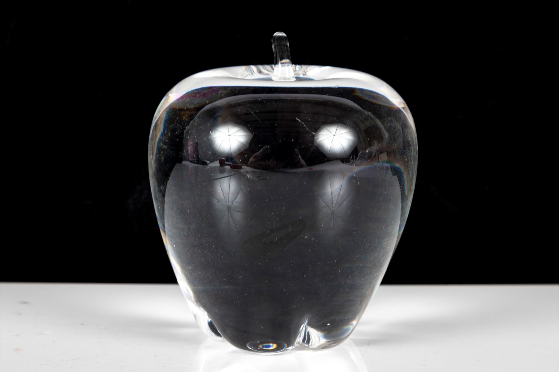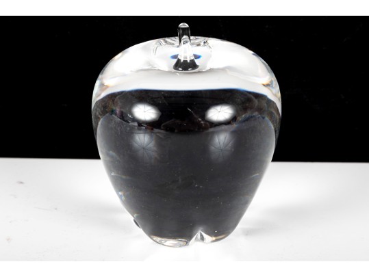 A crystal clear apple-form art glass paperweight by Steuben, signed.