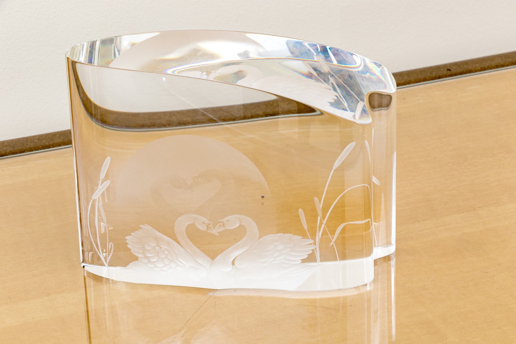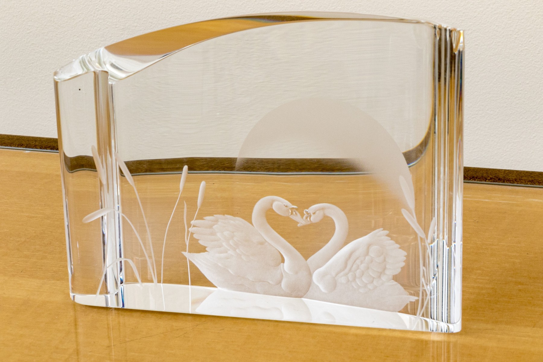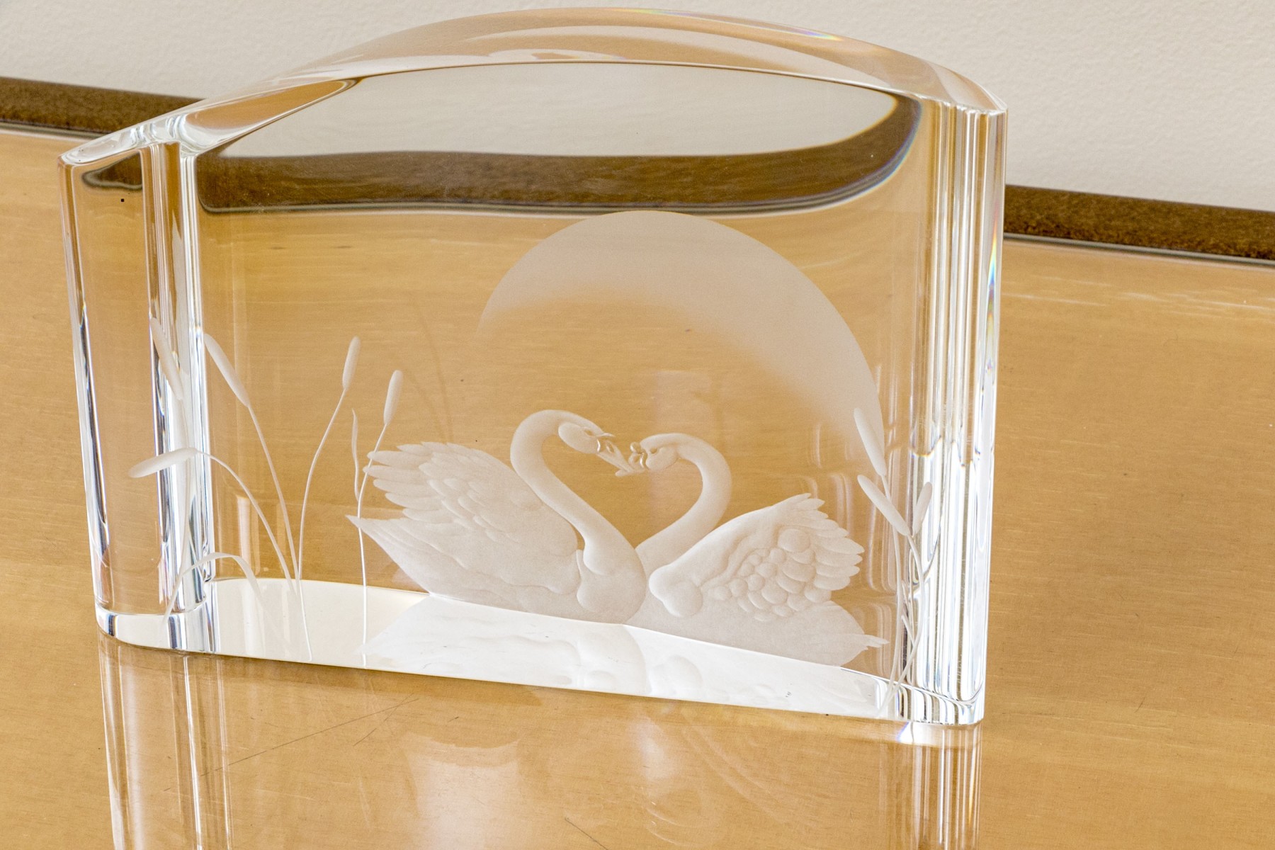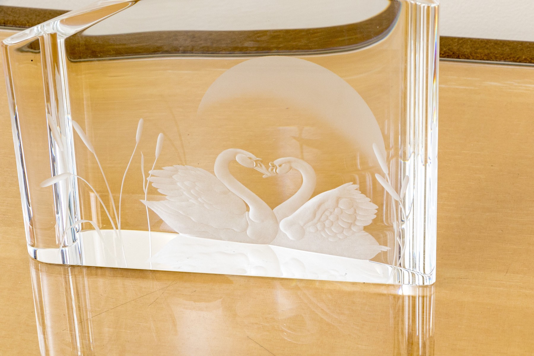 Joel Smith and Cary Austin for Steuben "Our Love" crystal sculpture depicting two courting doves with curved necks coming together to form a heart against a moonlight lake background.