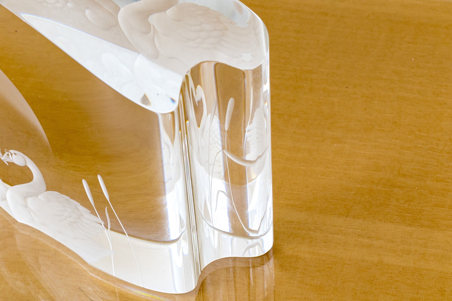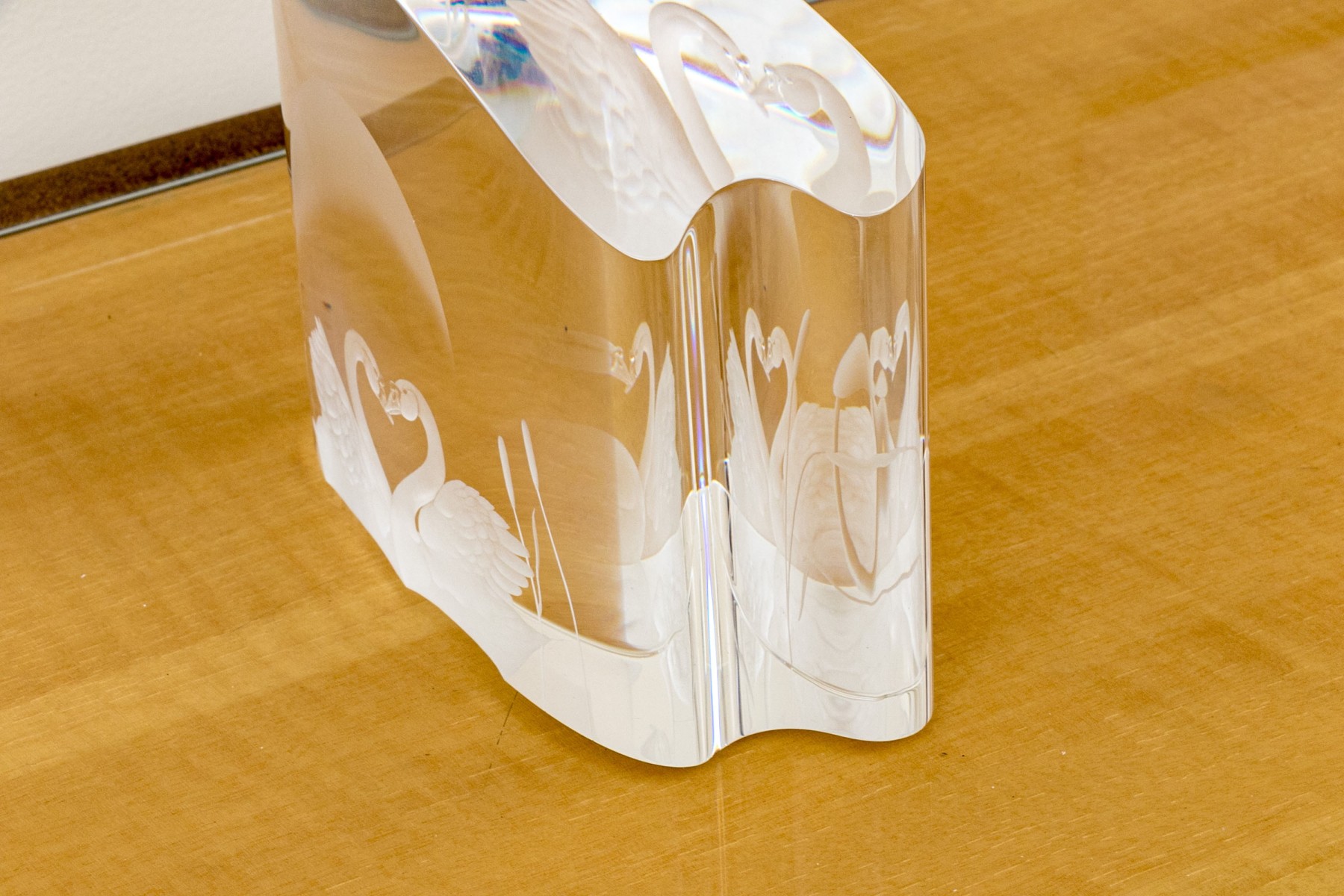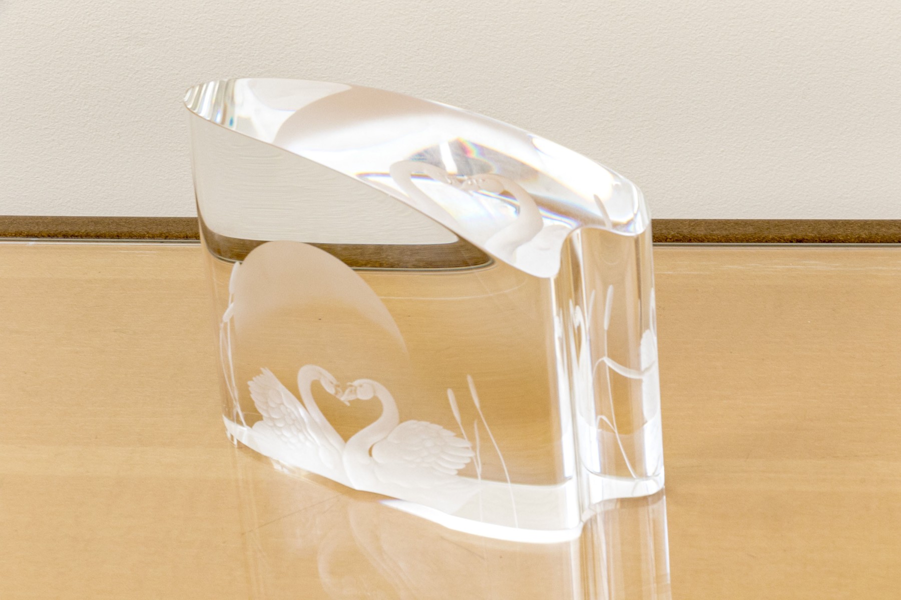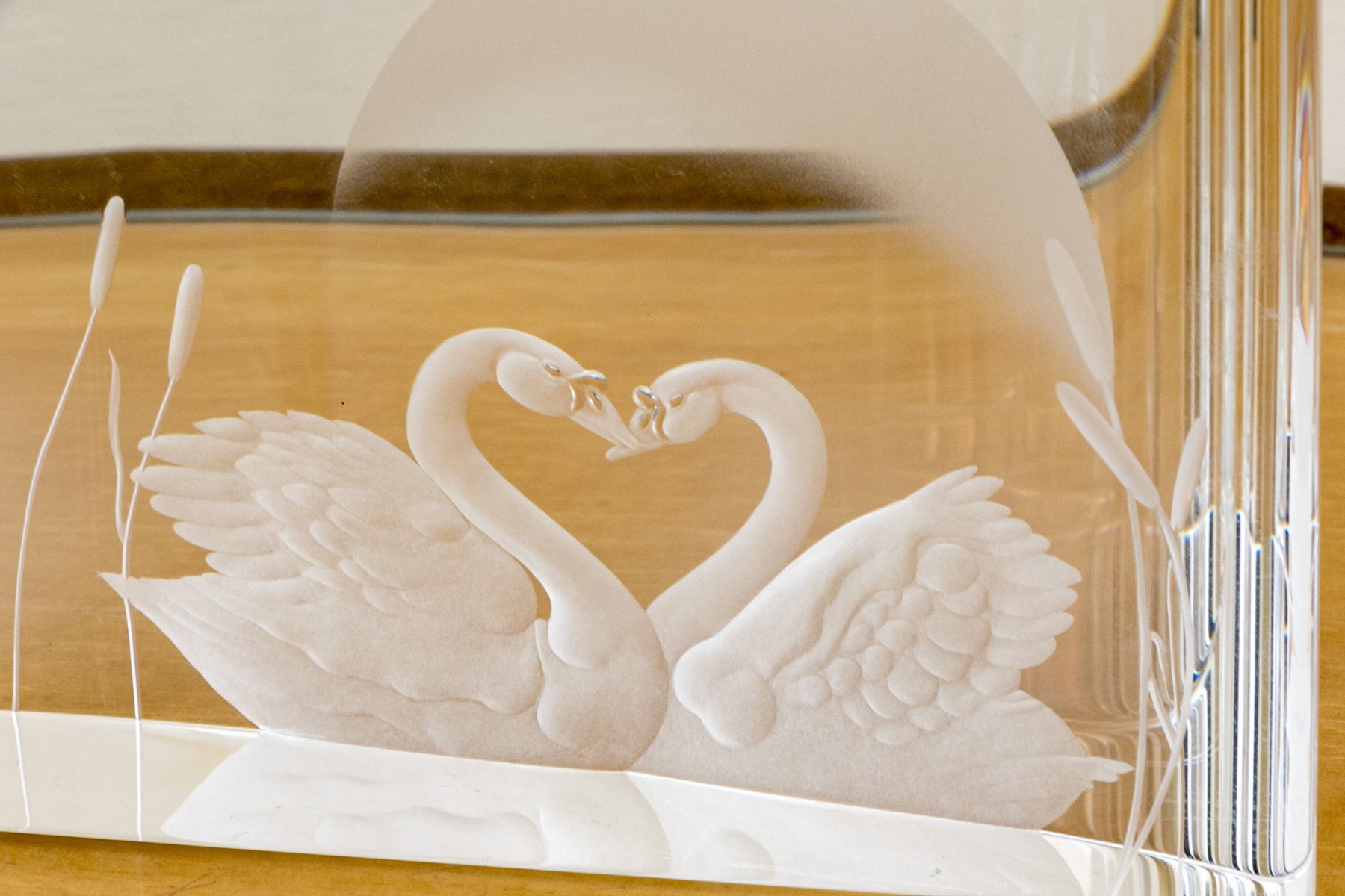 Joel Smith and Cary Austin for Steuben "Our Love" crystal sculpture depicting two courting doves with curved necks coming together to form a heart against a moonlight lake background.