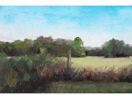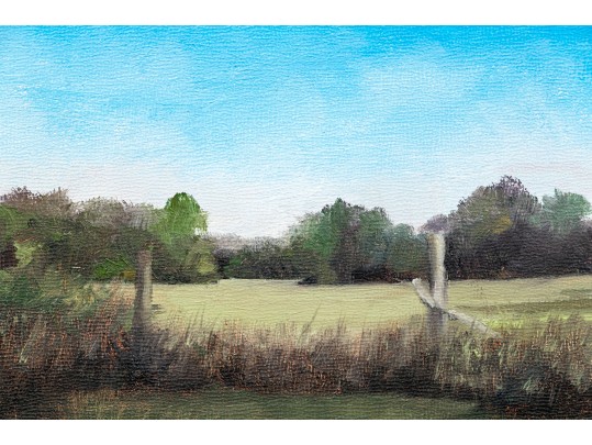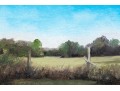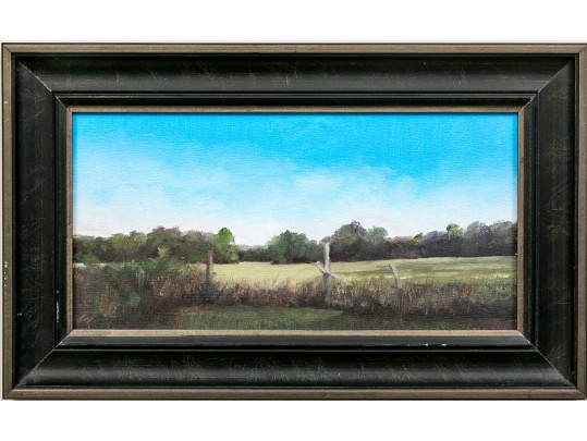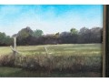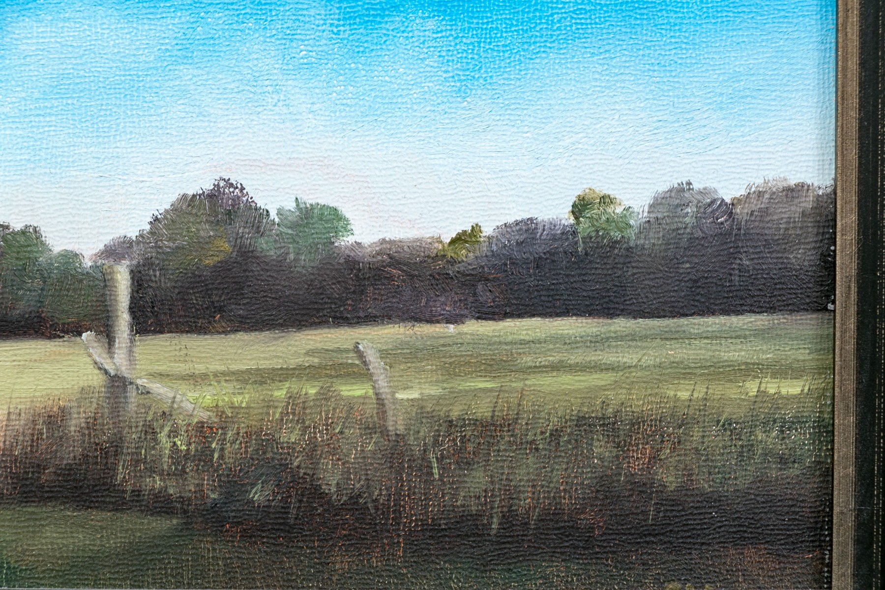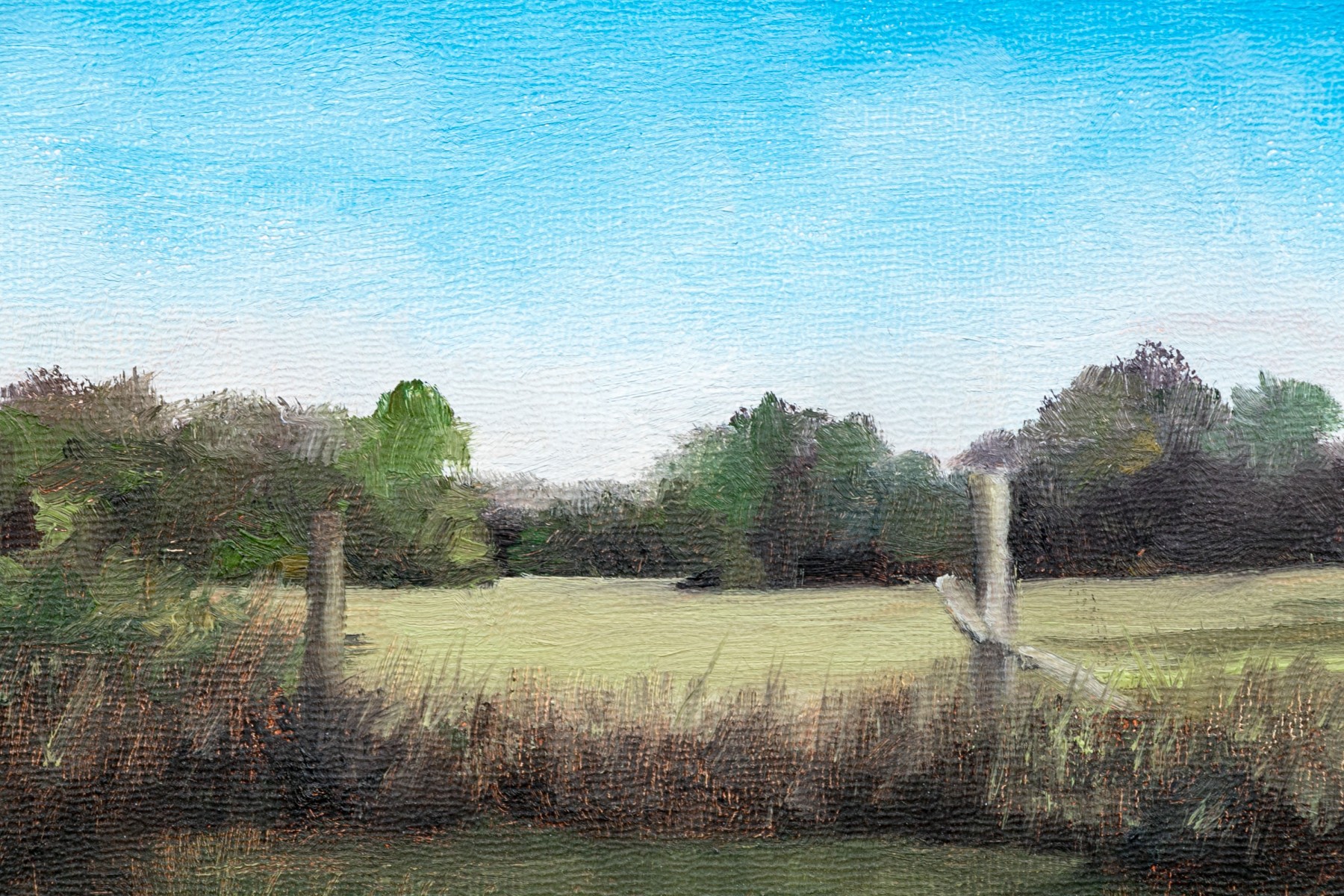 An original oil painting of a farm and trees. A landscape with an open field with a distant tree line with a wooden fence.