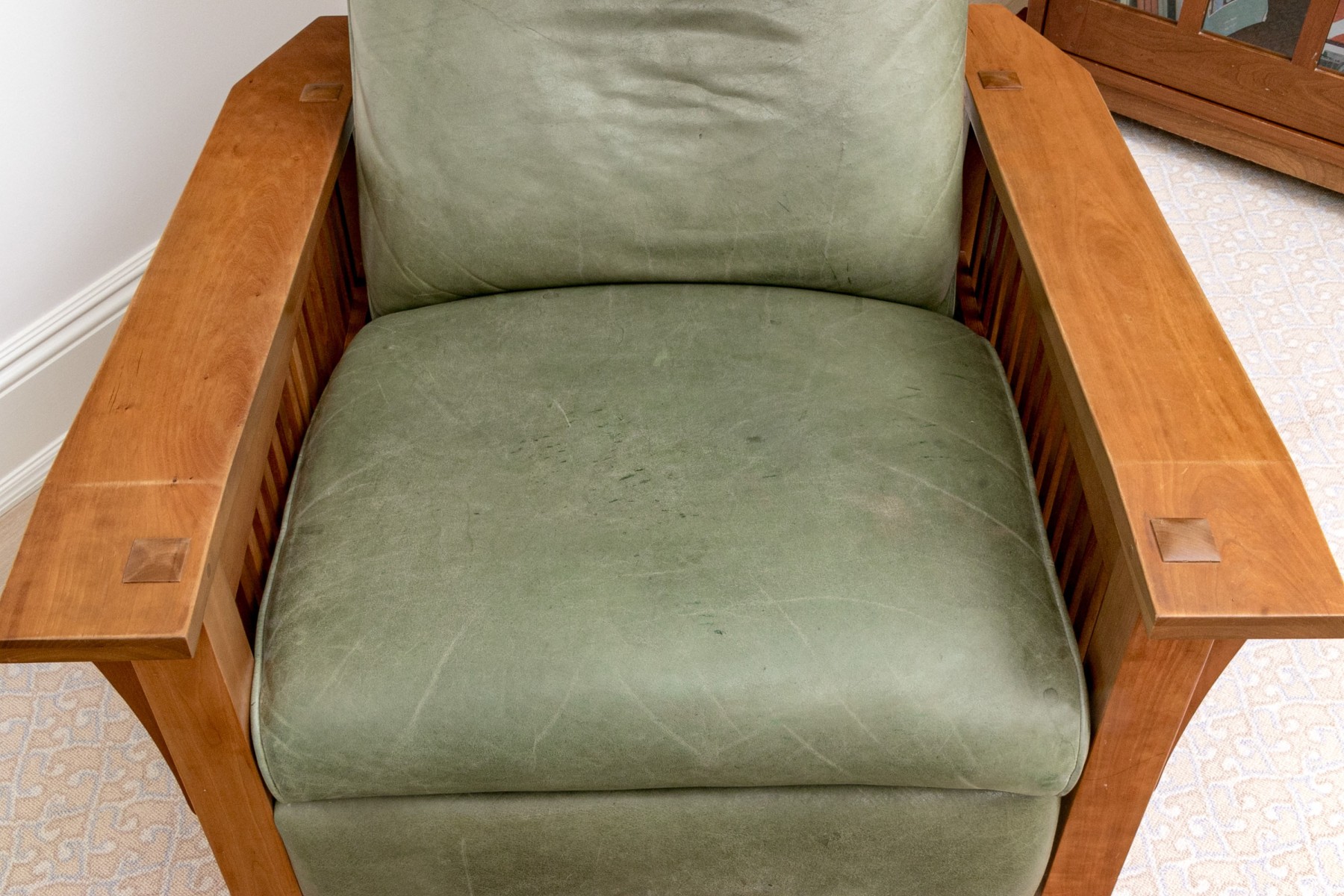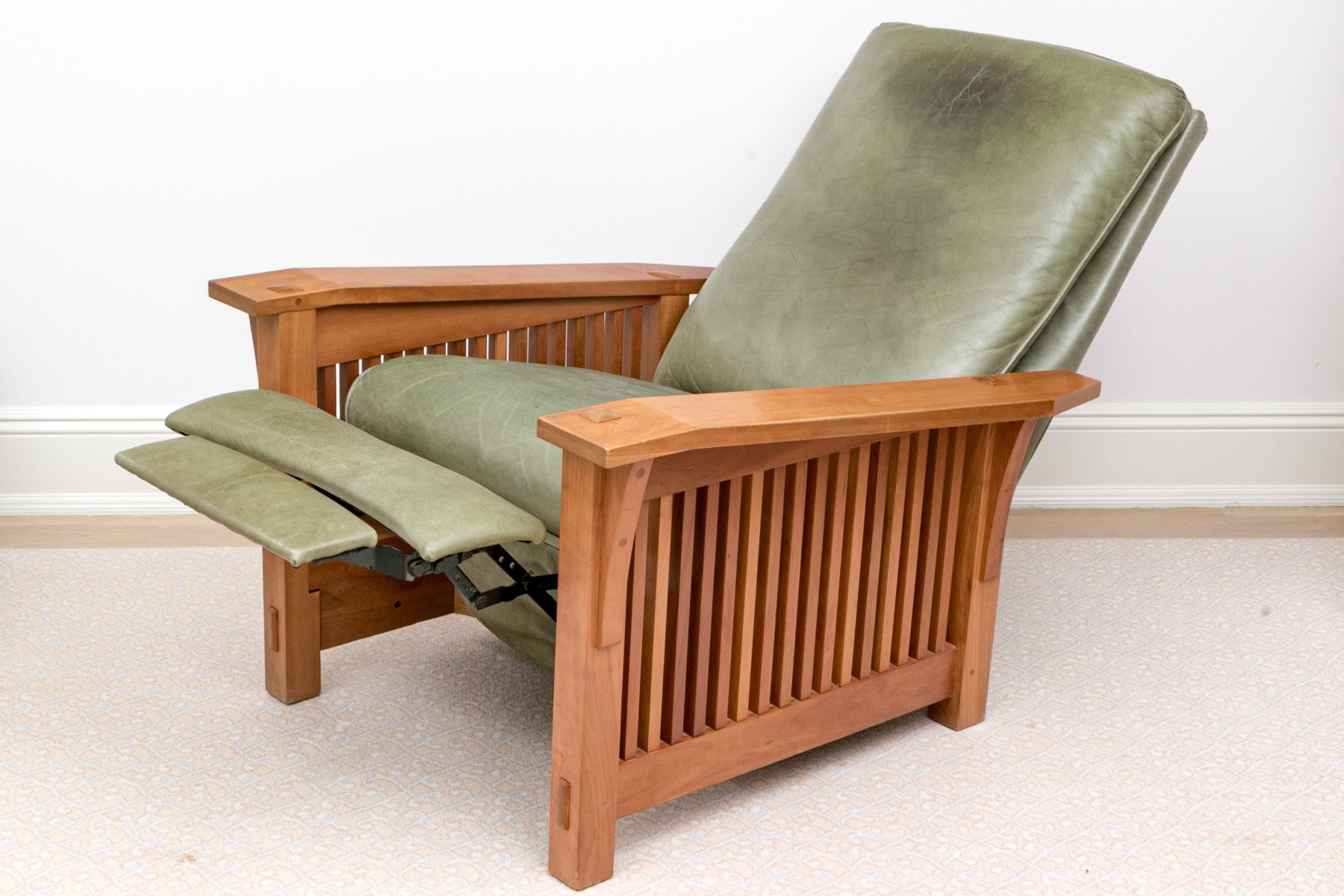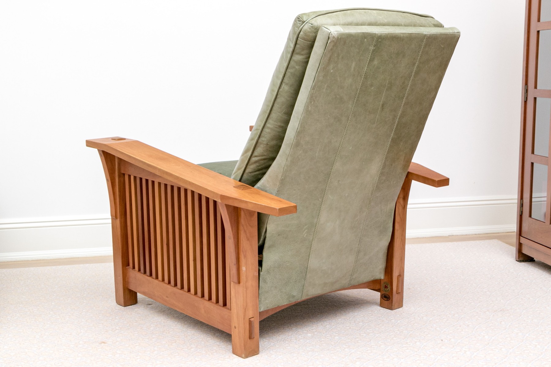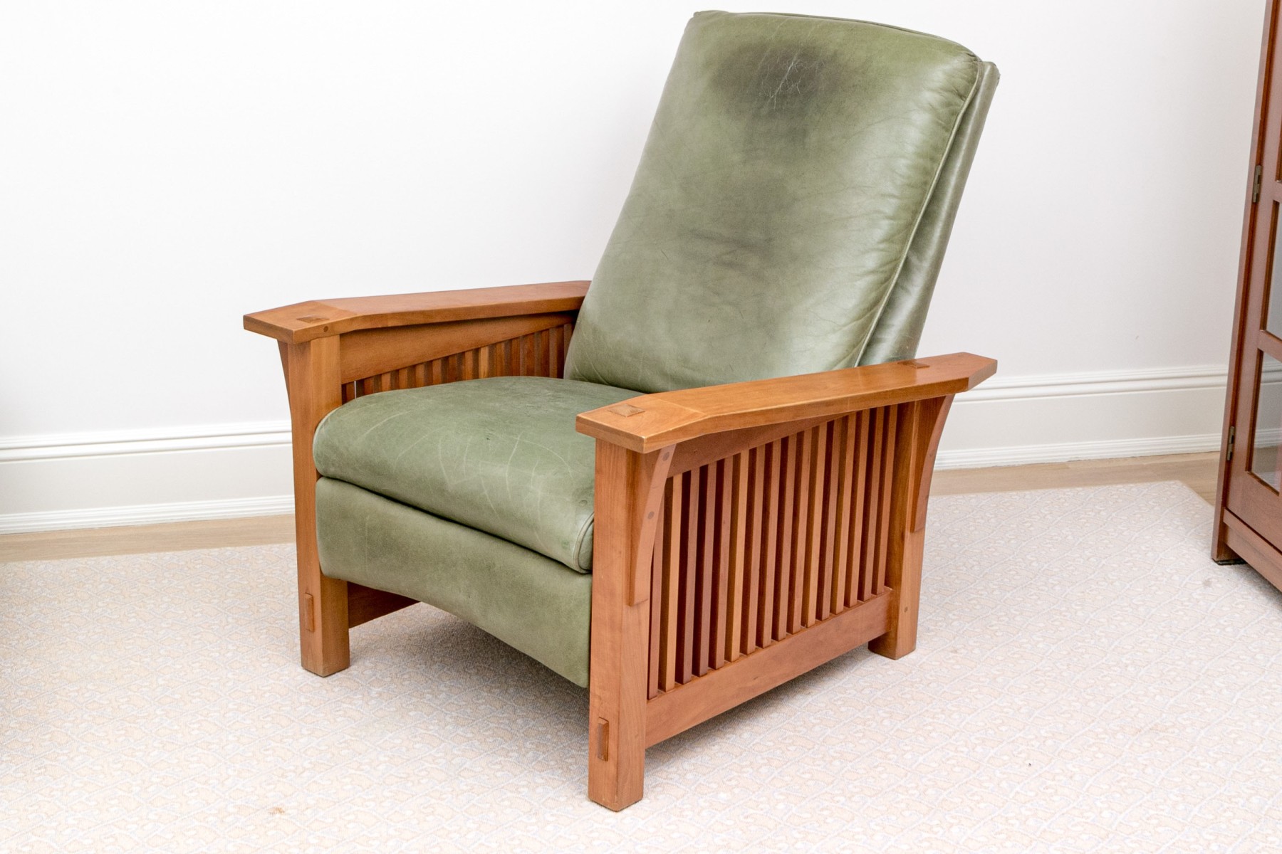 A handsome Stickley Arts & Crafts style recliner in honeyed brown cherry wood with sage green leather upholstery. Features a comfortable, tall back and angled arms over slatted sides with mortise and tenon joinery.