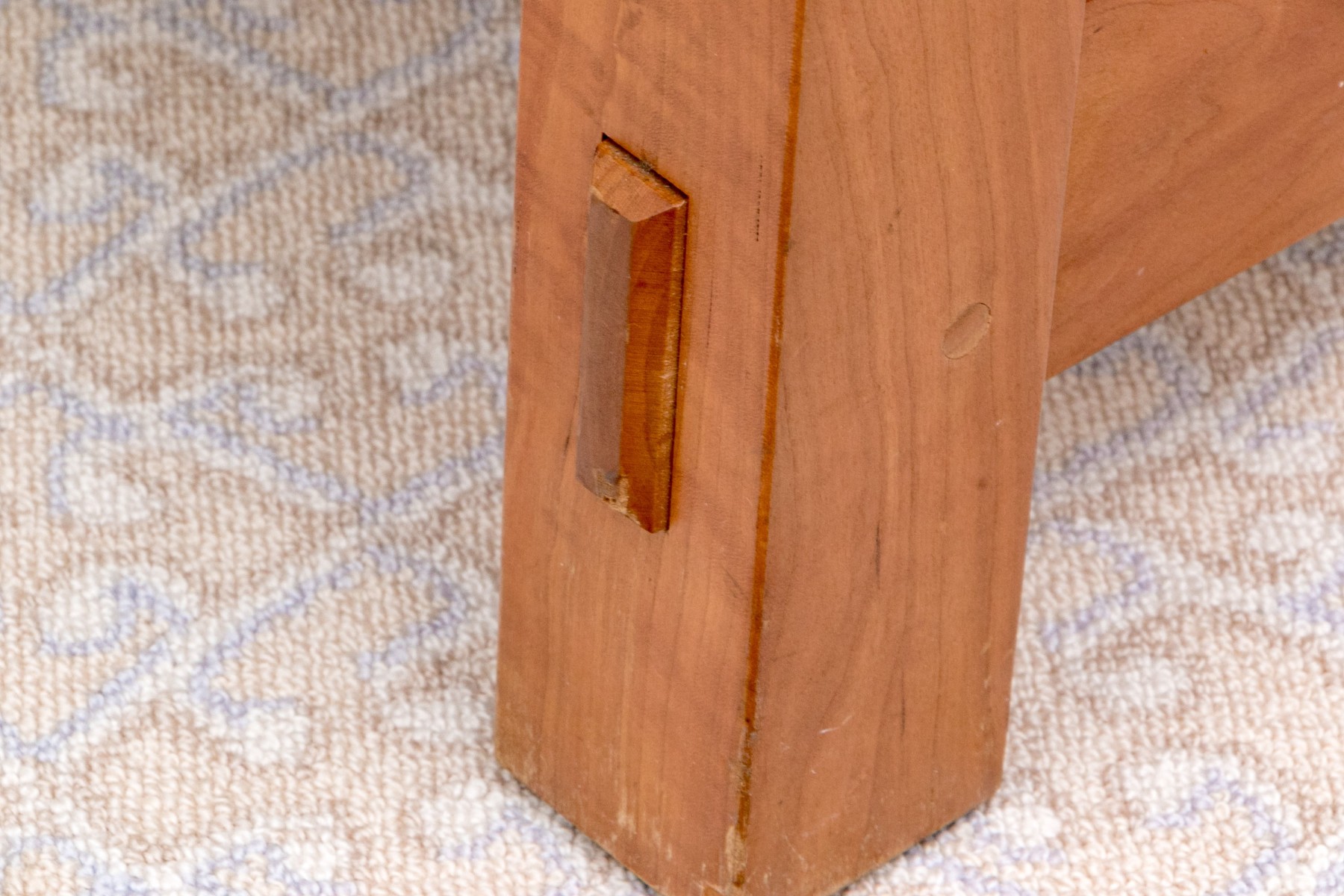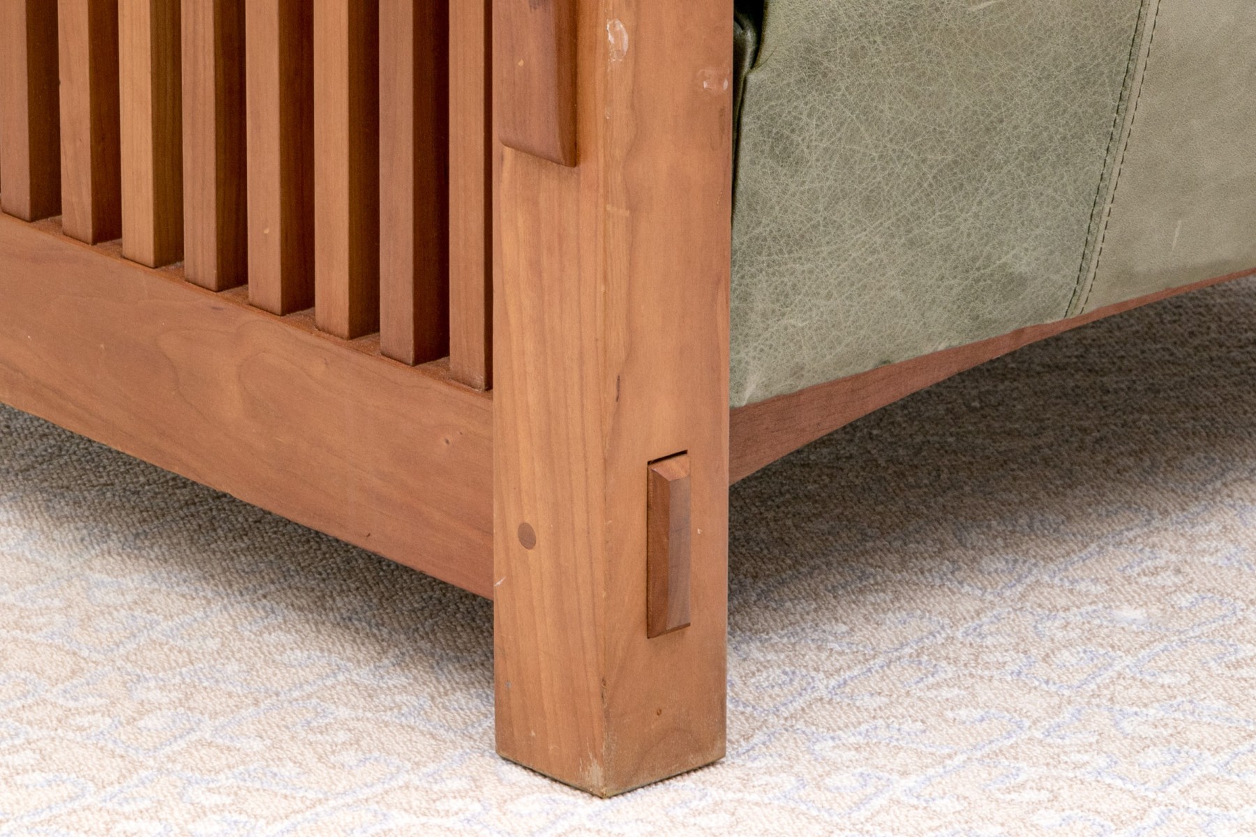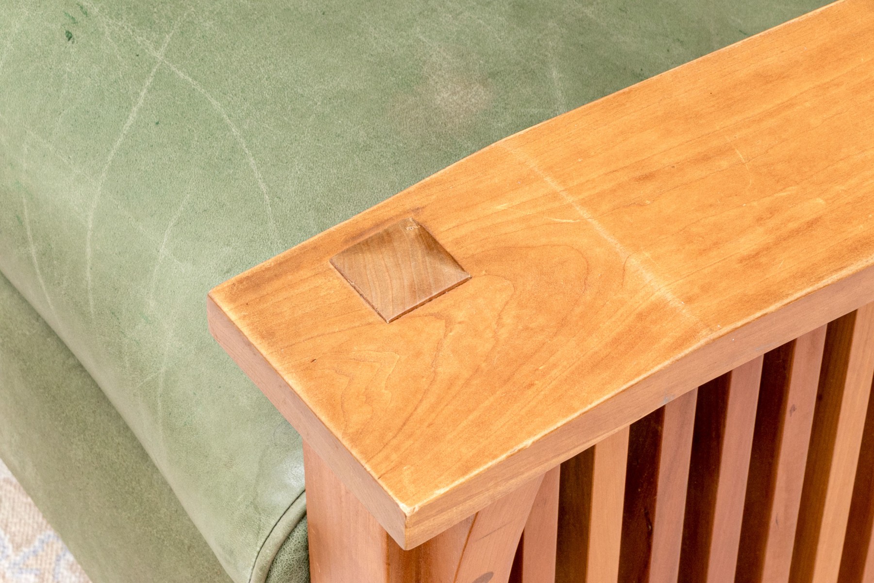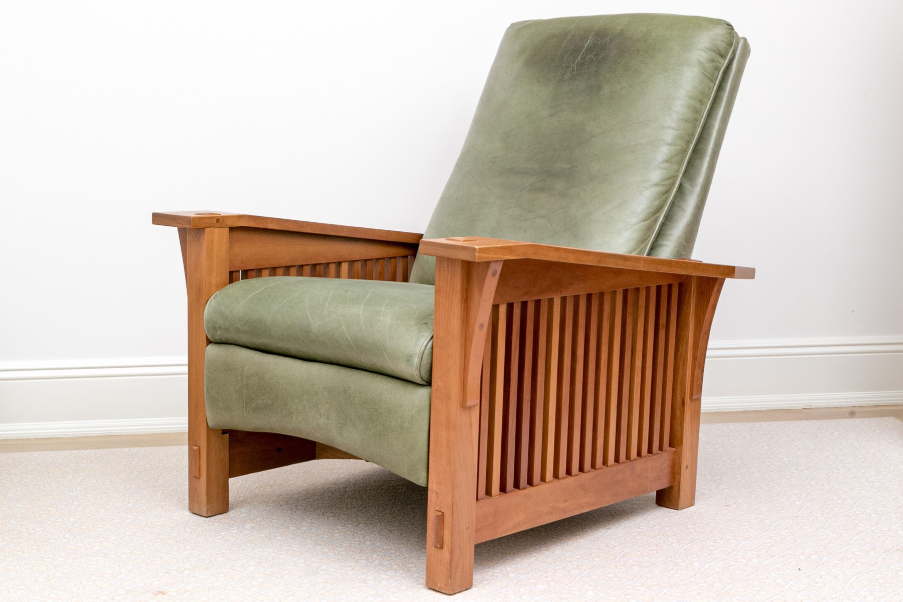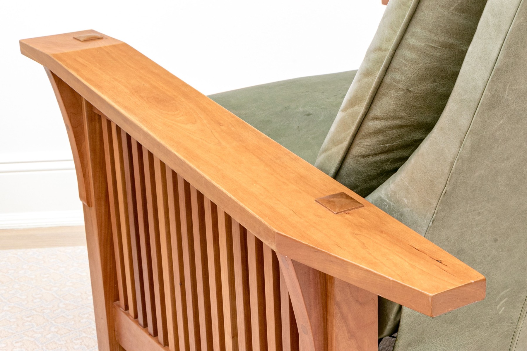 A handsome Stickley Arts & Crafts style recliner in honeyed brown cherry wood with sage green leather upholstery. Features a comfortable, tall back and angled arms over slatted sides with mortise and tenon joinery.