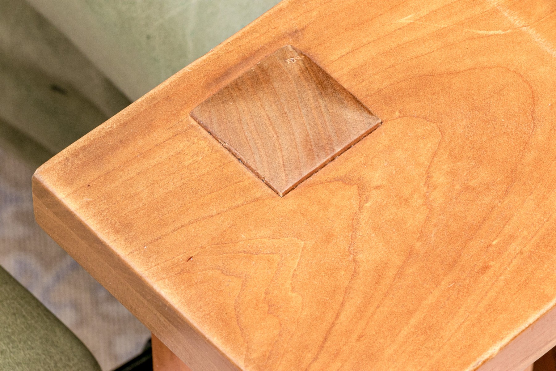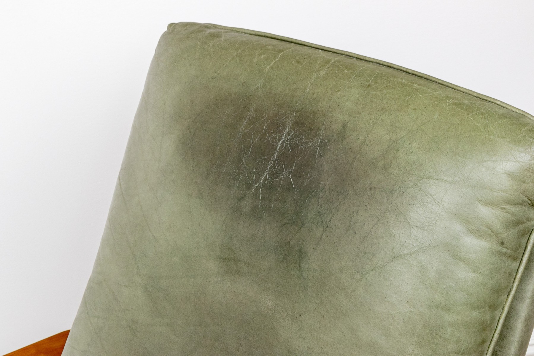 Leather is charmingly worn and darkened (with a bit of crackling) from years of love. Frame is very good with minor surface scratches to arms.
