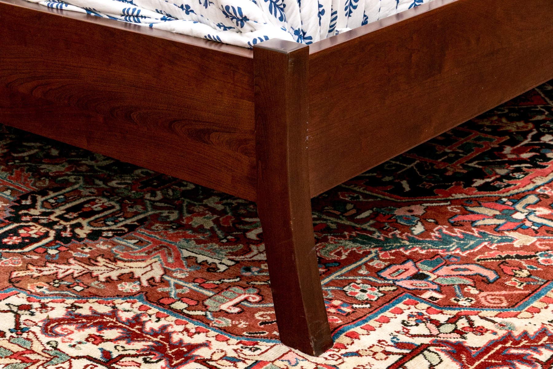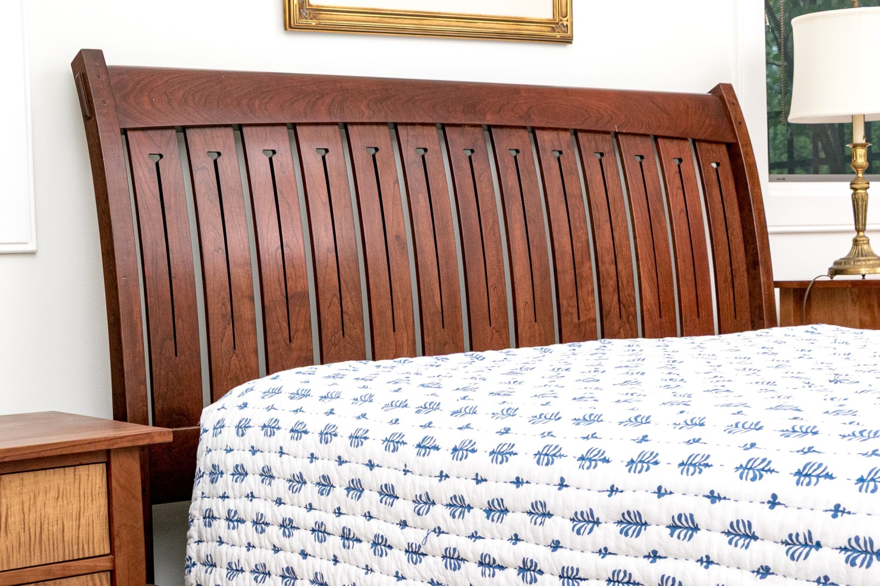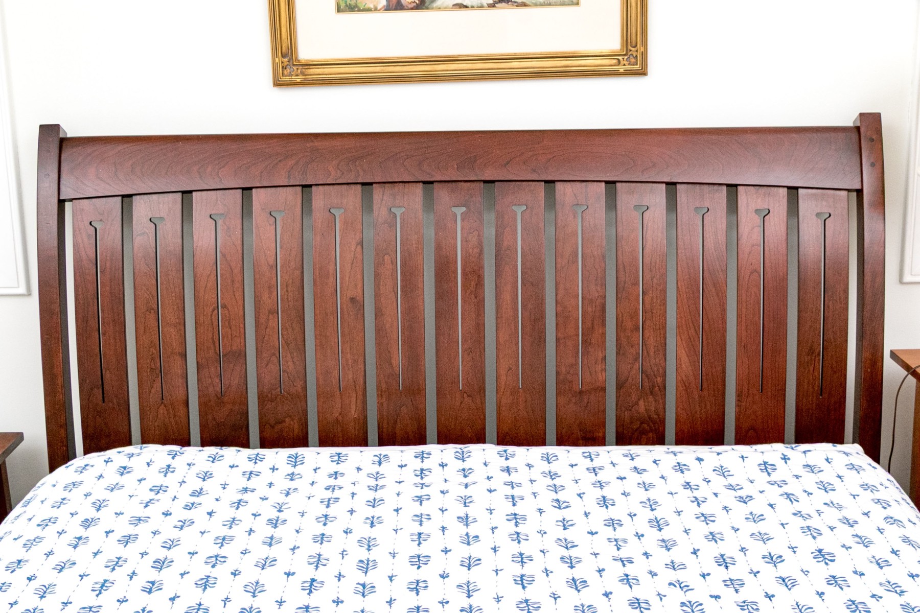 A high quality Stickley Furniture Cherry Mission Collection queen size bedstead finely crafted in rich red-brown wood with captivating, subtly waving wood grain. The frame features a gently curved sleigh bed form with appealing tenon and mortise joints at the ends of a gently arched top rail along the headboard heralding a slatted center further detailed by intriguing pierced motifs. Tall side rails follow flush with the foot rail, raied on sleek, dramatically curved legs.