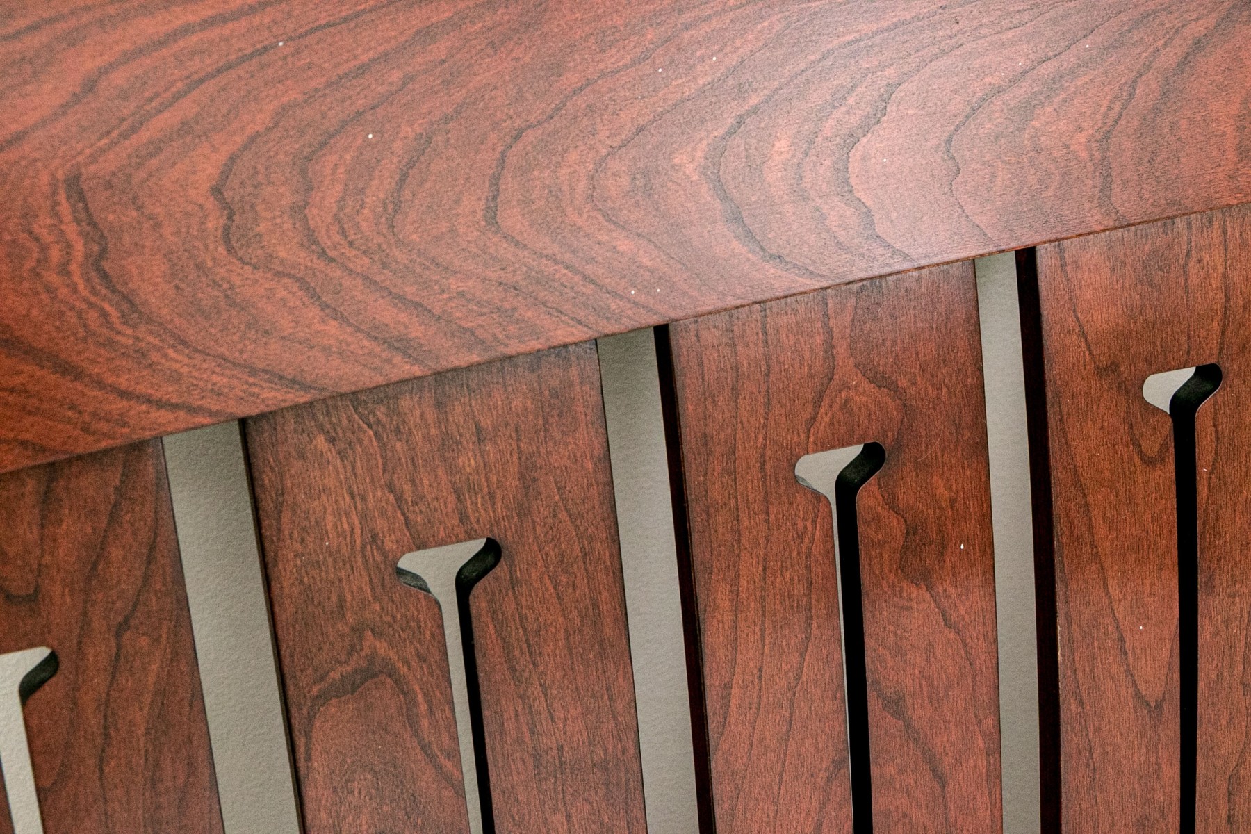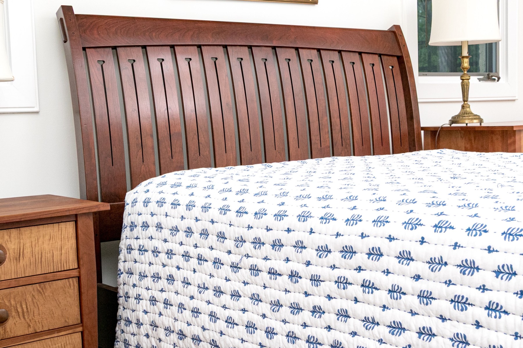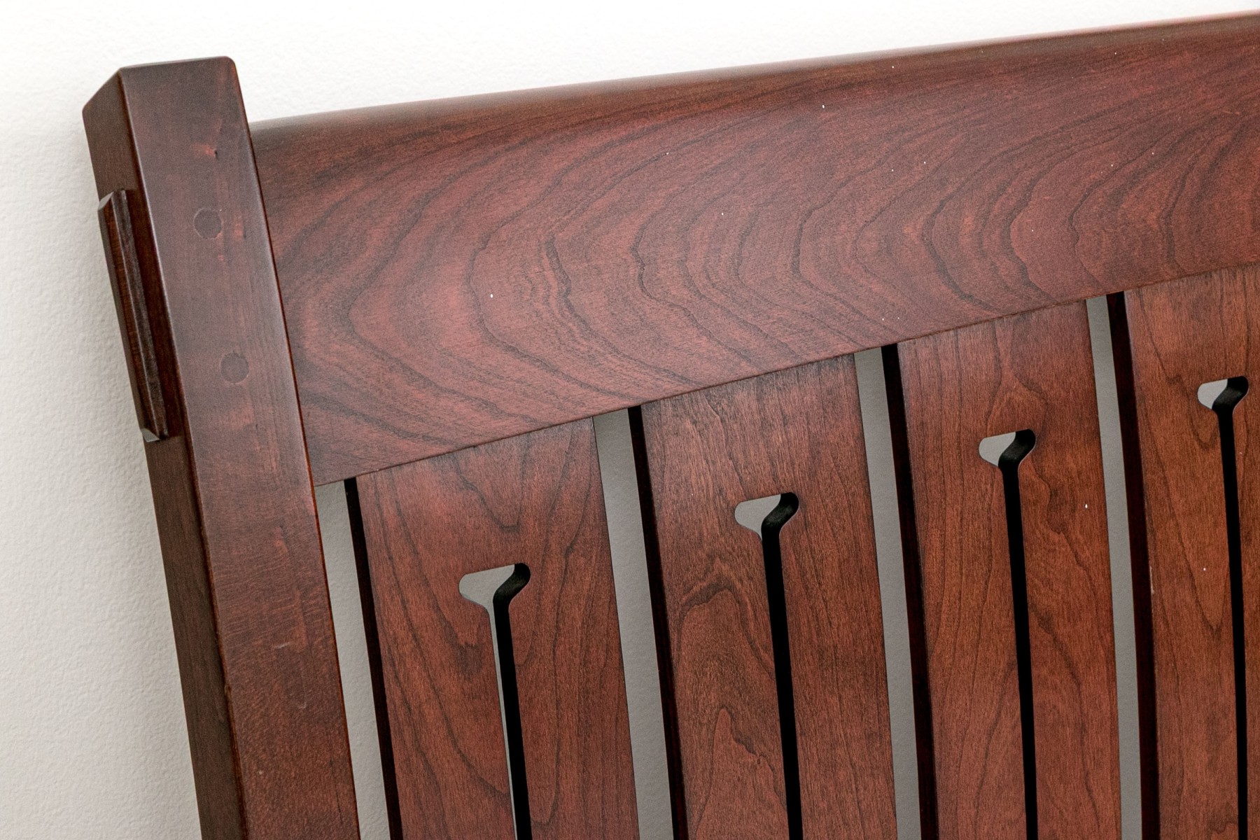 A high quality Stickley Furniture Cherry Mission Collection queen size bedstead finely crafted in rich red-brown wood with captivating, subtly waving wood grain. The frame features a gently curved sleigh bed form with appealing tenon and mortise joints at the ends of a gently arched top rail along the headboard heralding a slatted center further detailed by intriguing pierced motifs. Tall side rails follow flush with the foot rail, raied on sleek, dramatically curved legs.