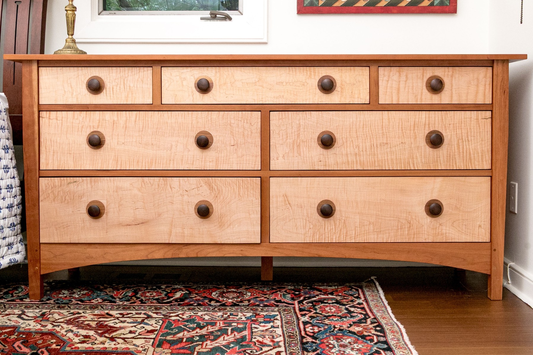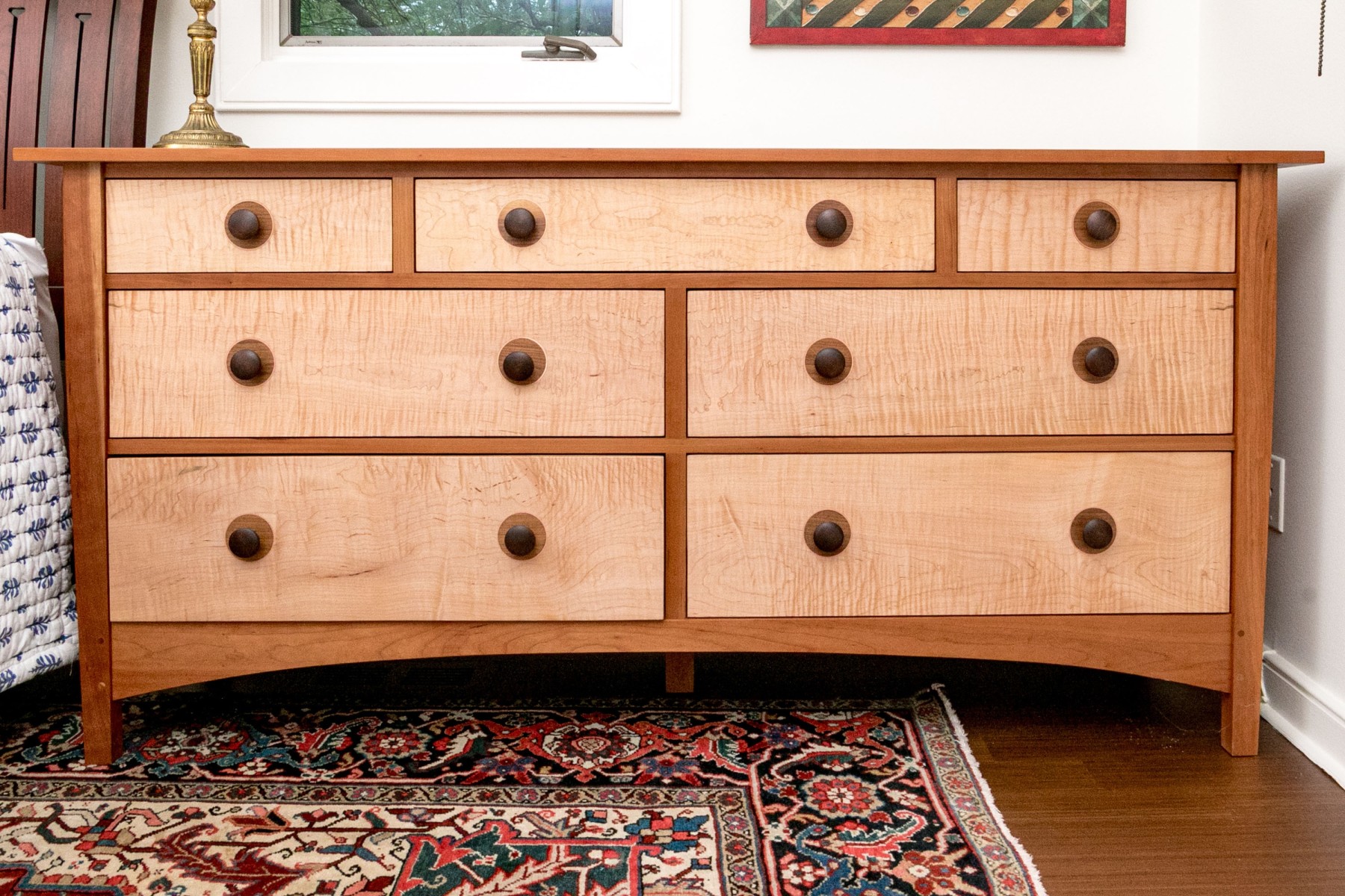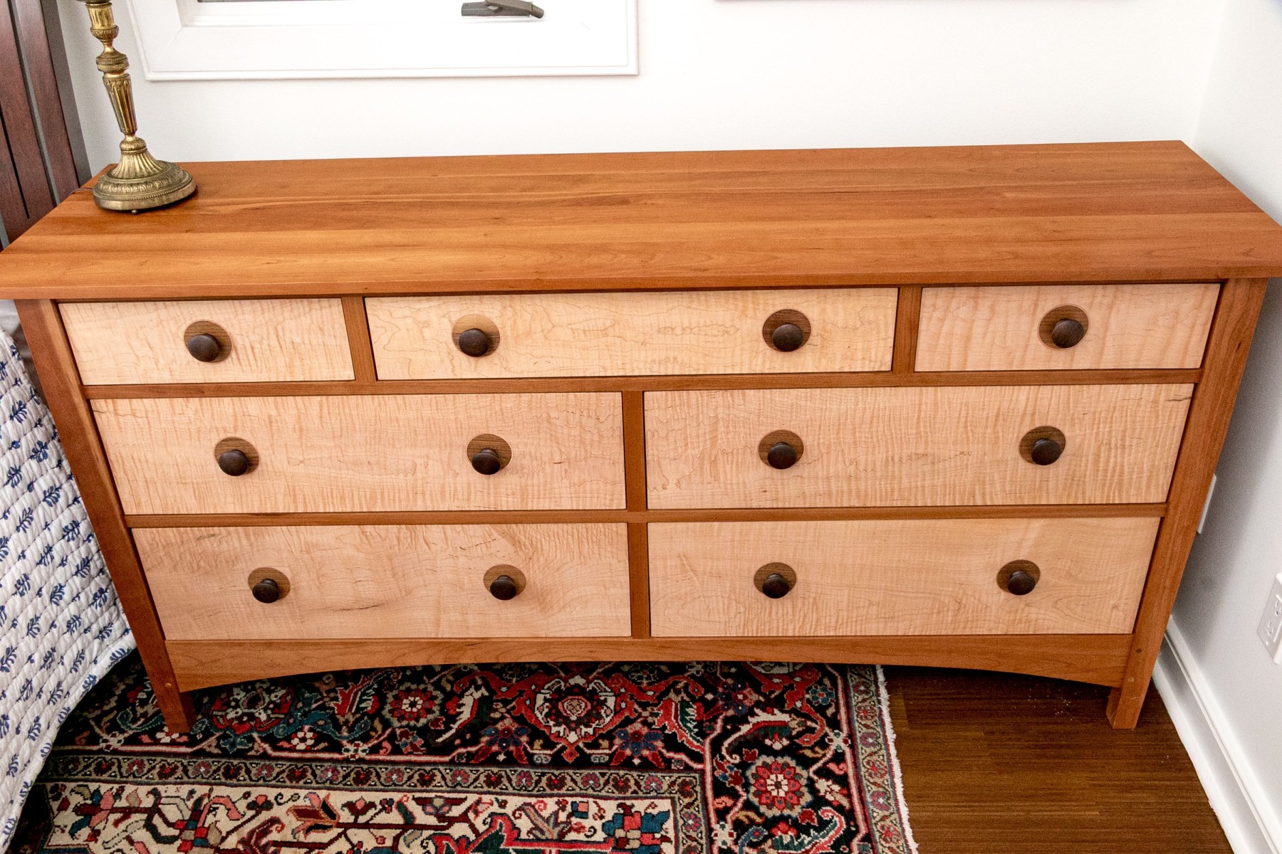 The Stickley inlaid Cherry dresser chest of rectangular form, stands upon four legs with seven figured drawers fronts. Featuring four drawers, in bays of two with a central long drawer flanked by two short drawers above. All drawers with knob pulls.