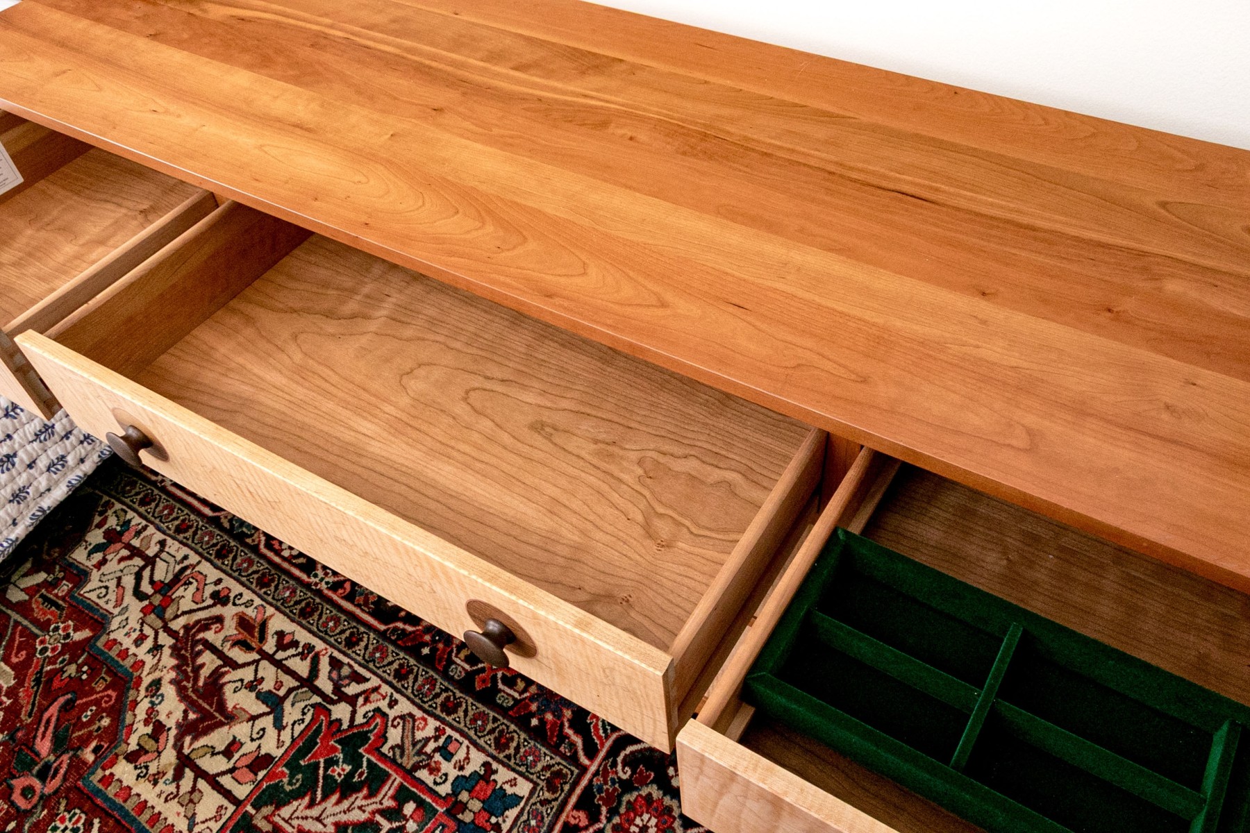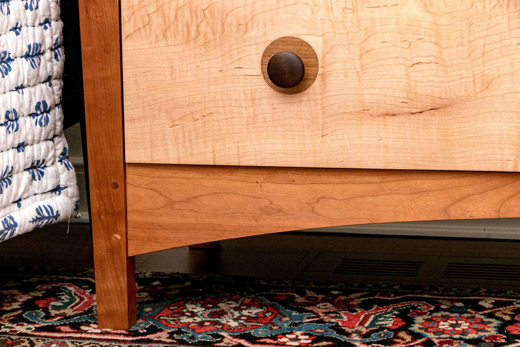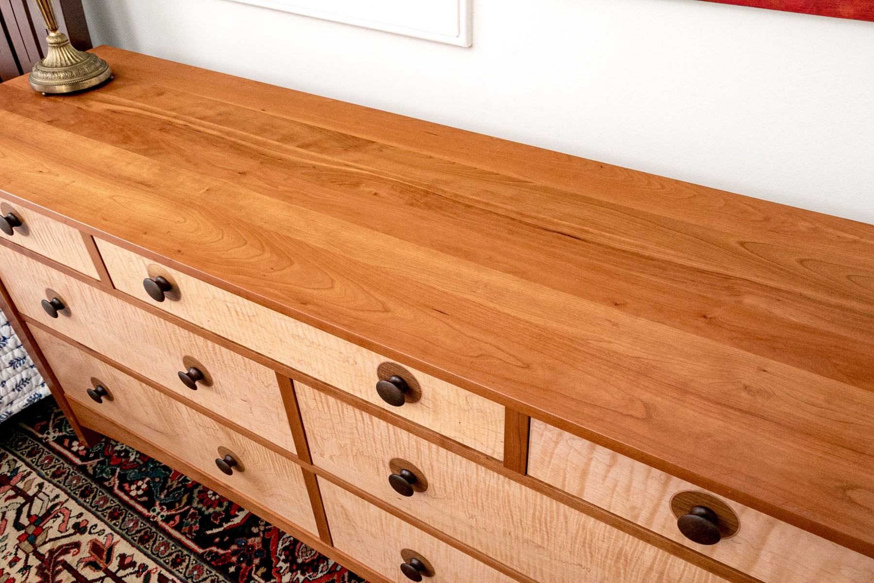 The Stickley inlaid Cherry dresser chest of rectangular form, stands upon four legs with seven figured drawers fronts. Featuring four drawers, in bays of two with a central long drawer flanked by two short drawers above. All drawers with knob pulls.
