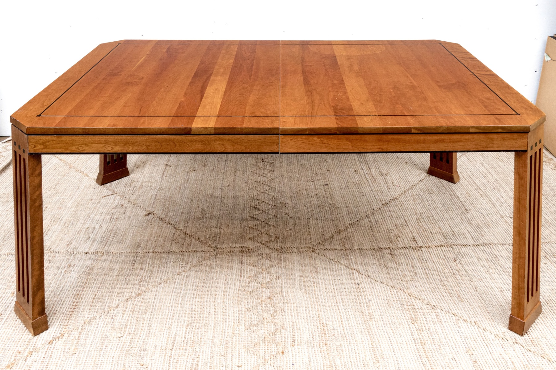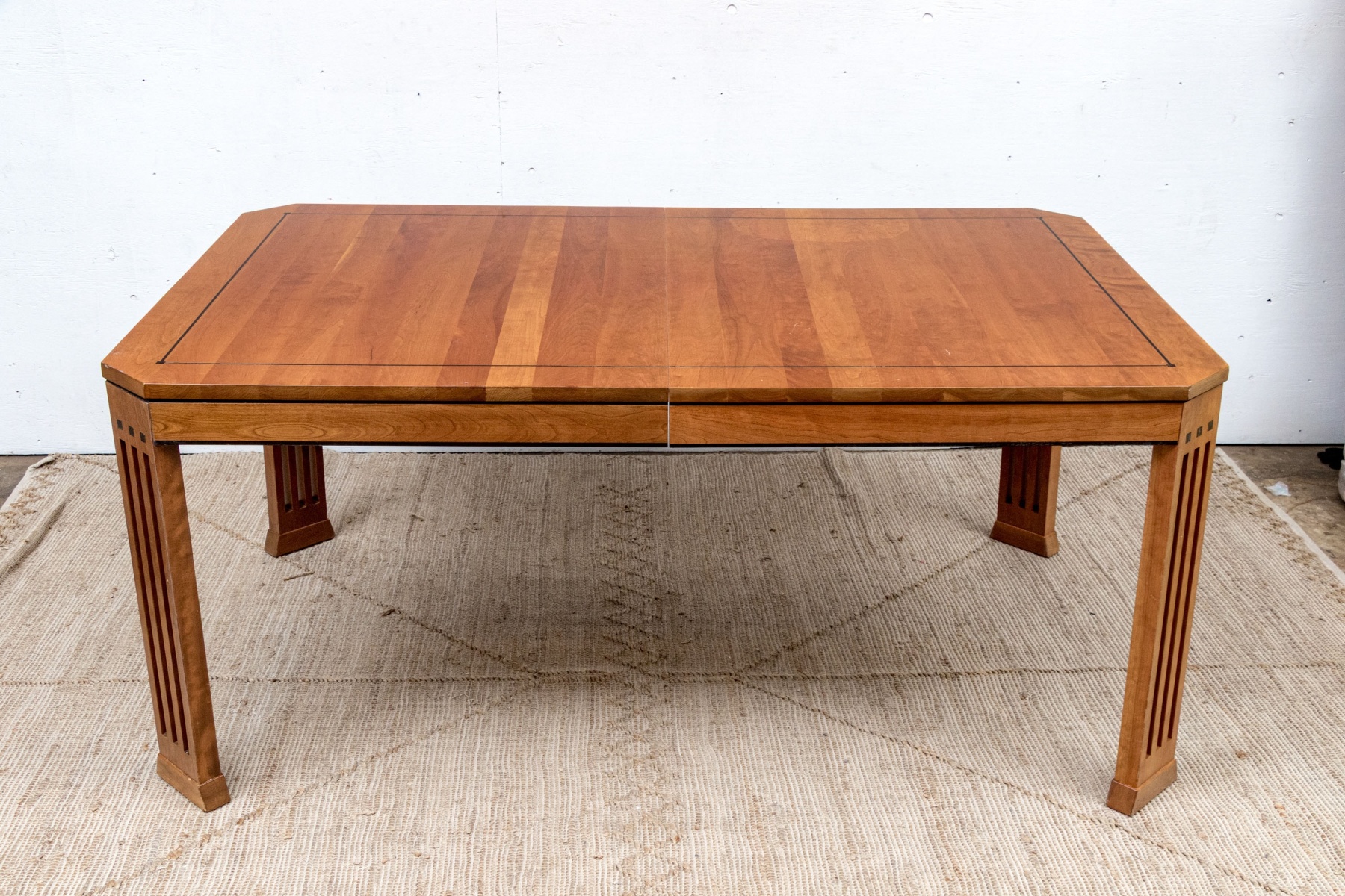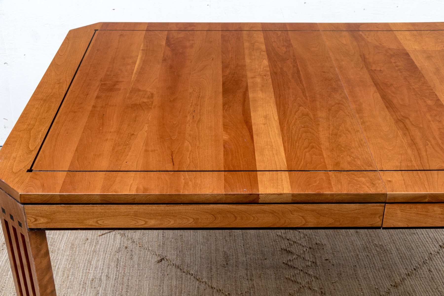 A high quality Stickley extension dining table with great mission and arts and crafts appeal, well constructed in richly hued warm-toned medium brown wood with a cut-corner rectangular table top detailed by a dark brown inlaid border. The table is supported by four angled rectangular legs with dark square inlays heralding pierced rails and block feet. Includes two extension leaves in a single felt bag.