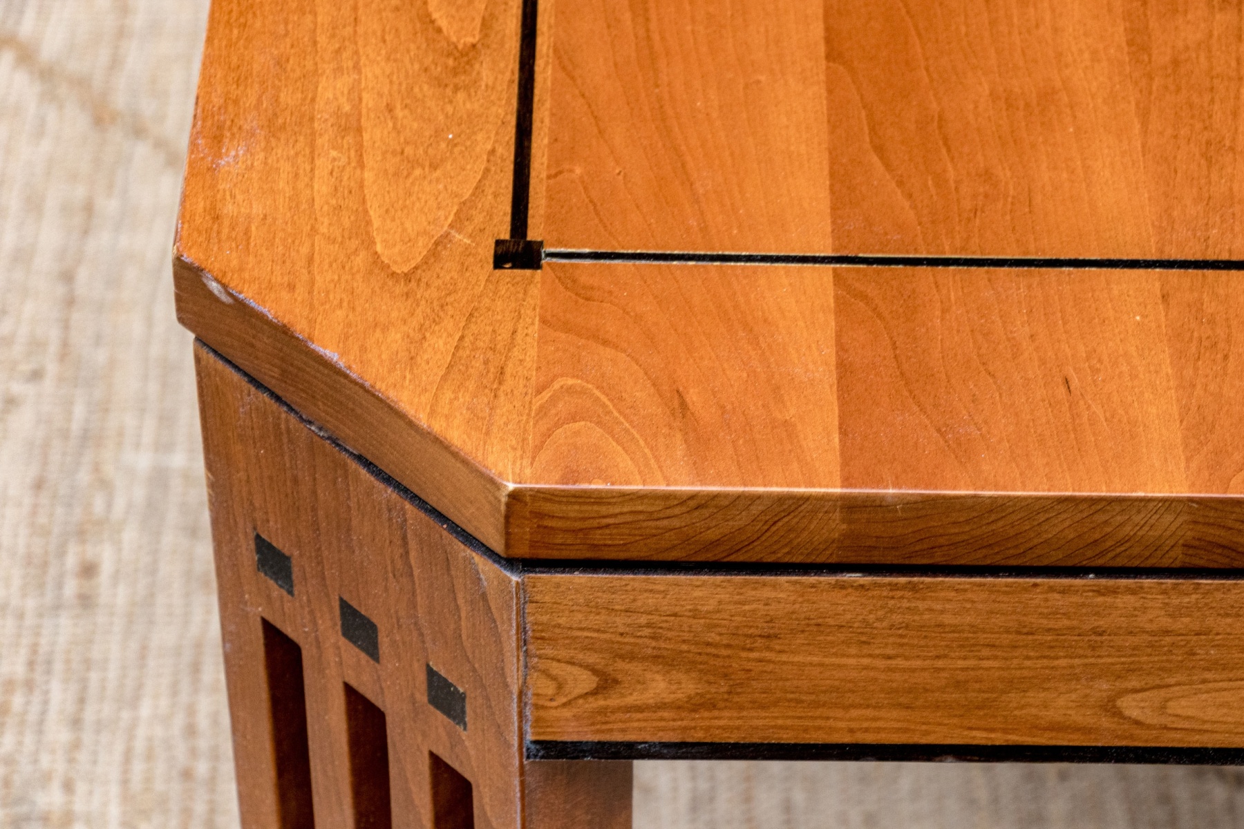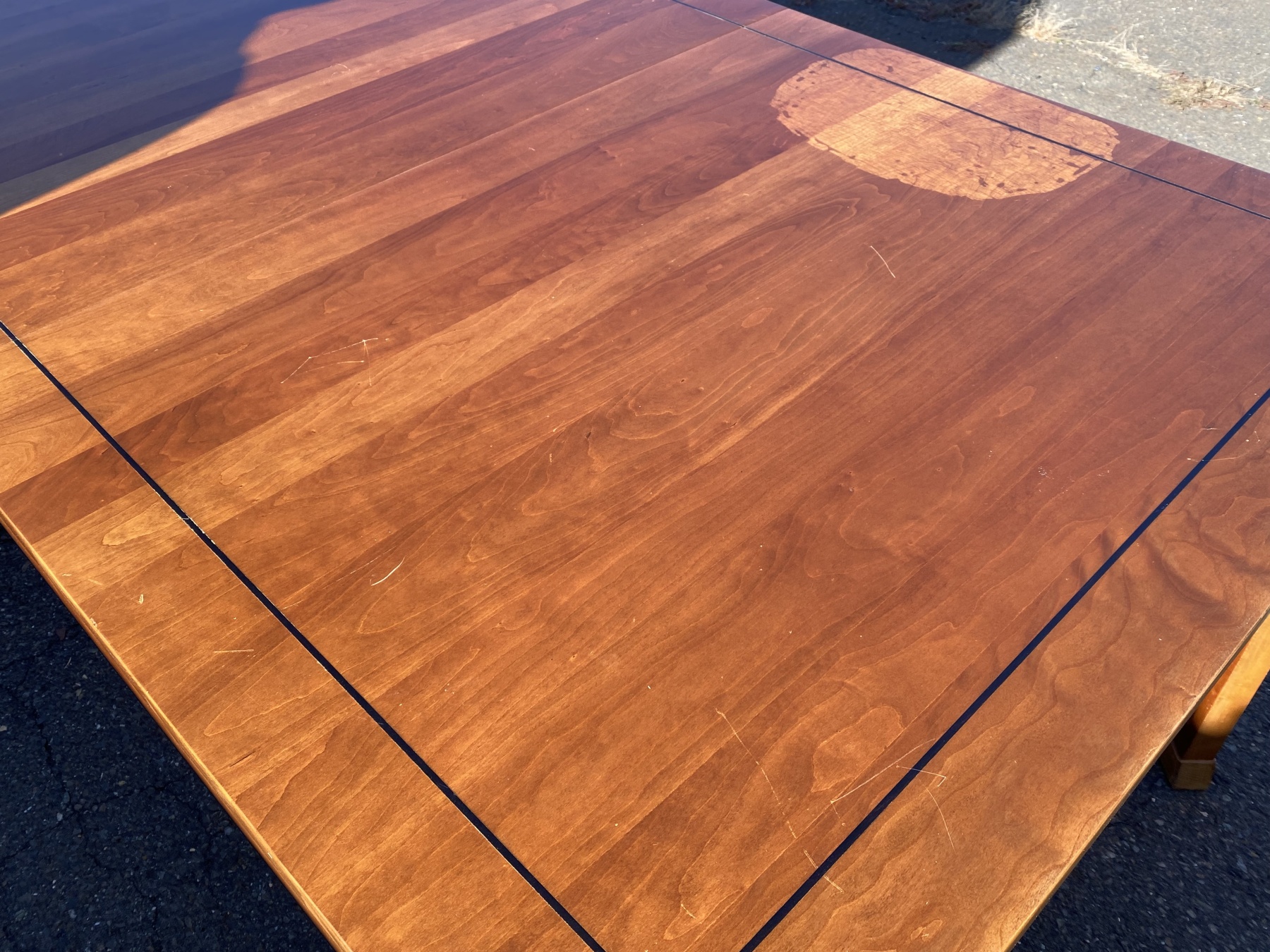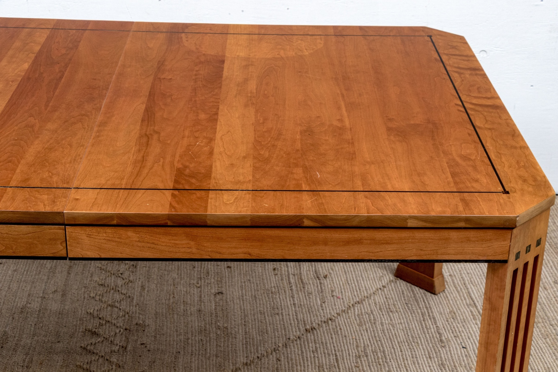 A high quality Stickley extension dining table with great mission and arts and crafts appeal, well constructed in richly hued warm-toned medium brown wood with a cut-corner rectangular table top detailed by a dark brown inlaid border. The table is supported by four angled rectangular legs with dark square inlays heralding pierced rails and block feet. Includes two extension leaves in a single felt bag.